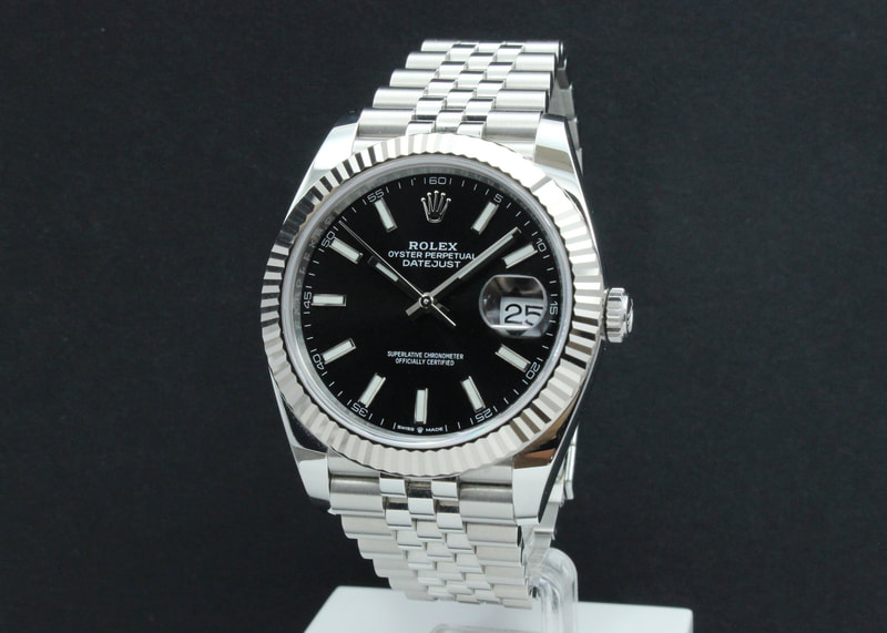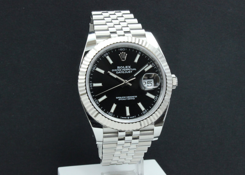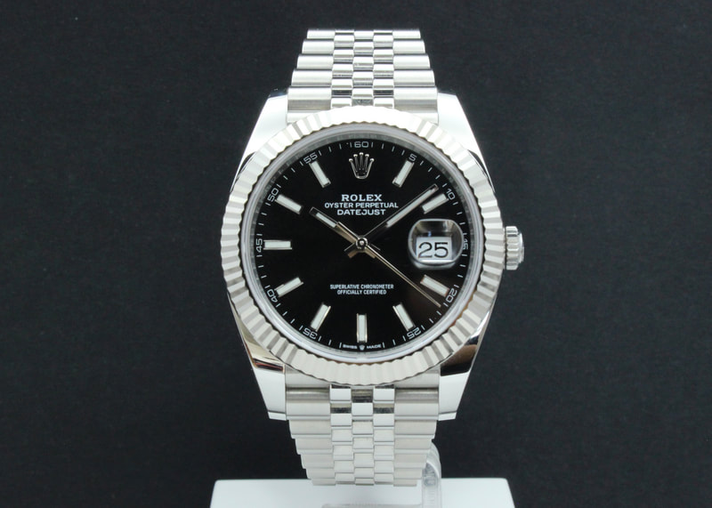 Huippukuntoinen Rolex Datejust 41 126334 bright black taululla, valkokultaisella fluted bezelillä ja jubileerannekkeella. Kello on ostettu uutena marraskuussa 2023, joten valmistajan takuu voimassa 11/2028 asti. Mukaan boksit, manuaalit, hangtagit ja takuukortti.
