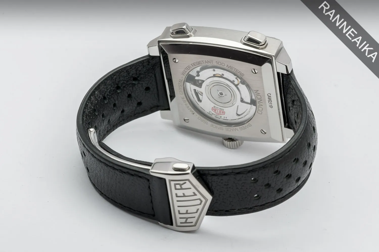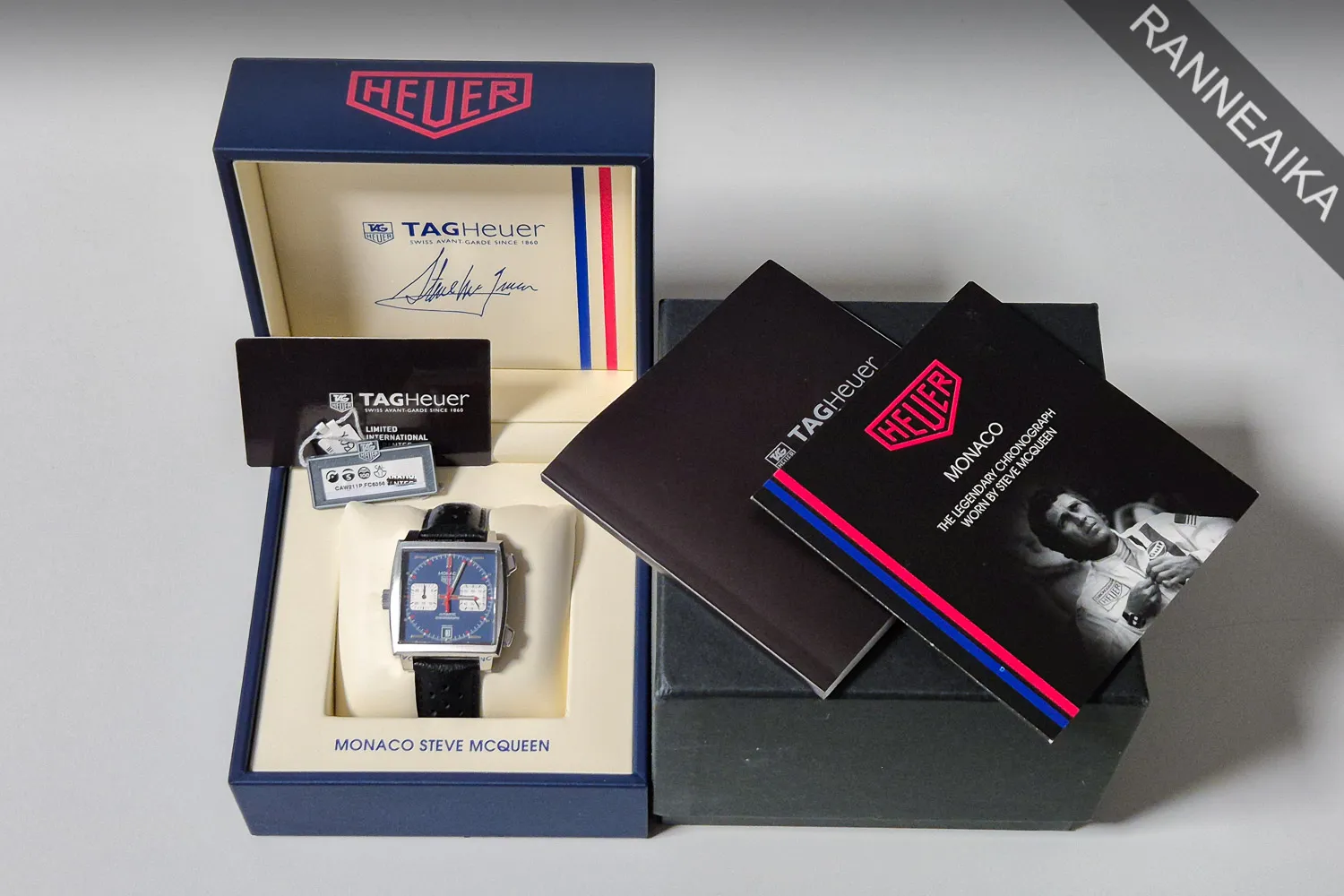 Haluttu sinisellä taululla sekä Calibre 11 -automaattikoneistolla varustettu Monaco, joka tunnetaan myös “Steve McQueen” -lempinimellä. Teräskuori, linkkulukollinen nahkaranneke ja safiirilasit molemmin puolin. Takaa voi ihailla upeasti koristeltua Calibre 11 -automaattikoneistoa, jonka ominaispiirteenä on kellon vasemmalle puolelle sijoittuva nuppi ja puolestaan oikealle puolelle sijoittuvat kronopainikkeet. Kellon alkuperäiset suomipaperit on päivätty 09/2016 ja se käy erinomaisin käyntiarvoin. Täysi setti sisältäen molemmat laatikot sekä kaikki alkuperäiset paperit.