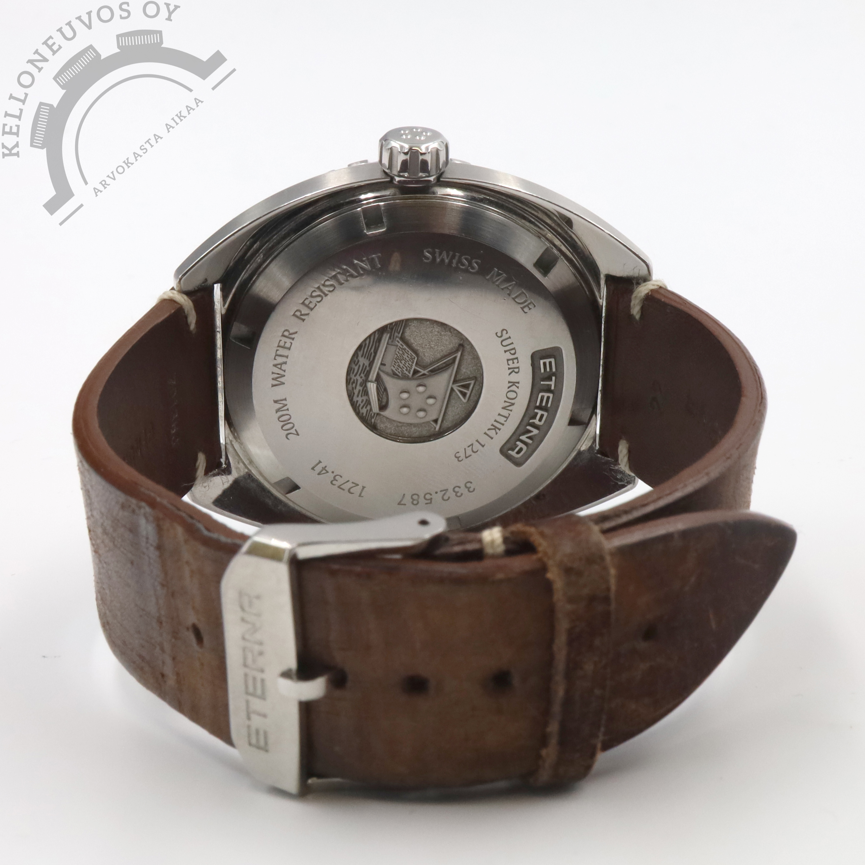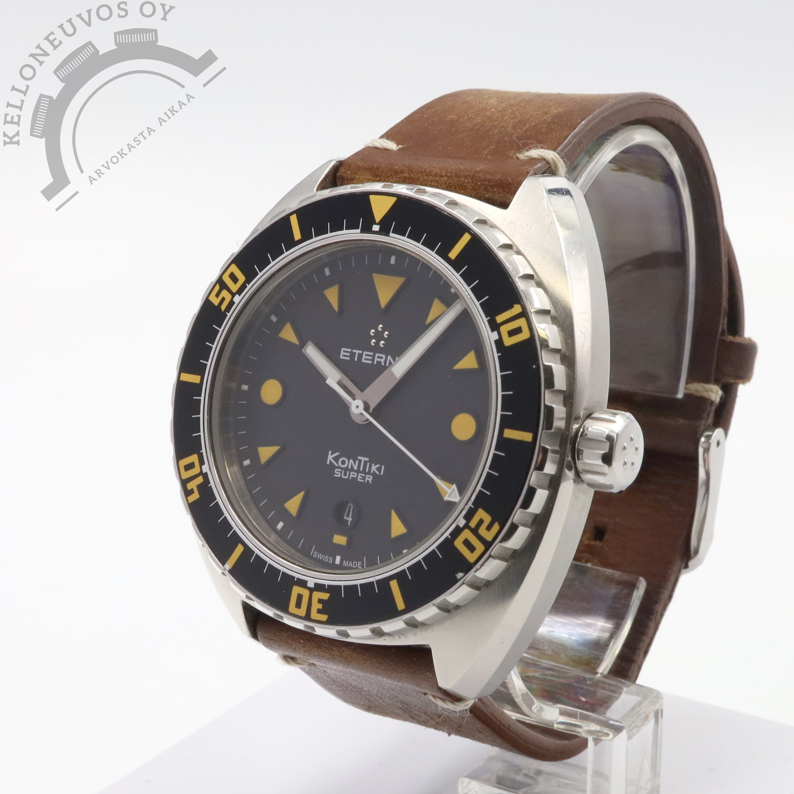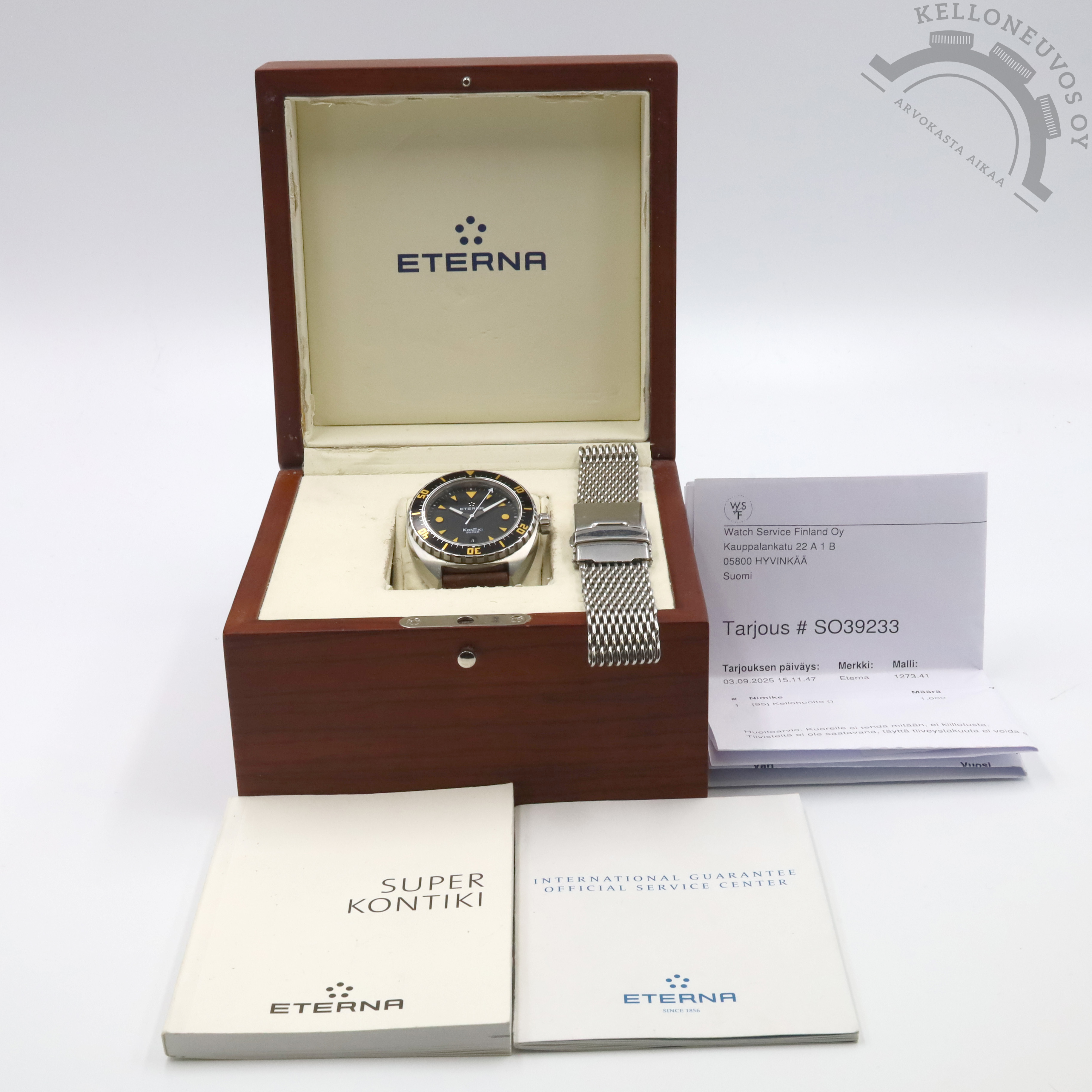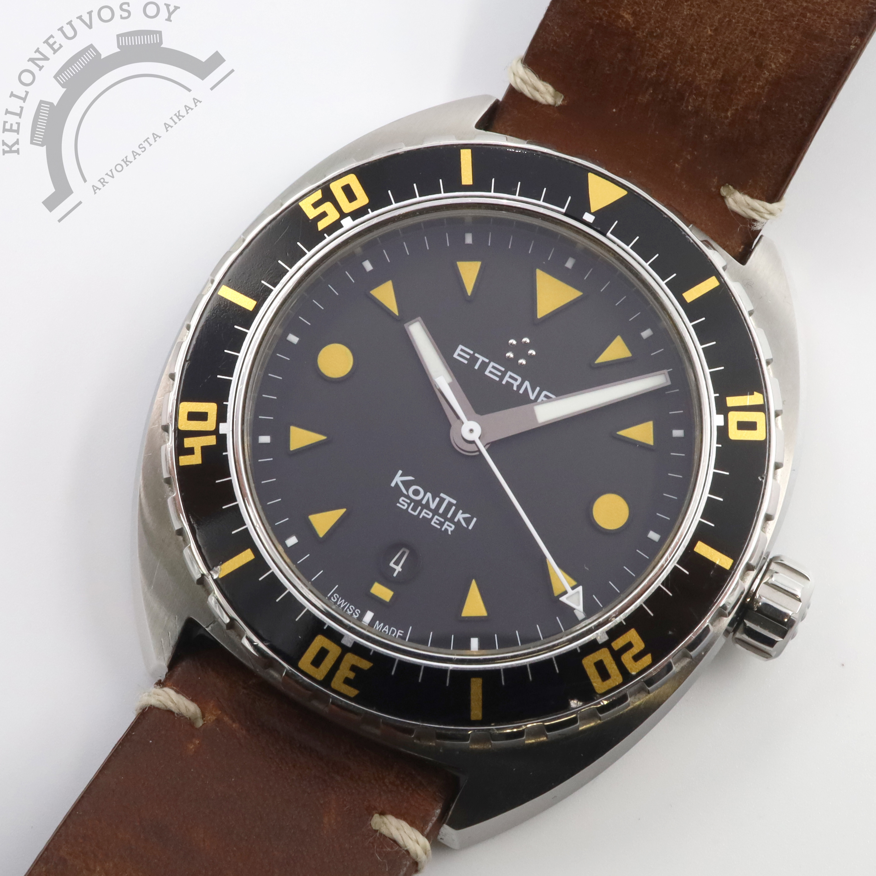 Tarjolle hiljattain huollettu Super Kontiki. Selkeälukuisella mustalla taululla jossa päivyri sekä näyttävät oranssit yksityiskohdat. Teräksinen kuori mustalla sukeltajan kehällä. Rannekkeina alkuperäinen ruskea nahka omalla soljella sekä Geckota mesh. Kelloa seuraa laatikko, manuaali, takuuvihko sekä dokumentit huollosta (WSF). Kello on huollettu 9/2025 ja sen paperit on päivätty kotimaisen jälleenmyyjän toimesta 11/2017.
