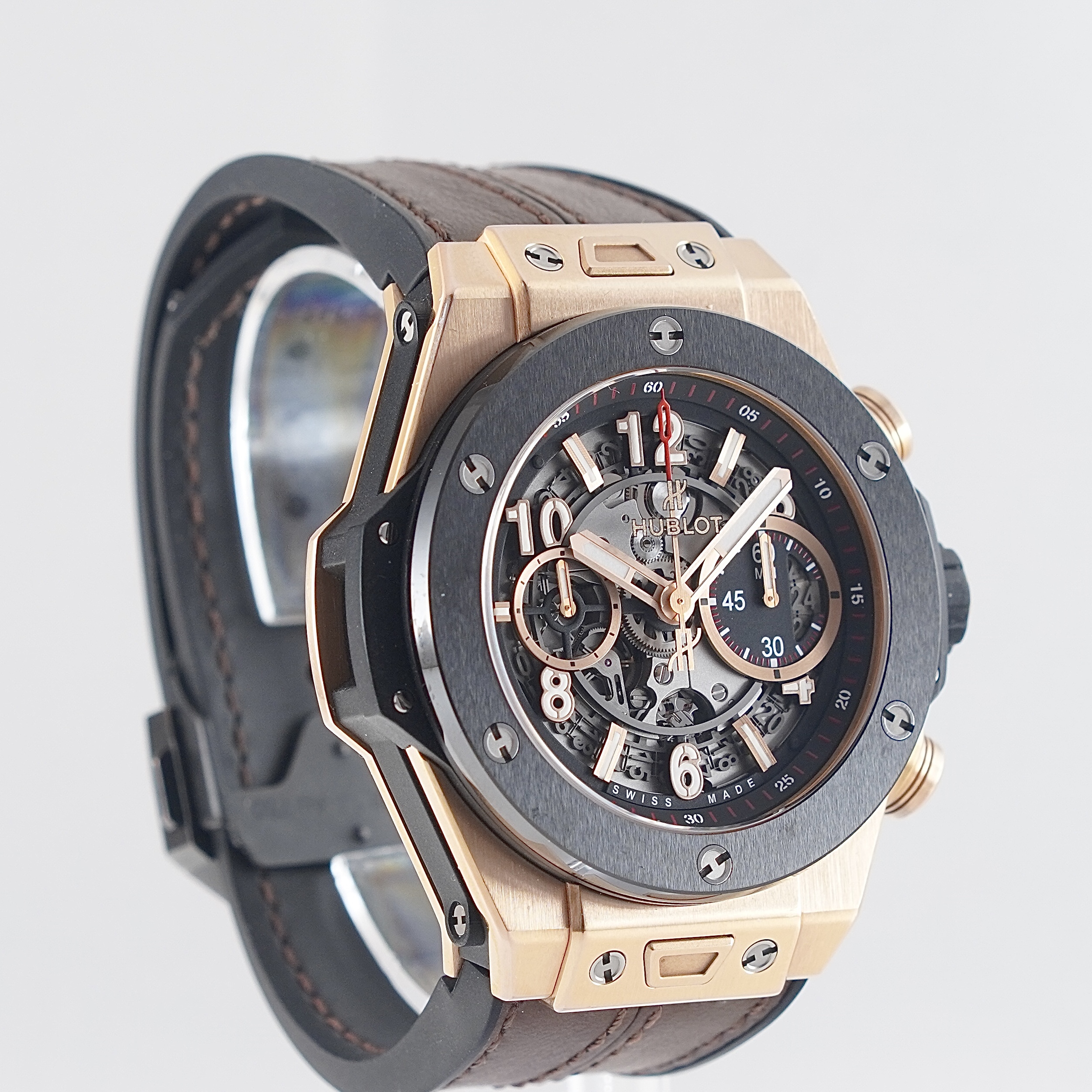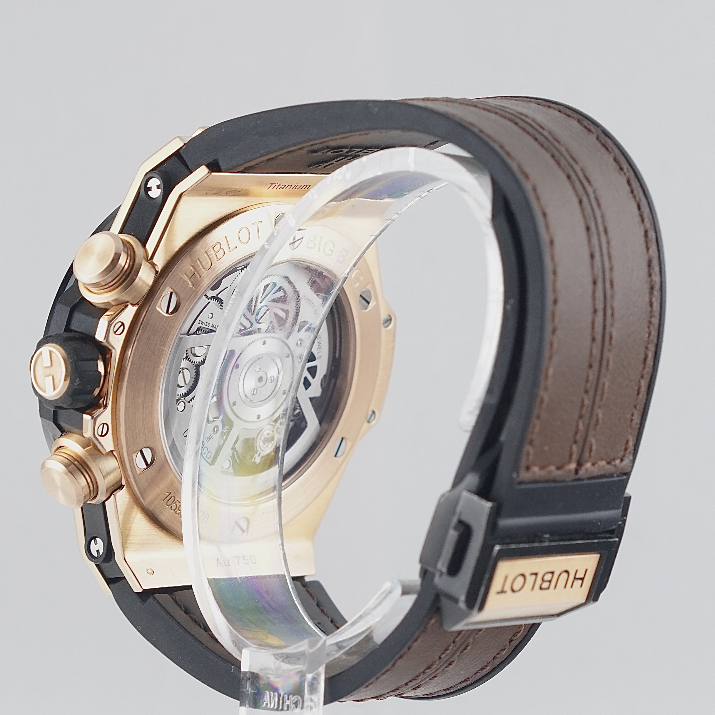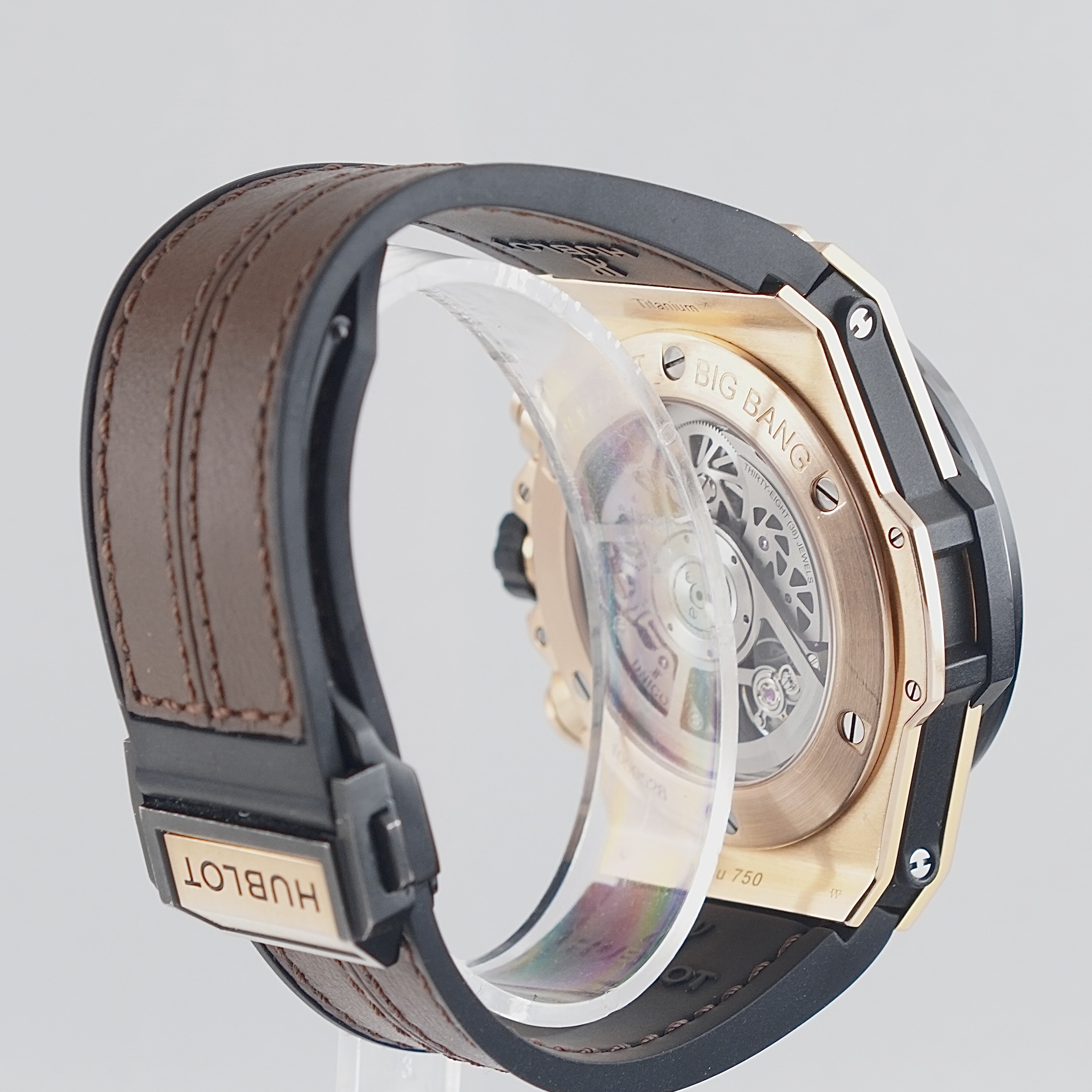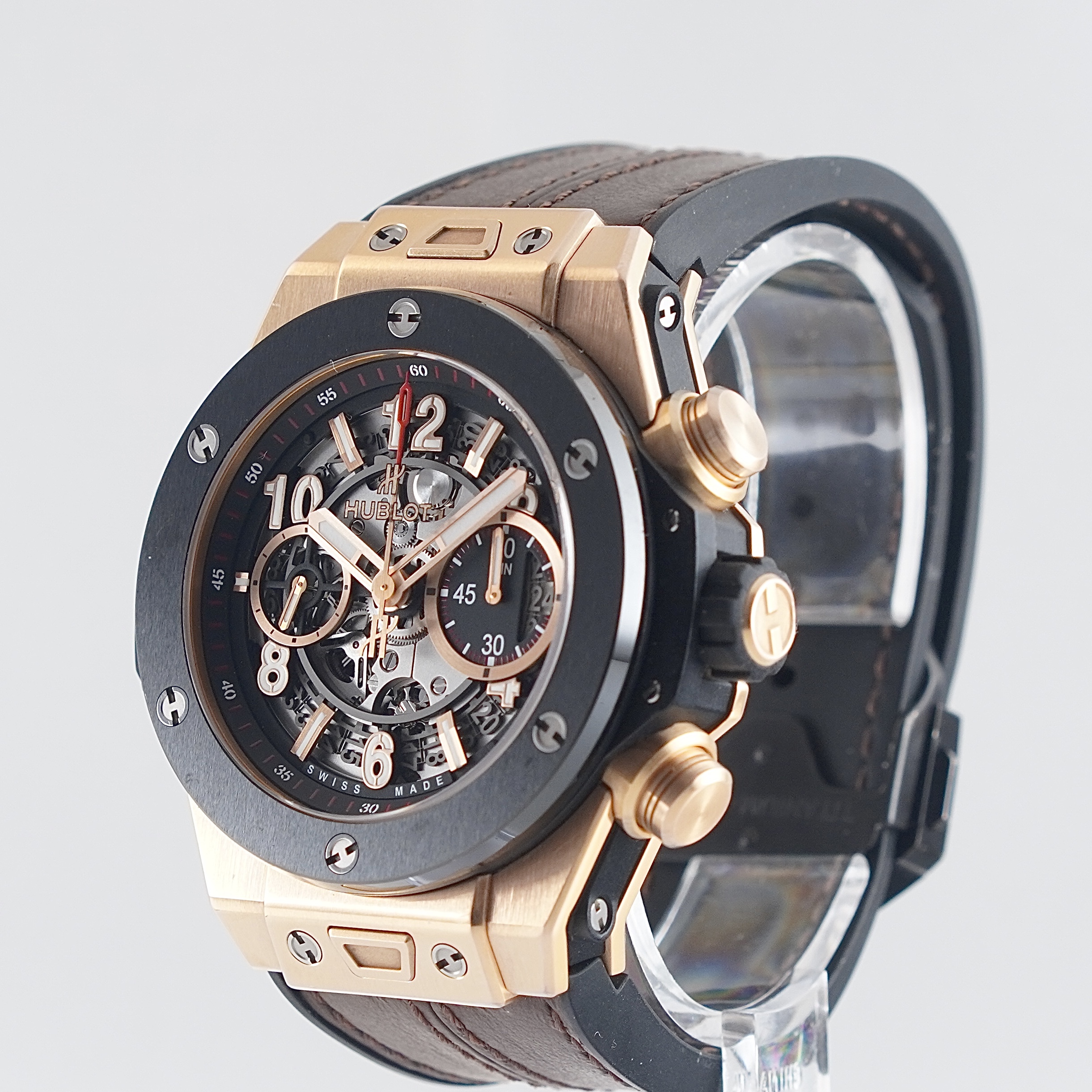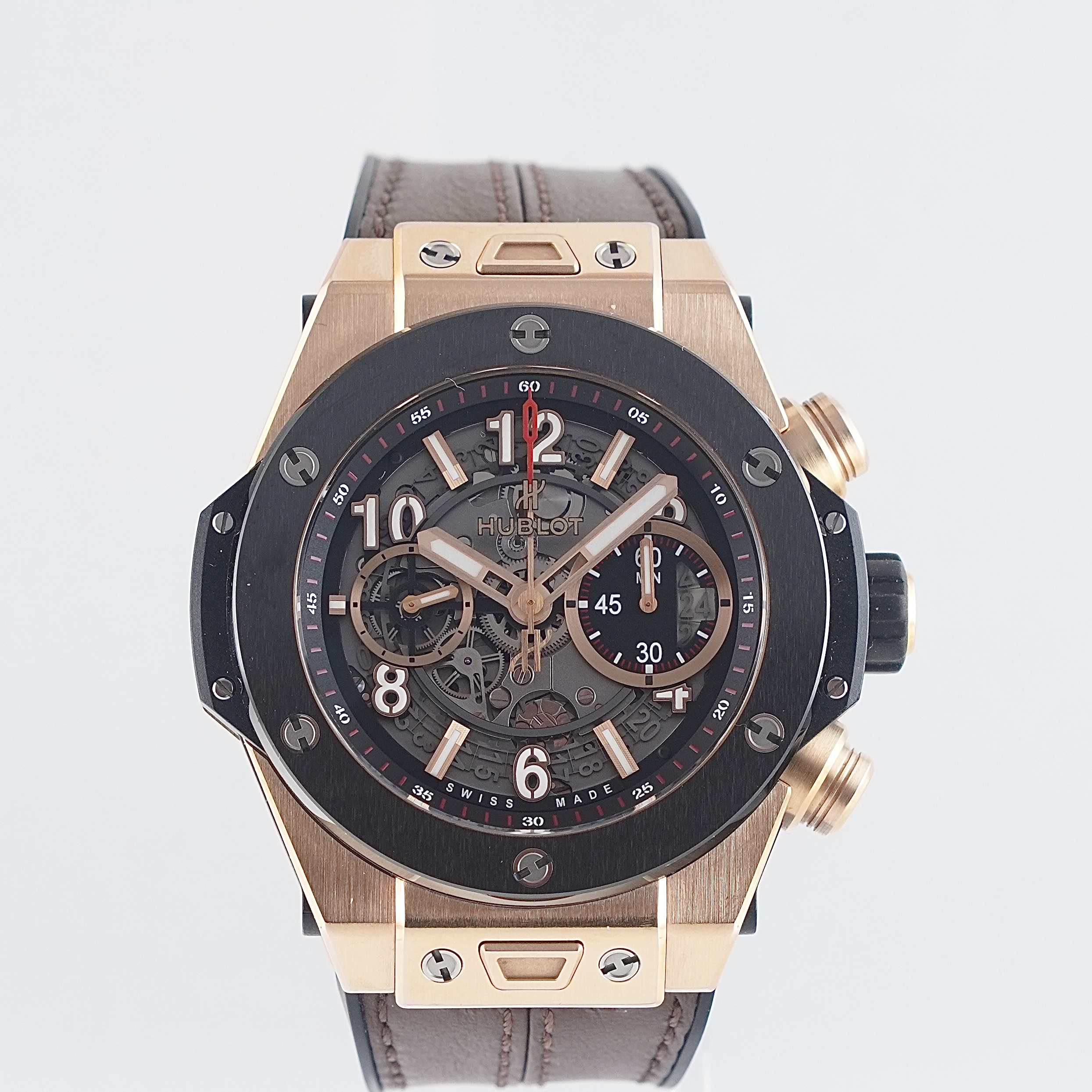 Tämä pitää nähdä livenä! Upea kultainen Hublot, jossa näköä ja koko riittävästi. Fullset, takuukortti leimattu 2016. King gold koppa, keraaminen kehä, flyback-ajanottotoiminto, safiirilasikkeet edessä ja takana sekä upein yksityiskohdin viimeistelty skeleton-taulu. Rannekkeen pikakiinnitys. Rannetuntuma on vertaansa vailla, kuten Hubloteilla yleensäkin. Ovh. 44800€.