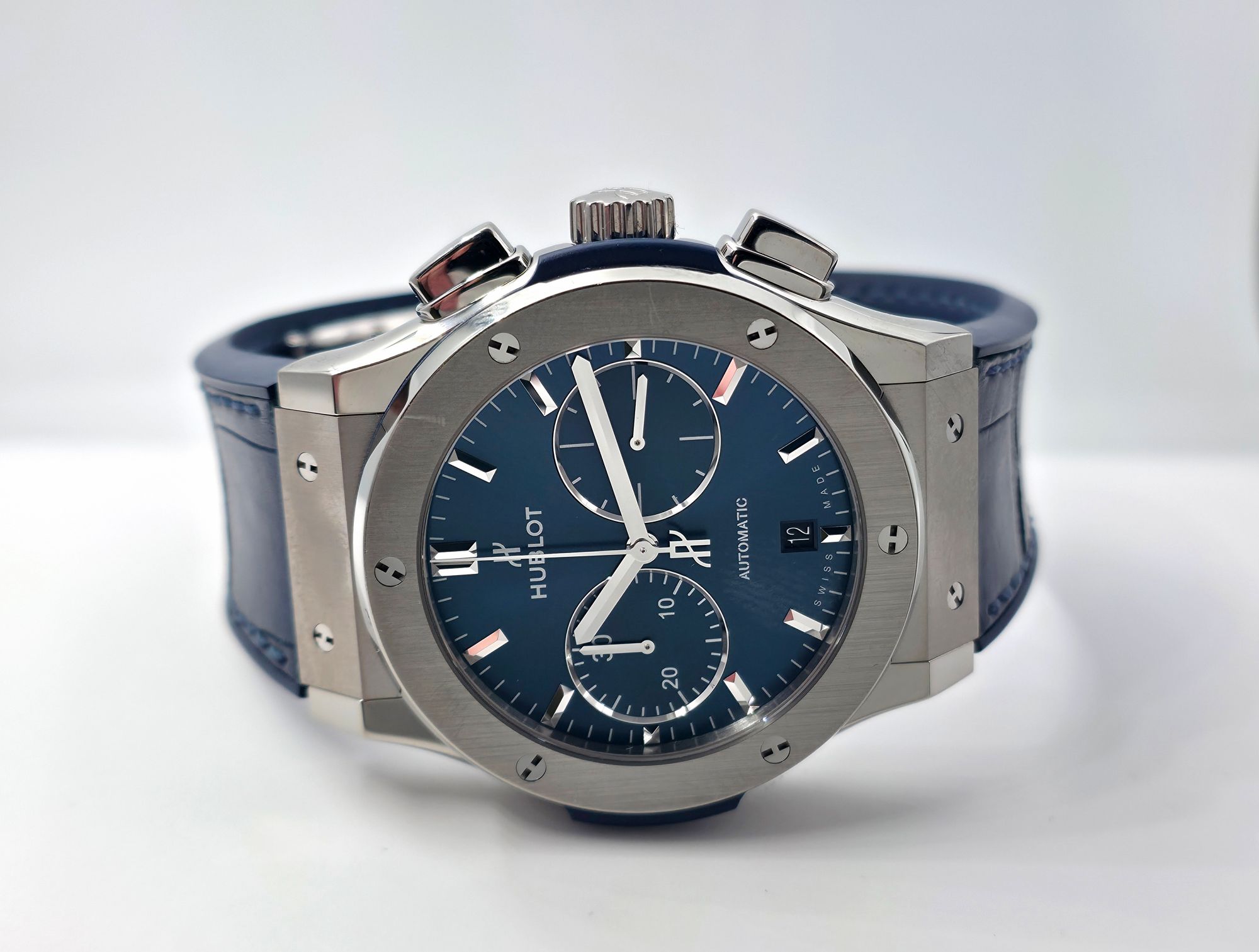 Hublot Classic Fusion Chronograph Titanium Blue 45mm. Minimalistinen mutta sporttinen design yhdistettynä kronografiin tekee tästä modernin ja monikäyttöisen kokonaisuuden. Kevyt titaanikuori tekee kellosta miellyttävän käyttää 45mm koosta huolimatta. Sininen sunburst-taulu ja nahkapäällysteinen kumiranneke tuo kokonaisuuteen mukavasti näyttävyyttä. Fullset (E-warranty aktivoitu 10/2021) Siistissä kunnossa. Ovh. 12 000e