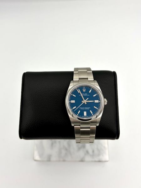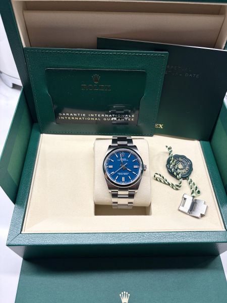 Uutta vastaavassa kunnossa oleva Rolex Oyster Perpetual ref 126000 todella upealla uudella Med Blue taululla. Taulun väriä on vaikea saada kuviin, taulun väri on hyvin lähellä "Petrooli" sävyä. Uutuus taulu! Kellossa koneistona toimii calibre 3230 70h käyntivaralla. Kellon EU-paperit on päivätty 2026. Kellon mukana tulee kaikki laatikot sekä paperit, complete set. Rolexin viiden vuoden tehdastakuu on voimassa 2031 asti. Uusi sininen taulu erottuu edukseen, nyt heti valmiina uuteen kotiin!
