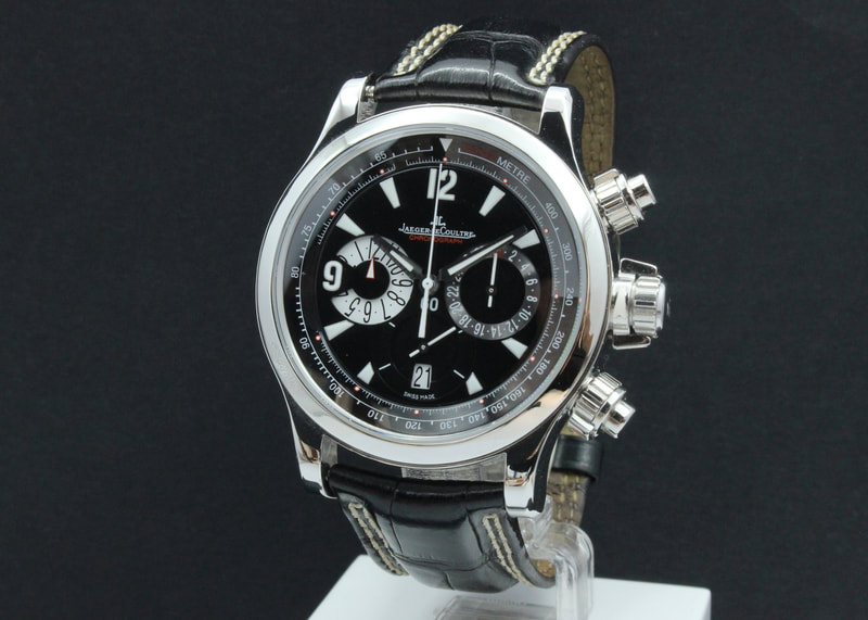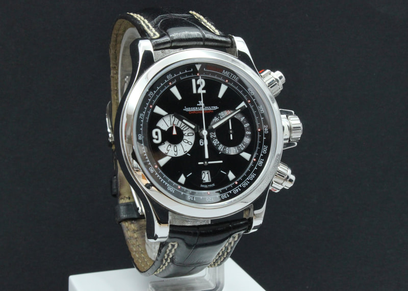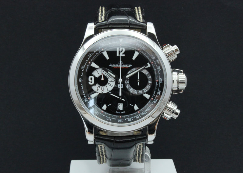 Hieno Jaeger-LeCoultre Master Compressor hienolla mustalla taululla ja takapohjassa punakultainen Master Compressor medaljonki sekä nupit ja painimet bajonettilukituksella. Kello on täyshuollettu tehtaalla elokuussa 2024, ja se käy erinomaisesti. Koneistona JLC:n oma automaatti 751 n. 65h käyntivaralla. Ranneke menee vielä hetken käytössä, kiinni merkin oma linkkulukko. Mukaan huoltoboksit- ja todistus 2024.