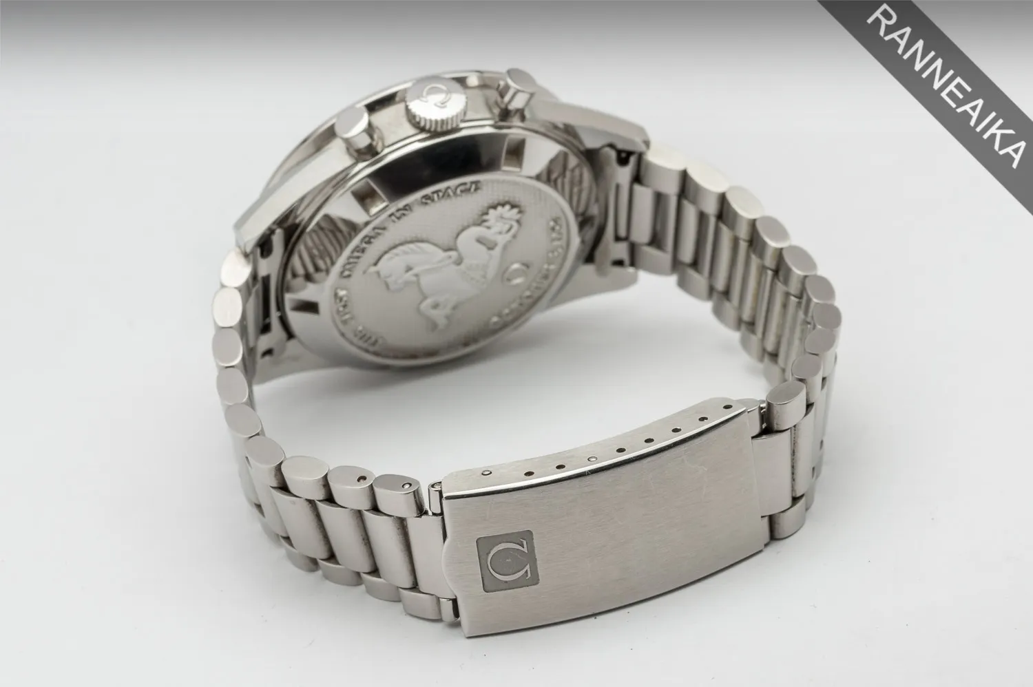 Erittäin kaunis nahka- ja teräsrannekkeilla sekä safiirilasilla varustettu ”FOIS”-akronyymilläkin tunnettu First Omega in Space -Moonwatch. Tämä numeroitu FOIS-mallisarja on saanut inspiraationsa astronautti Wally Shirran vuonna 1962 käyttämästä Speedmasterista, jota hän piti maata kiertäessään Sigma 7 -tehtävän aikana. Tämän mallin kuori on symmetrinen ja hieman normaalia Moonwatchia kapeampi sen ohuempien lugien, sekä puuttuvien kruunusuojien ansiosta. Alkuperäisellä vuoden 1962 merihevosfiguurilla koristellun teräksisen takakannen alla tikittää Omega 1861 -manuaalikaliiperi. Kellon suomipaperit on päivätty 10/2020 ja se käy erinomaisesti. Täysi setti – mukaan molemmat laatikot (+ nk. kauppiaan laatikko), käyttämätön alkuperäinen nahkaranneke, hang tag ja kaikki alkuperäiset paperit korttitaskuineen + erikseen ostettu Omegan alkuperäinen teräsranneke. Tästä todella tyylikäs keräilykello suoraan hyllystä!