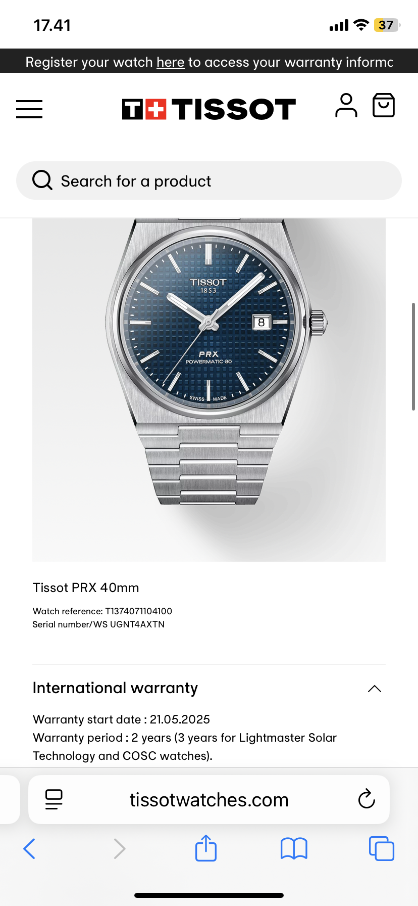 Malli T137.407.11.041.00 – 40 mm, navyblue tekstuuritaulu ja Powermatic 80 -automaattikoneisto, jonka käyntivara jopa 80 tuntia. Safiirilasi ja laadukas teräsranneke. Kello käy tarkasti ja toimii moitteetta.