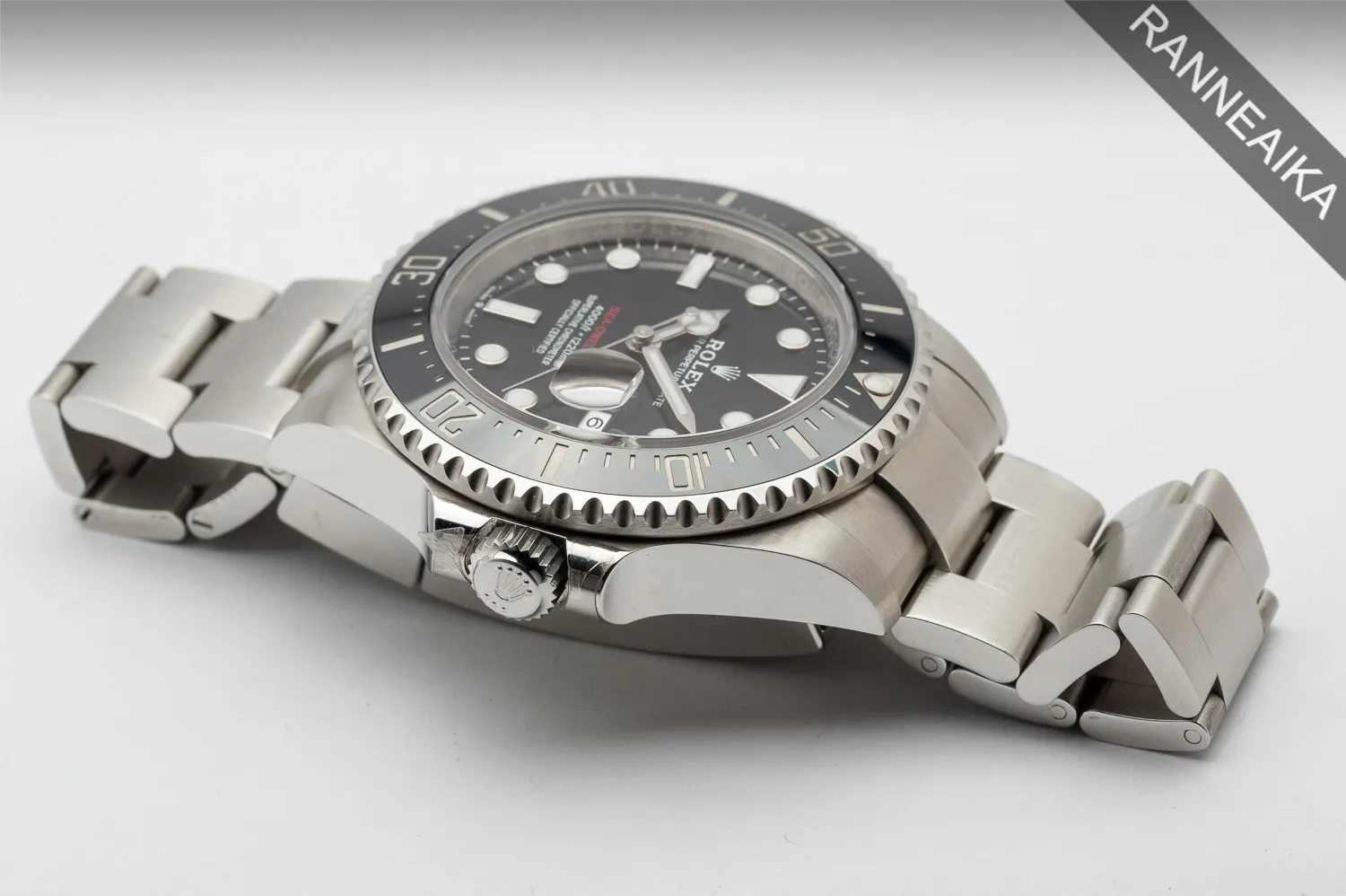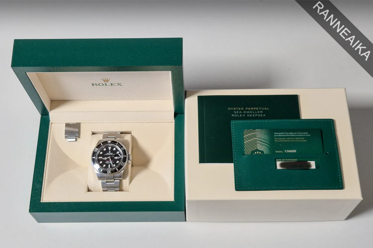 Näyttävä ja haluttu 43mm Sea-Dweller mustalla keraamisella kehällä, jonka vesitiiviysluokitus on peräti 1220m. Kellossa halkaisijaltaan 43-millinen teräskuori, joka tarjoaa mukavasti perusdivereita enemmän rannepreesensiä ja tästä mallista löytyvät myös muut oleelliset modernin diverin ominaisuudet kuten jo edellä mainittu keraaminen kehä, sekä pituuden pikasäädöllä ja sukellusjatkolla varustettu umpipalaranneke. Kuoren sisällä tikittää tarkasti Rolex cal. 3235 -automaattikoneisto, jolle luvataan peräti 70h käyntivara. Kellon paperit on päivätty 09/2021 ja valmistajan takuu on voimassa 09/2026 asti. Kellon mukana tulee alkuperäinen takuukortti, korttitasku, käyttöopas sekä molemmat laatikot. Tämän mallin listahinta uutena on 14 400 EUR, tästä erittäin katu-uskottava diver sopivasti!