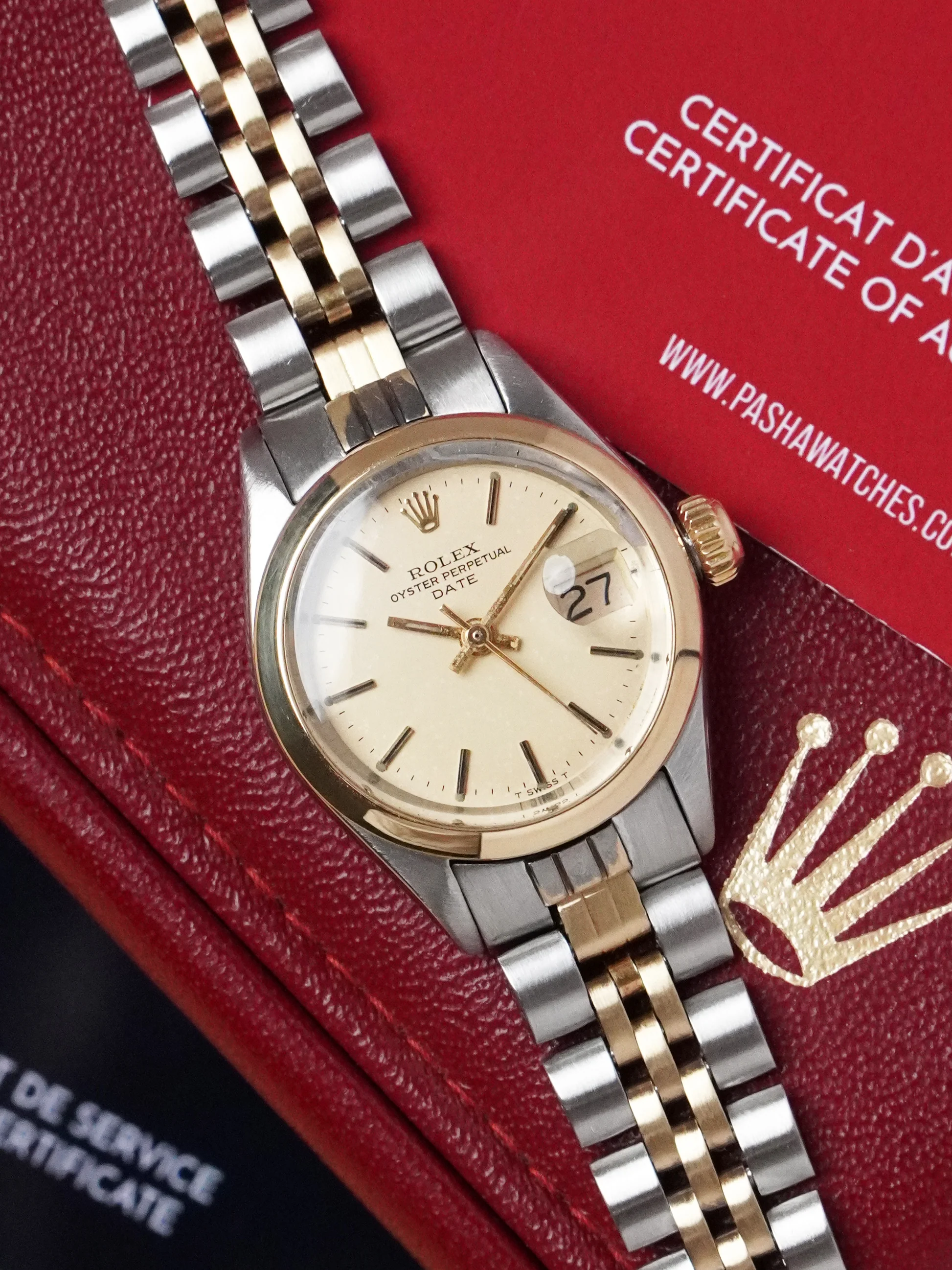 Oyster Perpetual Date Ref. 6916 on ajaton esimerkki vintage-Rolexin eleganssista ja edustaa 1960-luvun lopun ja 1970-luvun hienostunutta muotoilua. Klassisen 26 mm:n Oyster-kotelonsa, automaattisen Perpetual-koneistonsa ja lämpimän kaksisävyisen ulkonäkönsä ansiosta tämä malli ilmentää hillittyä ylellisyyttä, joka oli tyypillistä tuon ajan Rolex-juhlakelloille. Kello on erittäin hyvässä kunnossa ja säilyttää aidon vintage-luonteensa. Sen mukana toimitetaan alkuperäinen ulkolaatikko ja alkuperäinen Rolex-lahjapakkaus, jotka lisäävät haluttua aikakauden täydellisyyttä. Elegantti samppanjavärinen kellotaulu – vintage-kaksisävyisten Rolex-kellojen tunnusmerkki – on säilynyt kauniisti, ja sen painatus on terävä ja yleiskuva erinomainen. Kellossa on alkuperäinen kaksisävyinen Jubilee-rannekoru, joka sopii 17 cm:n ranteeseen. Tämän ikäiseltä kellolta odotetusti päätylenkkien kullatus on kulunut, mikä on yleinen ja historiallisesti aito yksityiskohta varhaisissa Jubilee-rannekkeissa. Mekaanisesti tämä 6916-malli on huollettu kokonaan talon omalla sertifioidulla kellosepällä 27.11.2025, mikä takaa täydellisen suorituskyvyn ja luotettavuuden. Kello toimii Rolexin Caliber 2030 -automaattikoneistolla, joka on tunnettu kestävyydestään ja sujuvasta toiminnastaan. Jotta voit olla täysin huoletta, kellon mukana toimitetaan PW-aitoustodistus, PW-huoltotodistus ja takuu. Kauniisti säilynyt, täysin huollettu vintage-Rolex alkuperäisine lisävarusteineen – viehättävä kaksisävyinen klassikko, joka on valmis seuraavalle vaativalle keräilijälle.