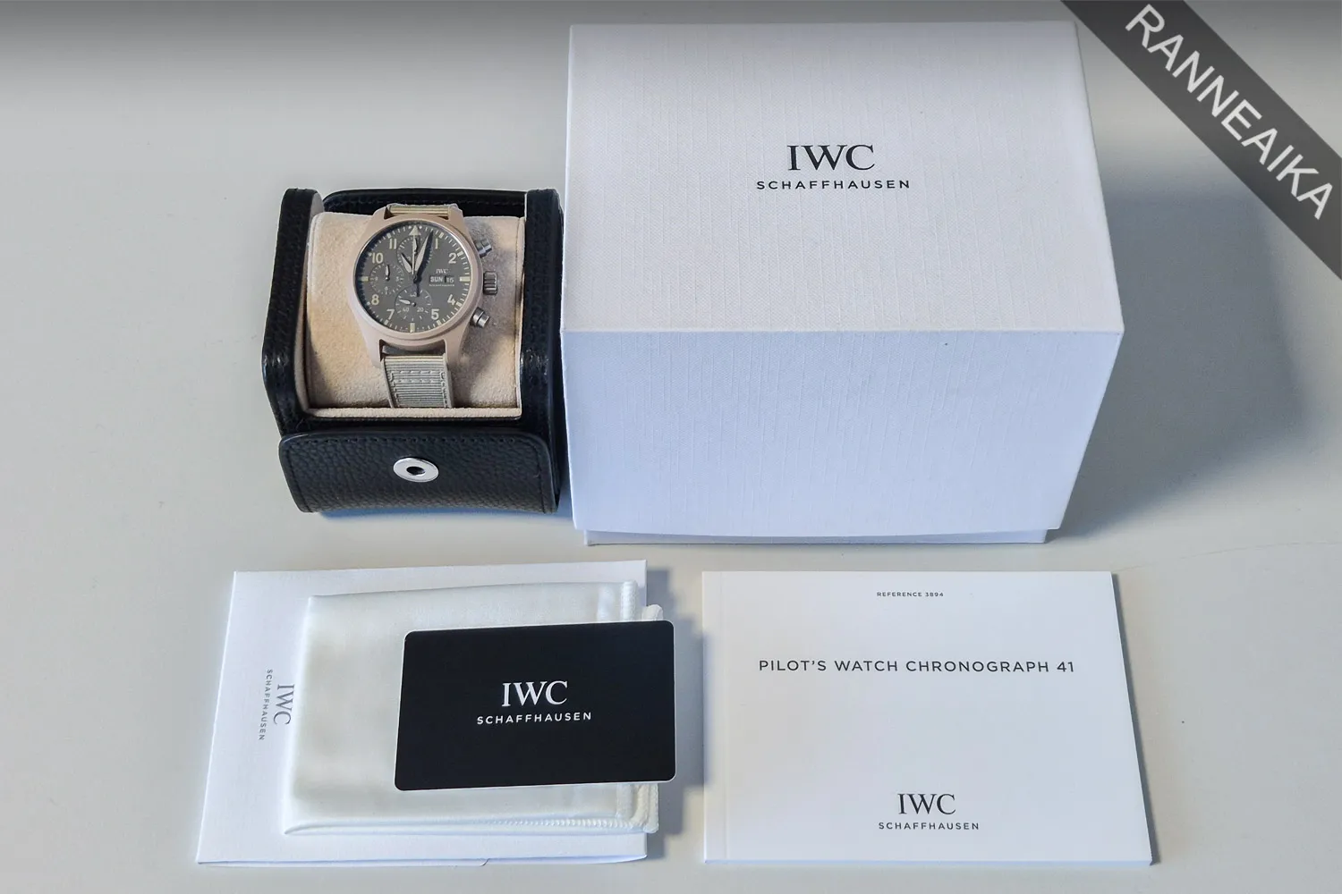 Uudenveroinen, erittäin näyttävä column wheel -kronografilla varustettu pilottikello. Erinomaiset mittasuhteet omaava hiekanruskea ”Mojave Desert” keraaminen kuori ja todella laadukas, alkuperäinen soljella varustettu kumi/tekstiiliranneke takaavat erinomaisen rannetuntuman. Todella selkeä ja kaunis ruskea taulu, jossa viikonpäivä- ja päivämääränäytöt klassisesti kello kolmessa. Etupuolella kestävä safiirilasi ja titaanisen takakannen suojassa tikittää tarkasti IWC 69380 -automaattikoneisto. Kellon paperit on päivätty 03/2024 ja valmistajan pitkä jatkotakuu on voimassa aina 03/2032 asti. Mukaan tulee kaikki alkuperäiset paperit, puhdistusliina sekä molemmat laatikot. Tämän mallin suositushinta uutena on peräti 13 300 EUR, tästä todella tyylikäs ja monipuolinen IWC edullisesti!