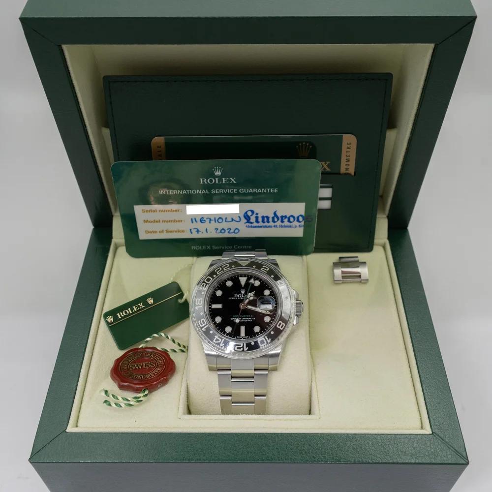 Hyväkuntoinen ja haluttu GMT-Master II Caliber 3186-automaattikoneistolla, jossa 48h käyntivara. Kellossa on musta keraaminen bezel. Kattava full set, Suomi-kello. Mukaan boksit, ulkopahvi, molemmat hang tagit, bezel suoja, manuaalit, takuukortti, huollon takuukortti ja huoltodokumentti. Kello on ostettu uutena Lindroosilta 3/2016 ja se on huollettu Lindroosilla 1/2020. Kellon käyntiarvot ovat erinomaiset. Alkuperäisessä rannekkeessa on täydet linkit ja näppärä Rolexin Easy-link -pikasäätö.