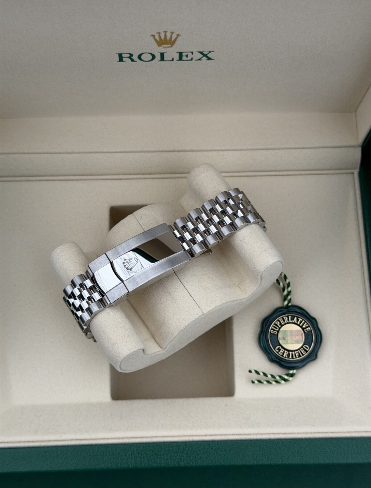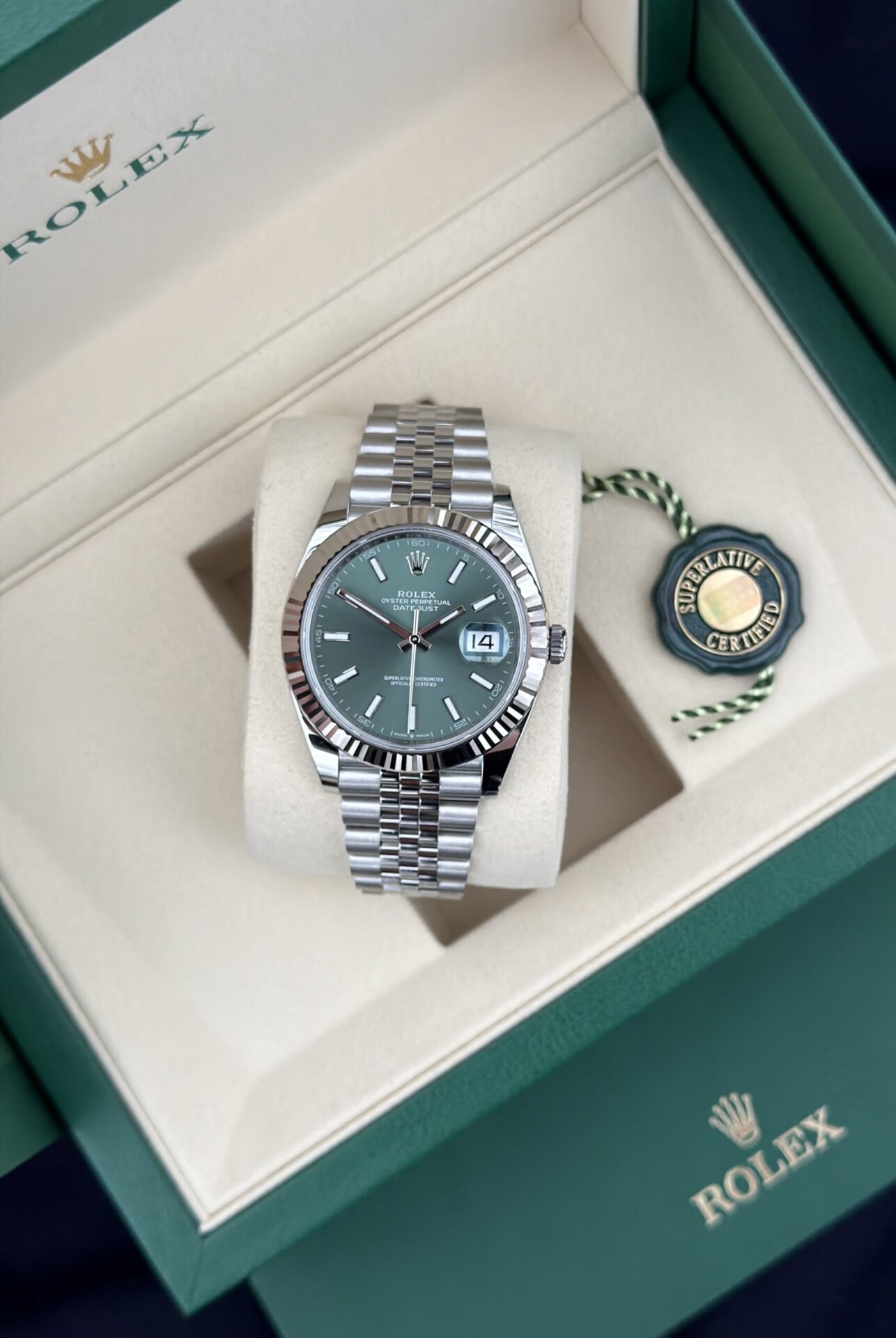Käyttämätön Rolex Datejust 41 mint green taululla (01/2026). Upea mintun vihreä taulu, valkokultainen fluted-kehä sekä ajaton jubilee ranneke muodostavat tasapainoisen, arvostetun ja halutun kokonaisuuden. Datejust on yksi Rolexin tunnetuimmista ja halutuimmista malleista, yhdistäen urheilullisen käytettävyyden ja hienostuneen tyylikkyyden.