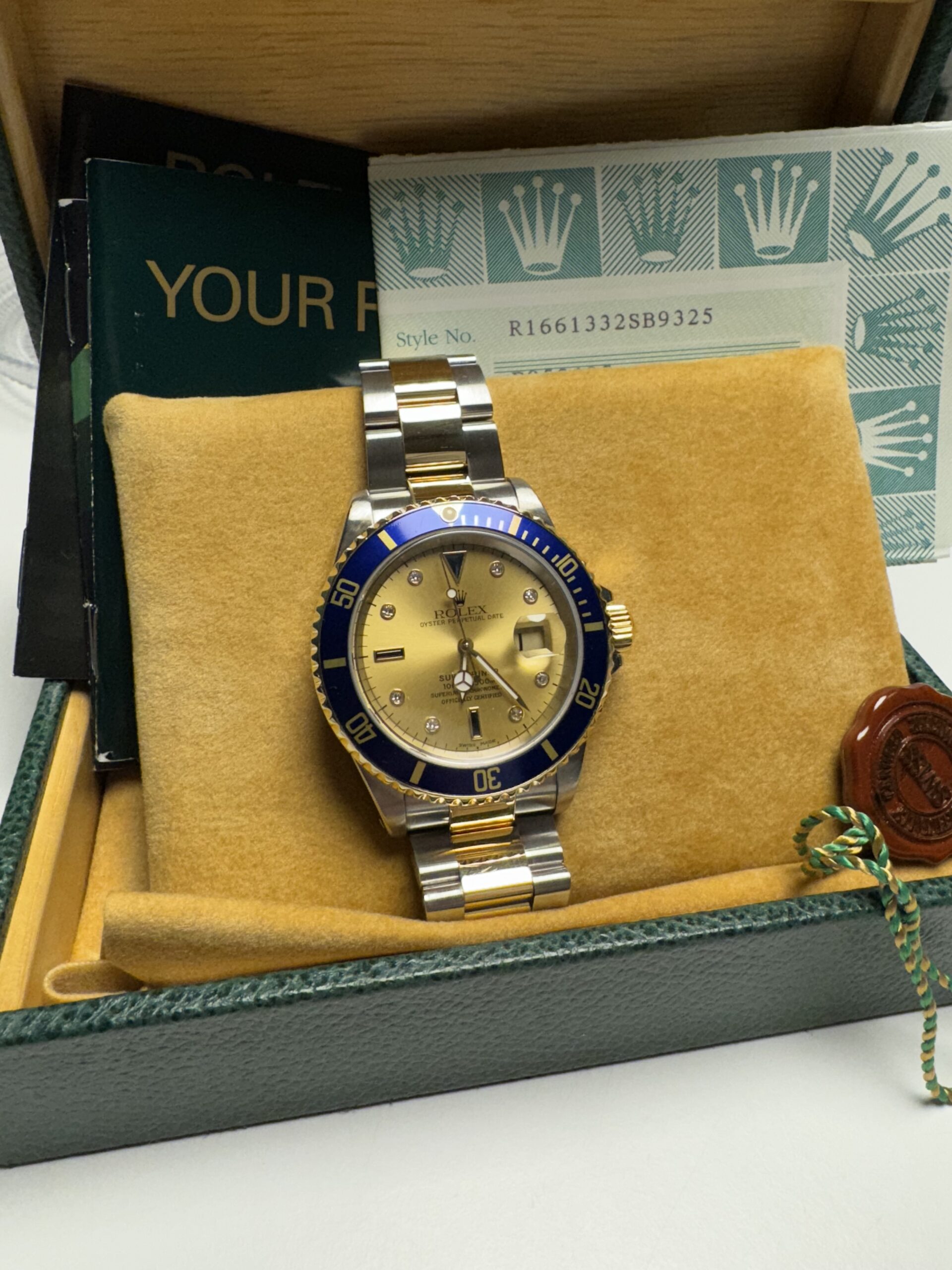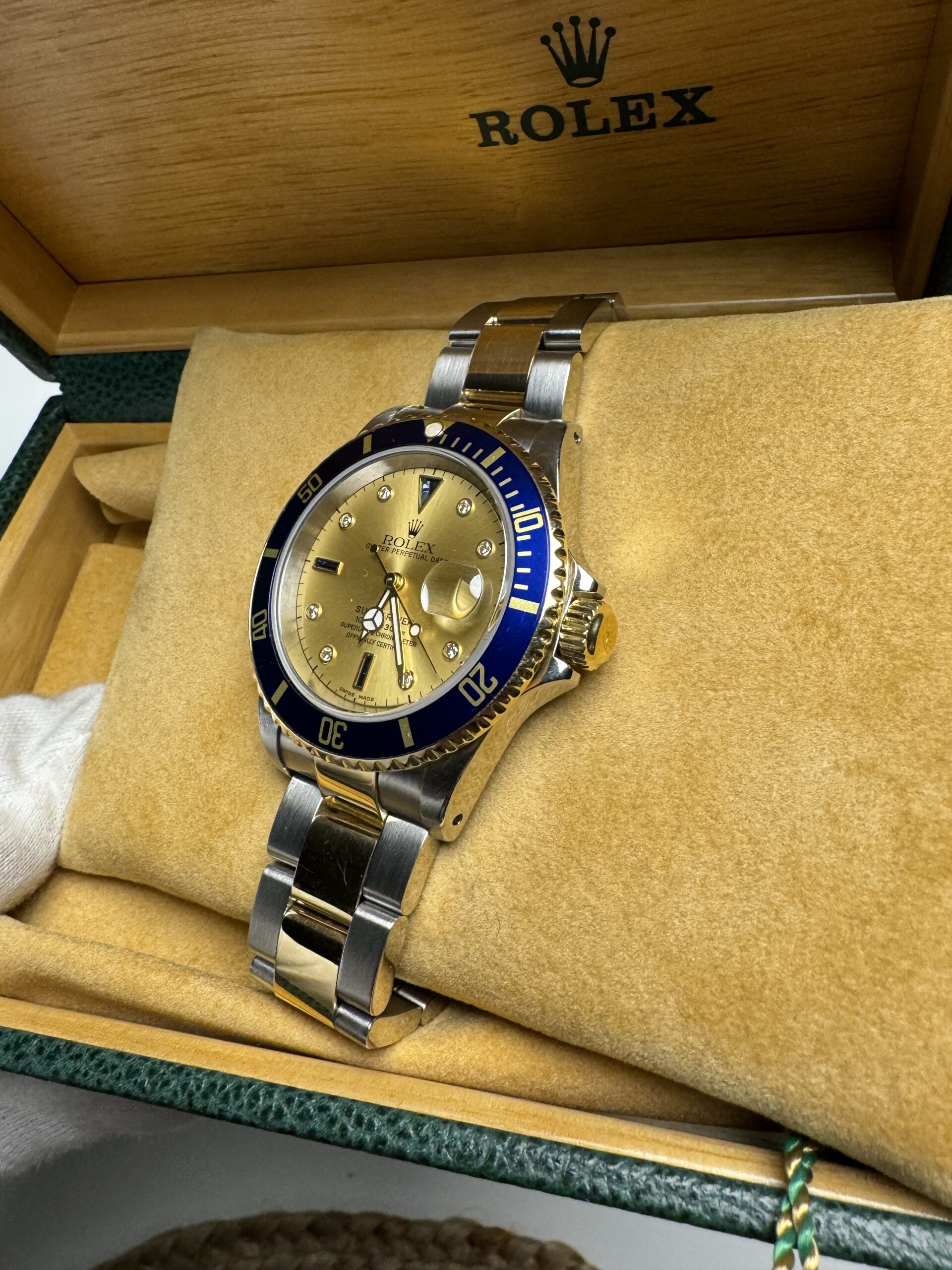 Rolex Submariner Date ref.16613 Full set, huikealla shampanja serti-taululla.