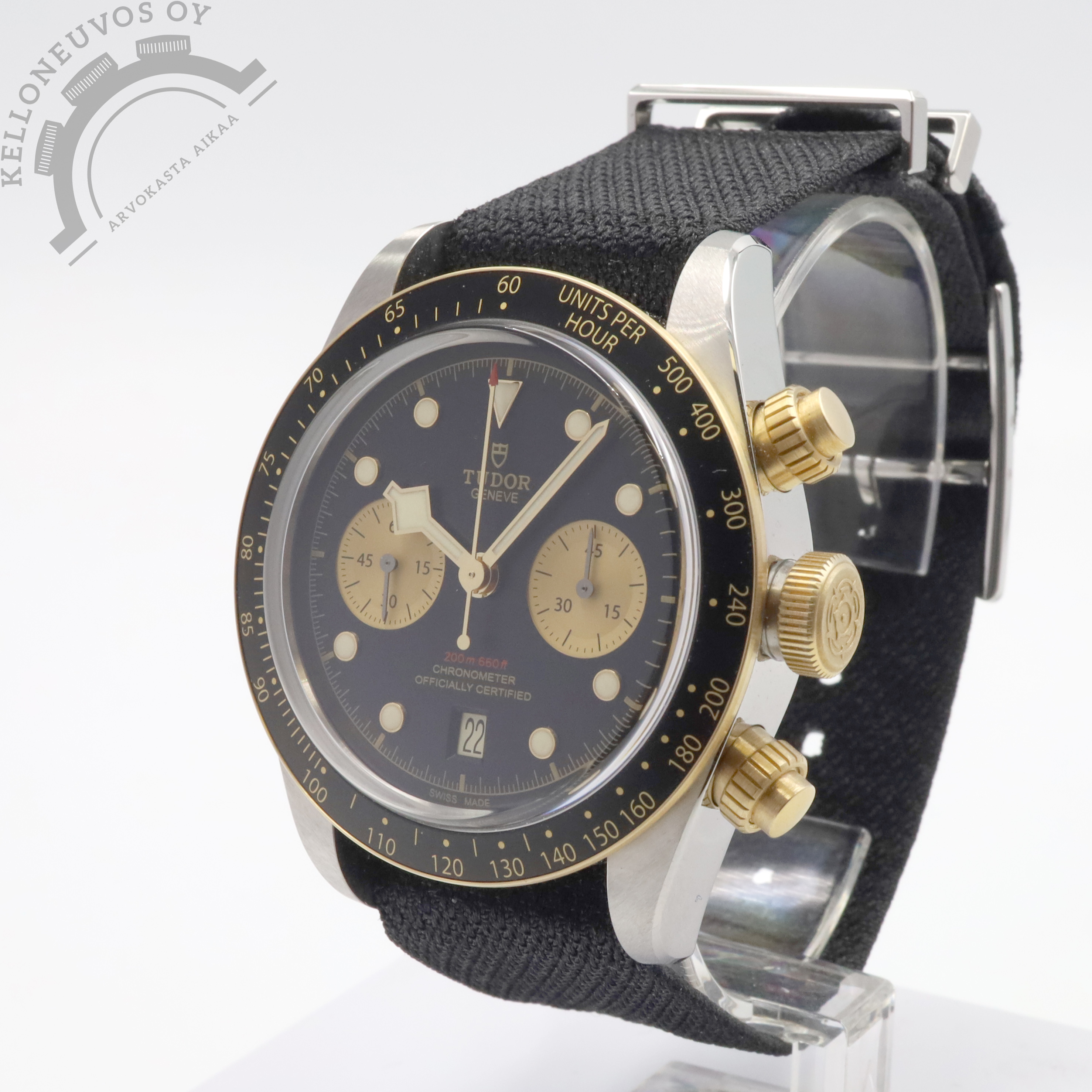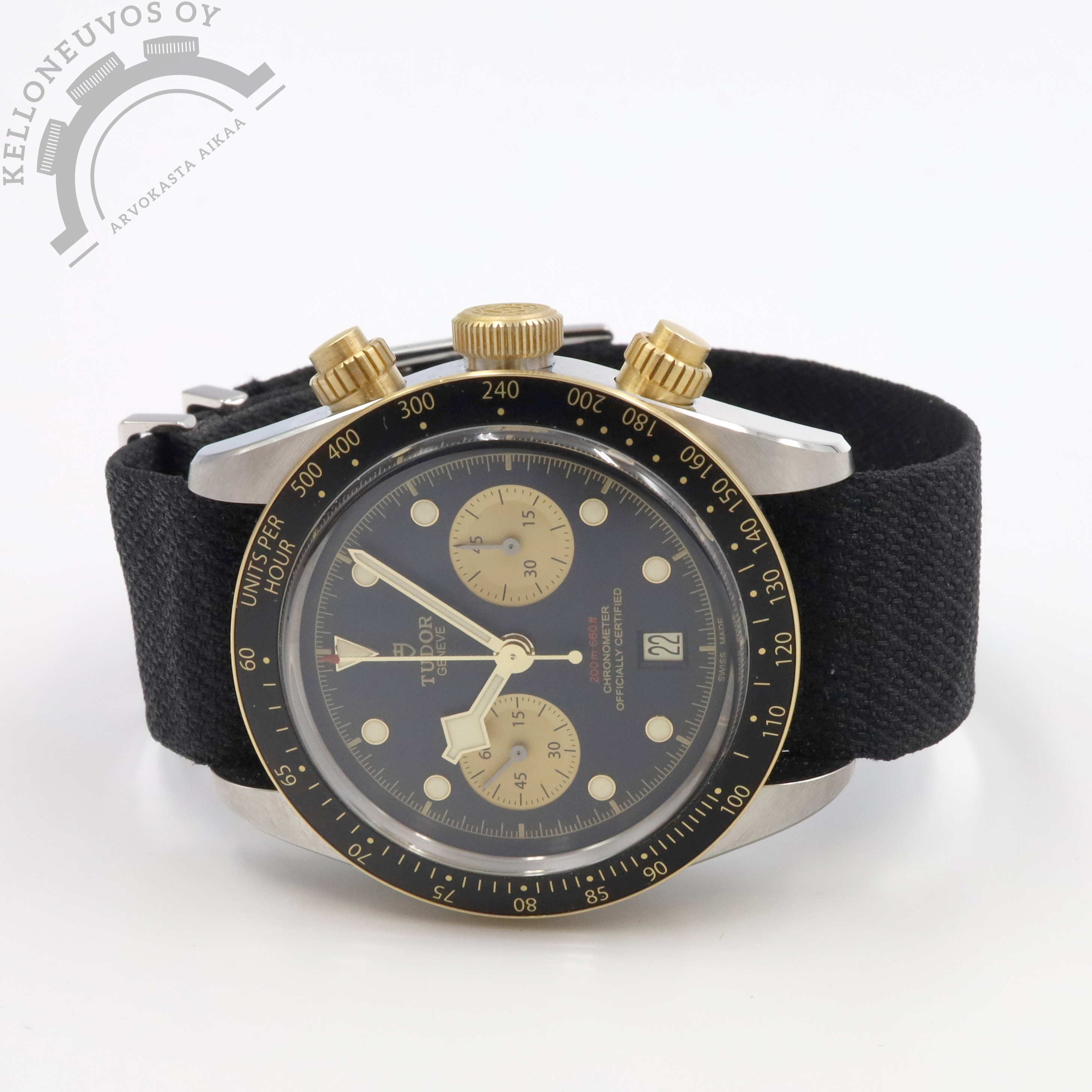 Tarjolle upeassa kunnossa sekä tuoreilla papereilla varustettu Tudor BB Chrono S&G. Selkeälukuisella mustalla taululla jossa ajanotto, pikkusekunnit sekä päivyri aseteltuna kello kuuden kohdalle. Lisäksi taulusta löytyy näyttävät kultaiset pikkutaulu sekä kultaiset indeksirenkaat ja osoittimet. Teräksinen kuori jossa kultaa oleva bezel sekä nupit. Kokonaisuuden kruunaa laadukas musta kangasranneke omalla soljella jotka takaavat kellolle loistavan ranneistuvuuden. Koneistona toimii Tudor MT5813 -automaatti jolle luvataan 70h käyntivara. Full set, kellon takuukortti on päivätty 10/2025. Kellon ovh. 8 140e.