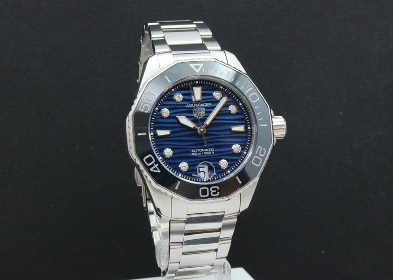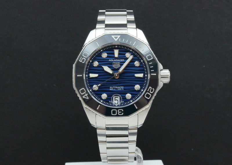 Hienokuntoinen Tag Heuer Aquaracer Lady kivassa 36mm koossa. Kellossa sininen keraaminen kehä, sekä aaltokuvioitu kellotaulu, jossa 8 kpl Top Wesselton (0,078carat) timantteja. Kello on ostettu uutena maaliskuussa 2023 ja sen calibre 5 automaattikoneisto käy loistavasti. Mukaan lisäpaloja, timanttitodistus sekä takuukortti. Ovh. 4 400€.