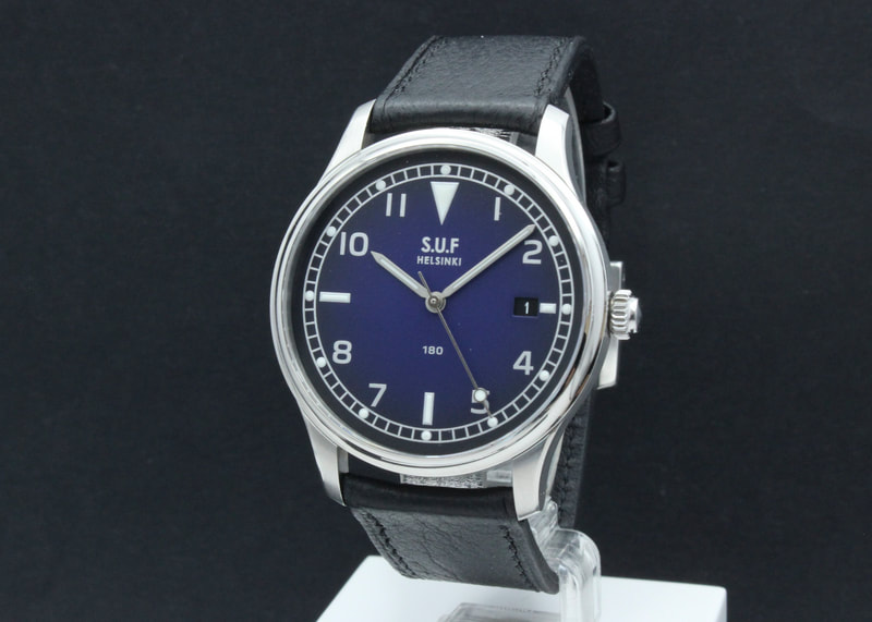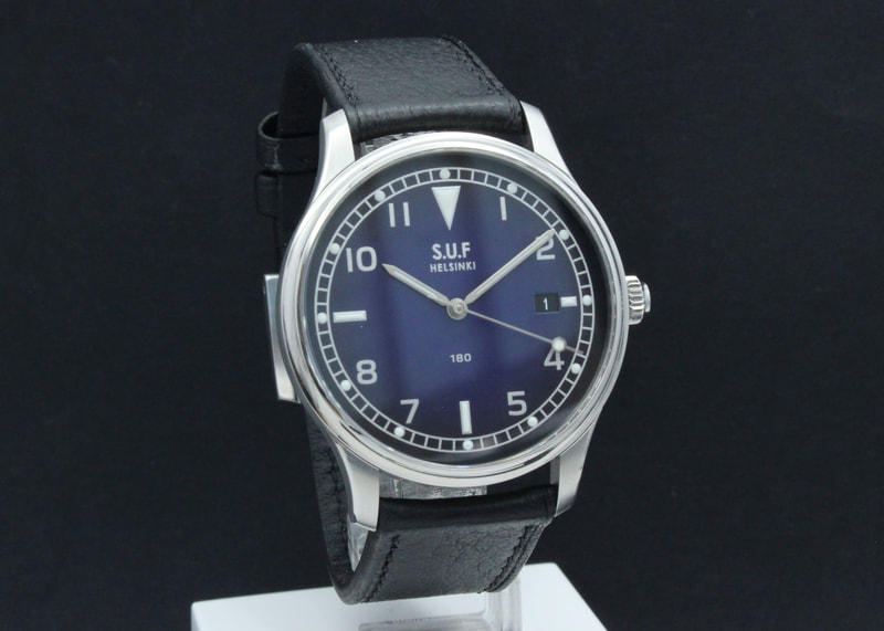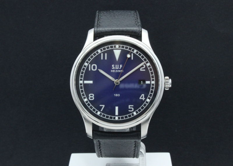 Hienokuntoinen loppuunmyyty S.U.F Helsinki 180B Mustikka, joka ostettu uutena elokuussa 2022. Kello käy hienosti ja mukaan tulee nahkakääre ja takuukortti.