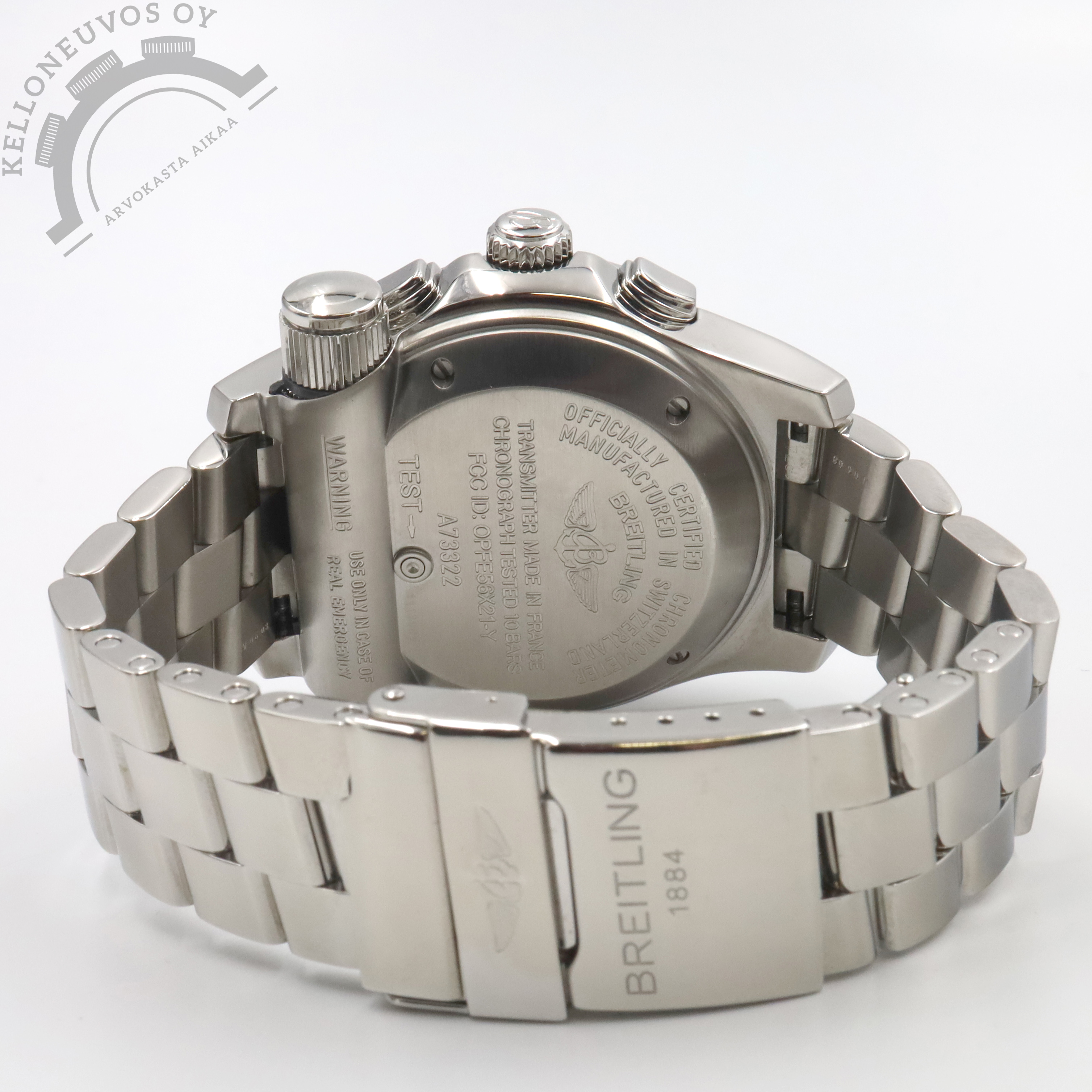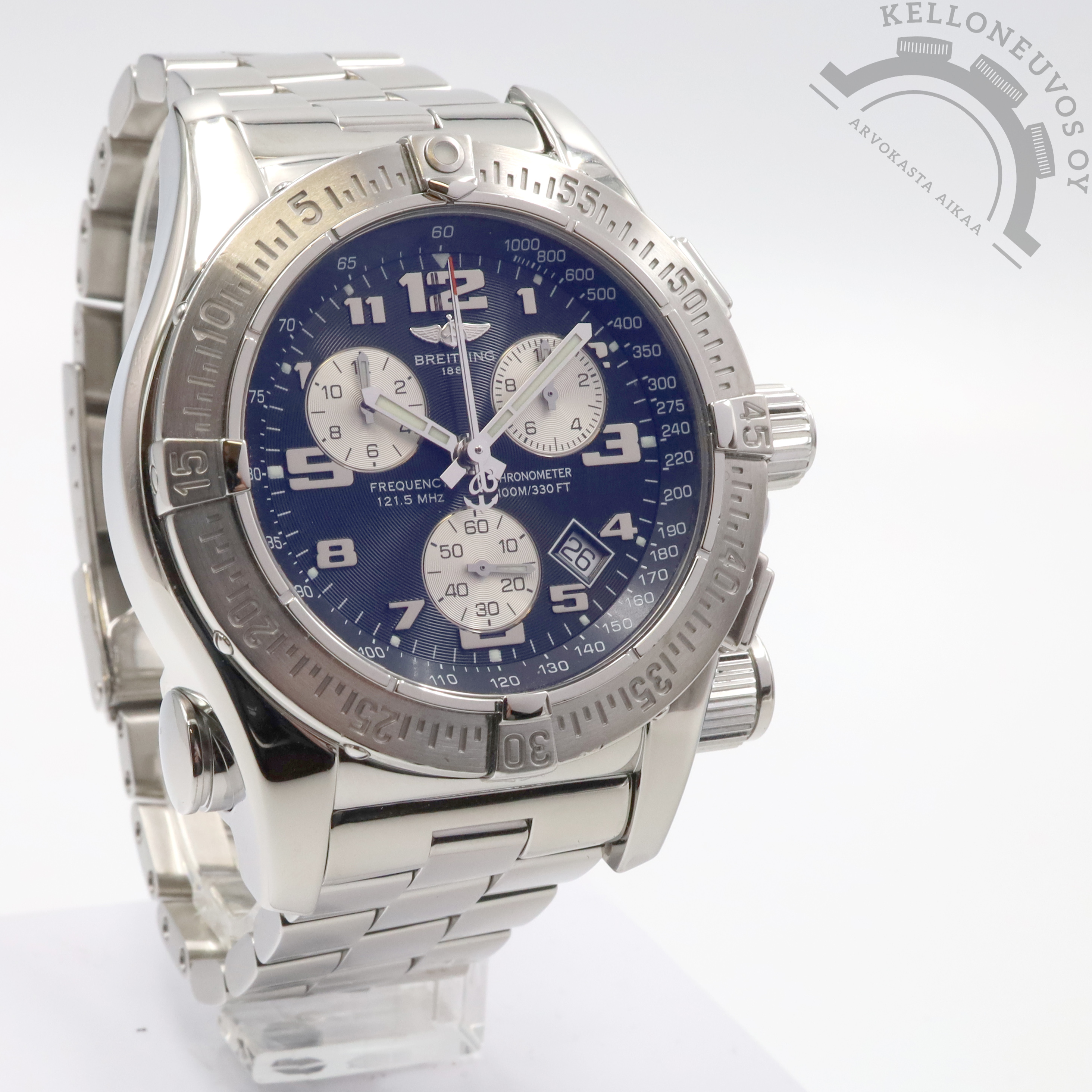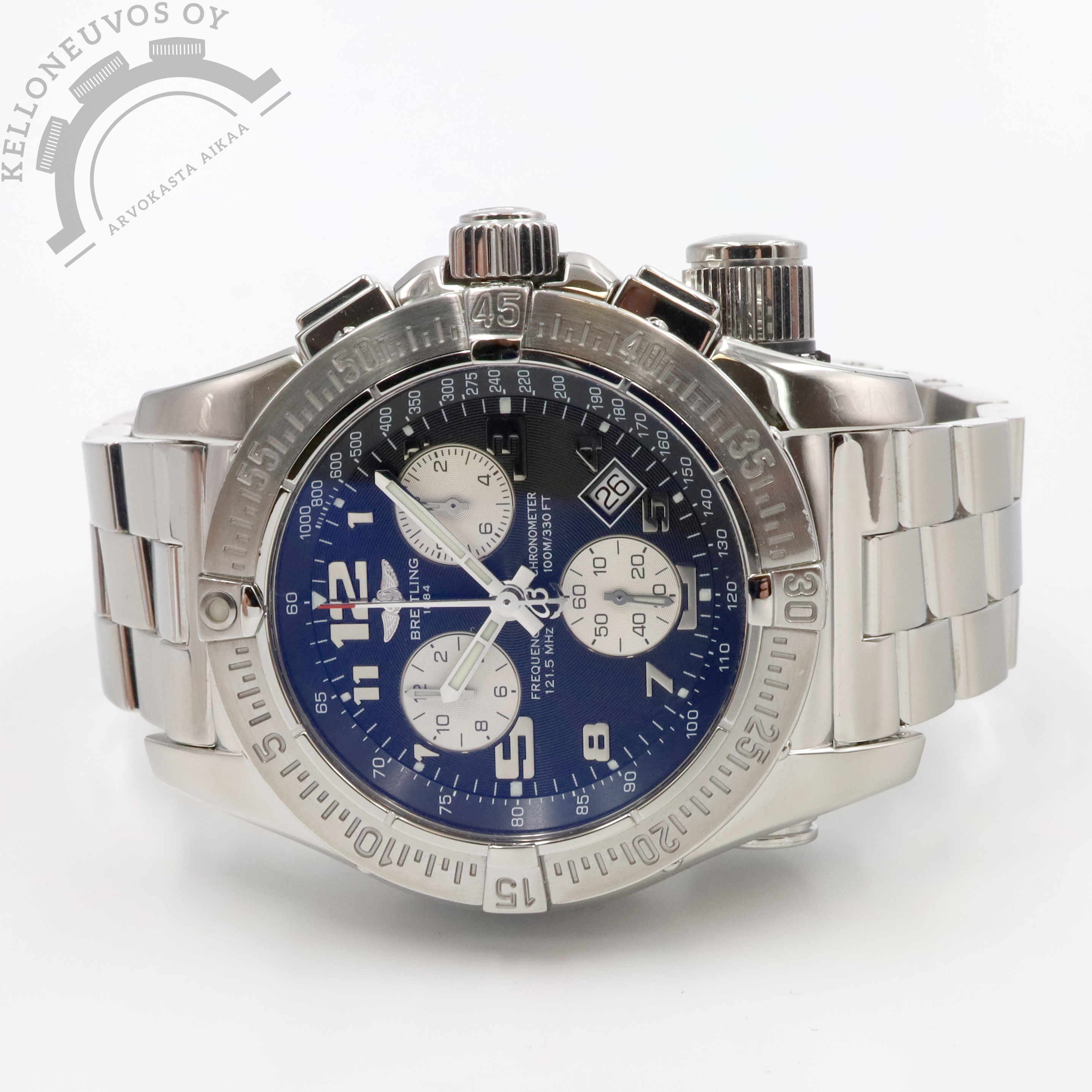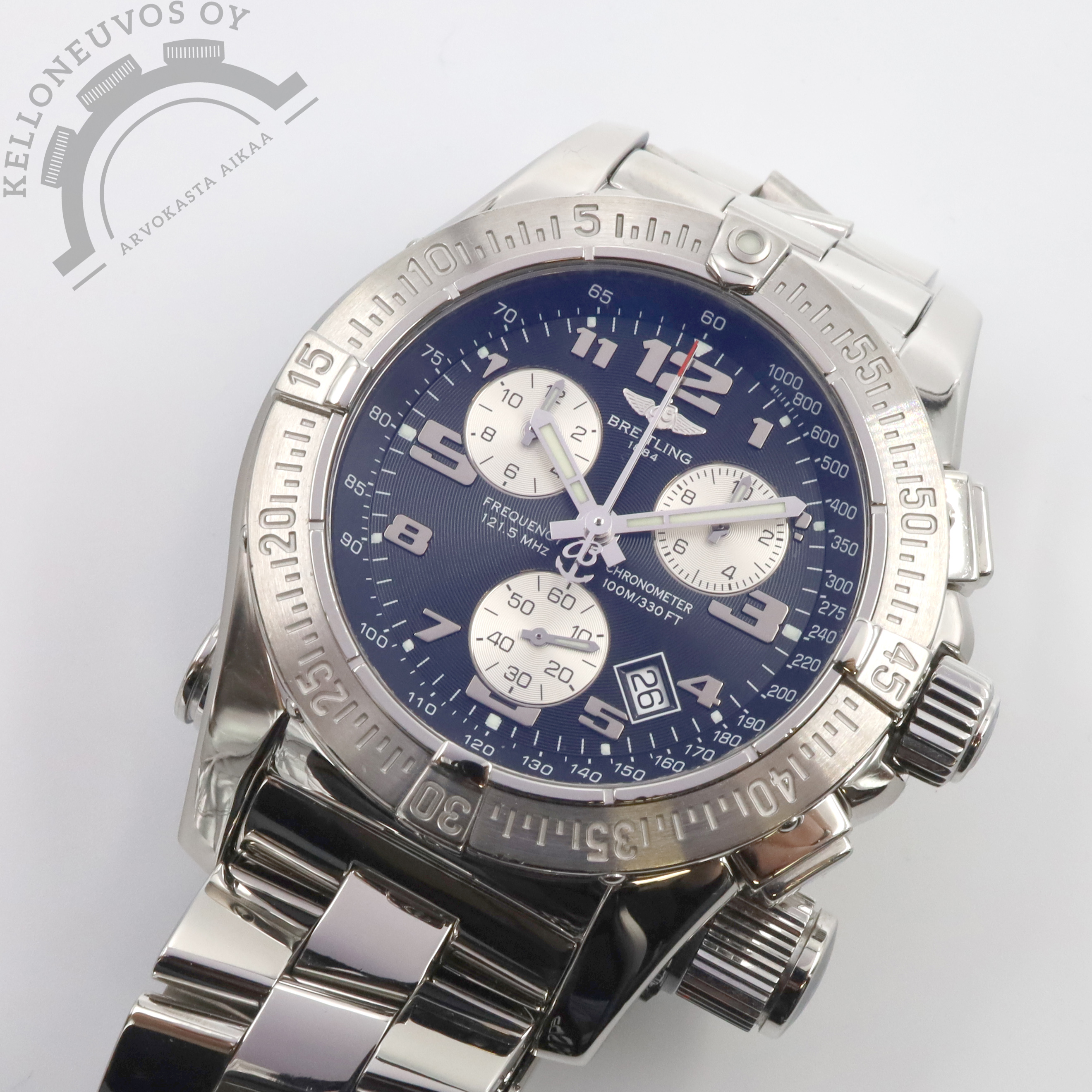 Tarjolle upeakuntoinen ja hiukan havinaisempi Breitling Emergency Mission joka alun perin suunniteltu piloteille ja extreme-käyttöön. Erikoisuutena kellossa on sen sisään rakennettu hätäsignaalilähetin joka aktivoidaan ruuvaamalla esiin antenni kuoren sivusta. Kellossa selkeälukuinen musta taulu päivyrillä, ajanotolla sekä näyttävyyttä lisäävillä hopeisilla pikkutauluilla. Kiillotettu teräksinen kuori sekä niinikään kiillotettu teräksinen ranneke. Vaikka kellolla kokoa huomattavasti istuu se silti loistavasti ranteeseen. Käynnin tarkkuudesta huolen pitää Breitling SuperQuartz 73 -kvartsikoneisto. Kelloa seuraa iso salkku sisältäen kaikki aluperäiset paperit, manuaalit yms. Kellon takuutodistus on päivätty 4/2009 ja sen viimeisin tehdashuolto on tehty 2/2026. Tässä todella upealla pidolla ollut, edukseen erottuva Breitlin uutta rannetta koristamaan.