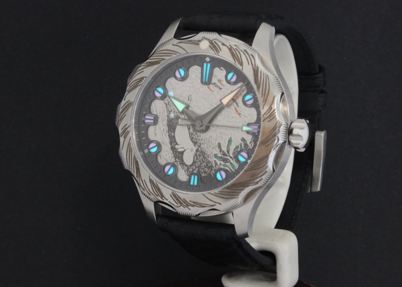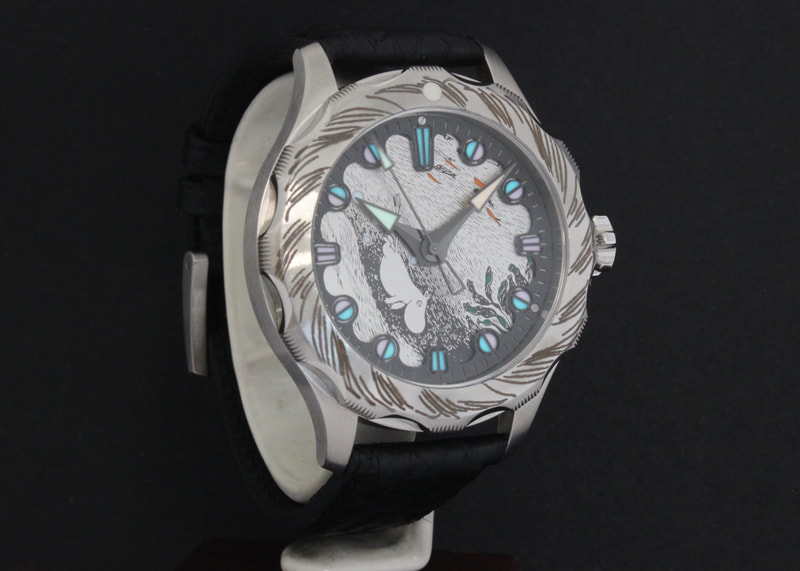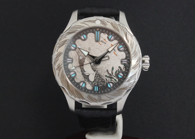 Hieno ja loppuunmyyty S.U.F Helsinki X Moomin halutummassa mustassa värissä, jota valmistettu 26 kpl. Tämä väri myi loppuun hetkessä, verrattuna toiseen siniseen väriin. Kello on kesäkuulta 2024, ja valmistajan takuu voimassa 6/2026 asti. Arvonlisävero 25,5% vähennyskelpoinen. Mukaan nahkakääre, nato ja takuukortti.