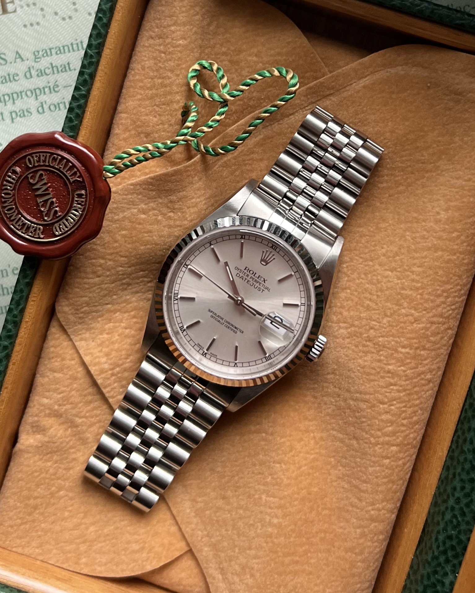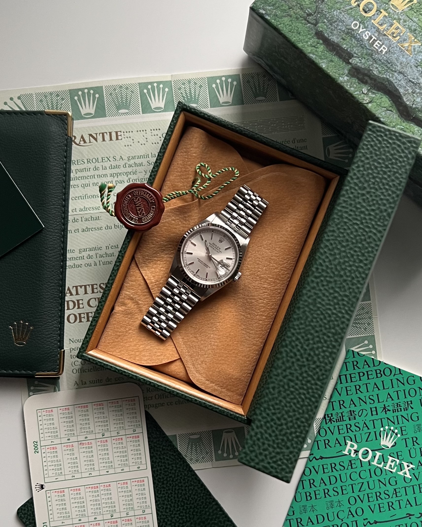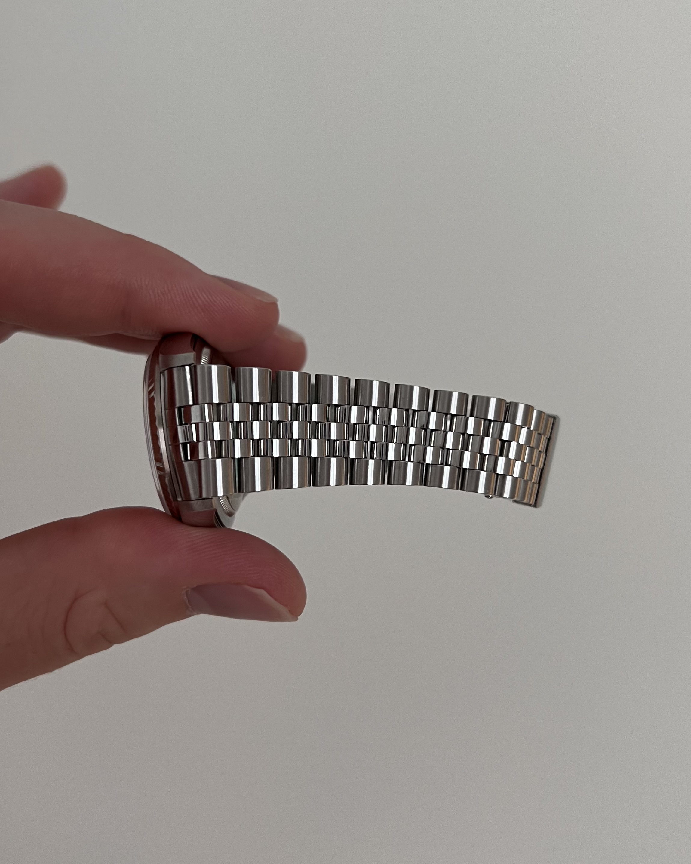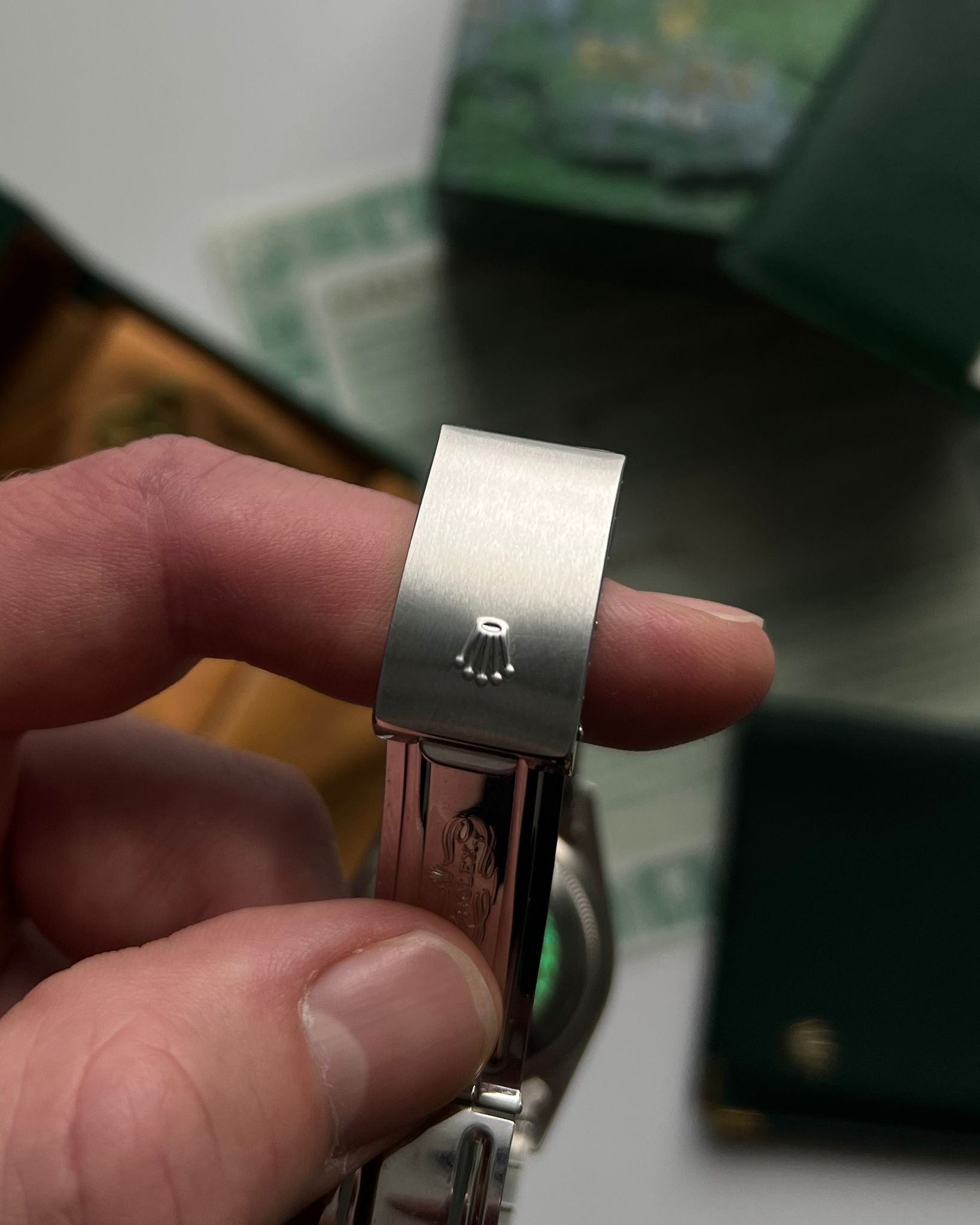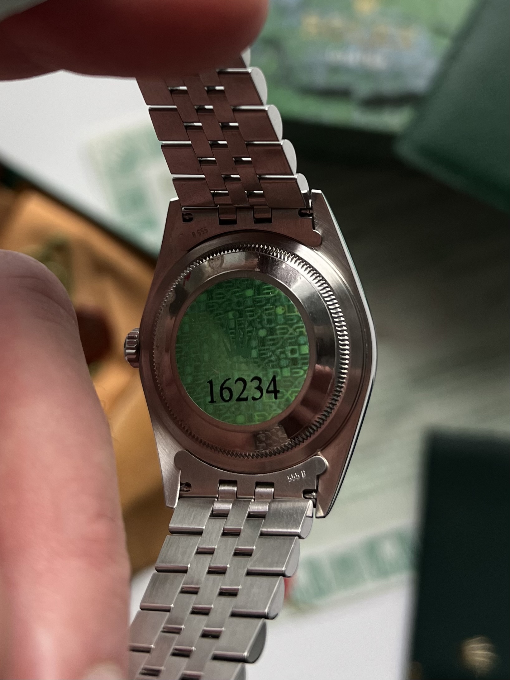 Kellossa on hieno silver sunburst taulu, valkokulta fluted bezel ja jubilee ranneke täysillä linkeillä tottakai, ilman minkäänlaista venymää. Takapohjan tarra ja claspin sisäteipitkin vielä paikallaan.