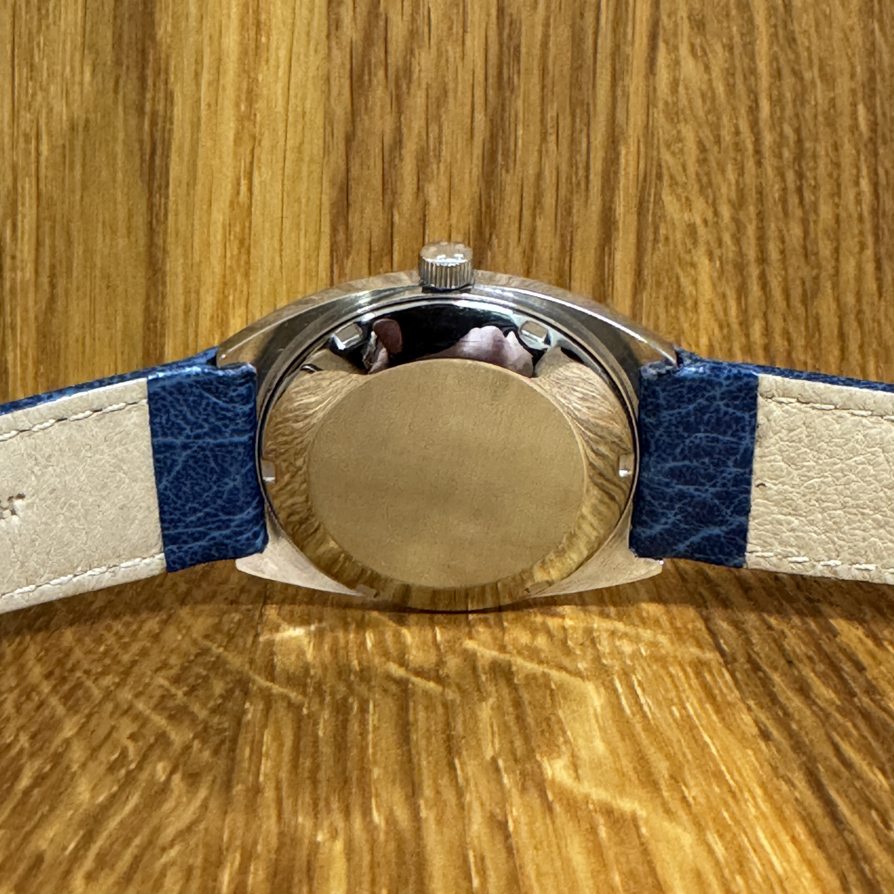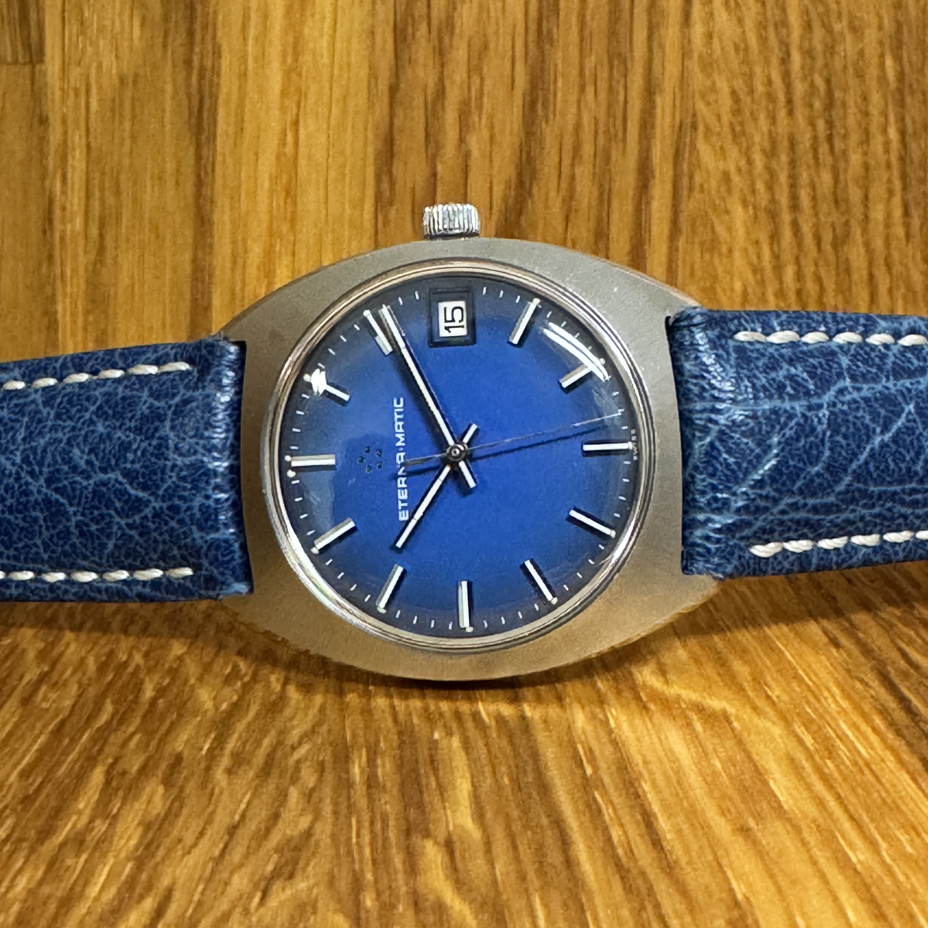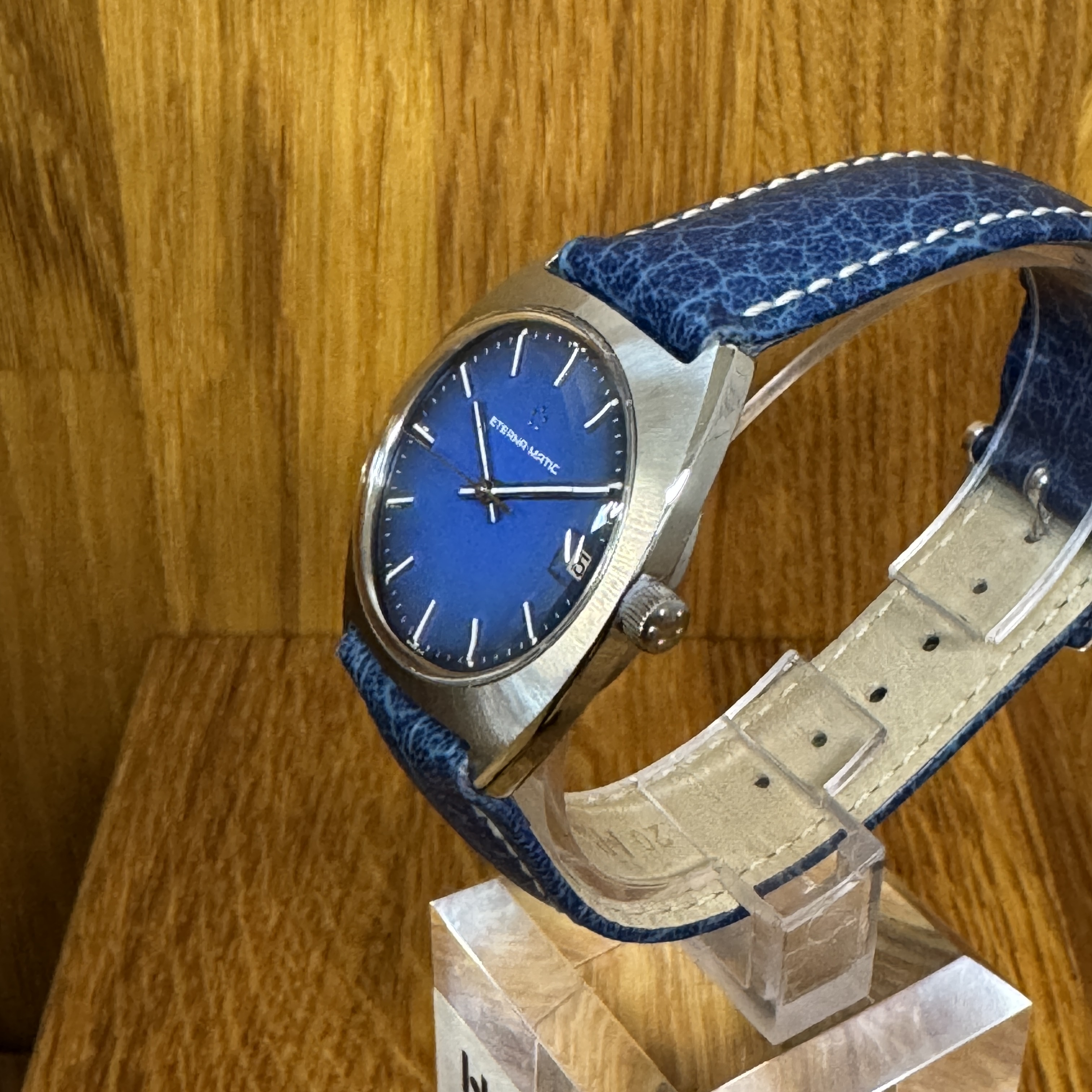 Teräskuorinen ja sinitauluinen Eterna Matic -automaattikello päivyrillä. Kellossa on alkuperäinnen nuppi Eterna-logolla. Rannekkeena on sininen Hirsch Jumper nahkaranneke. Kello on huollettu ja sille myönnetään 12kk takuu.