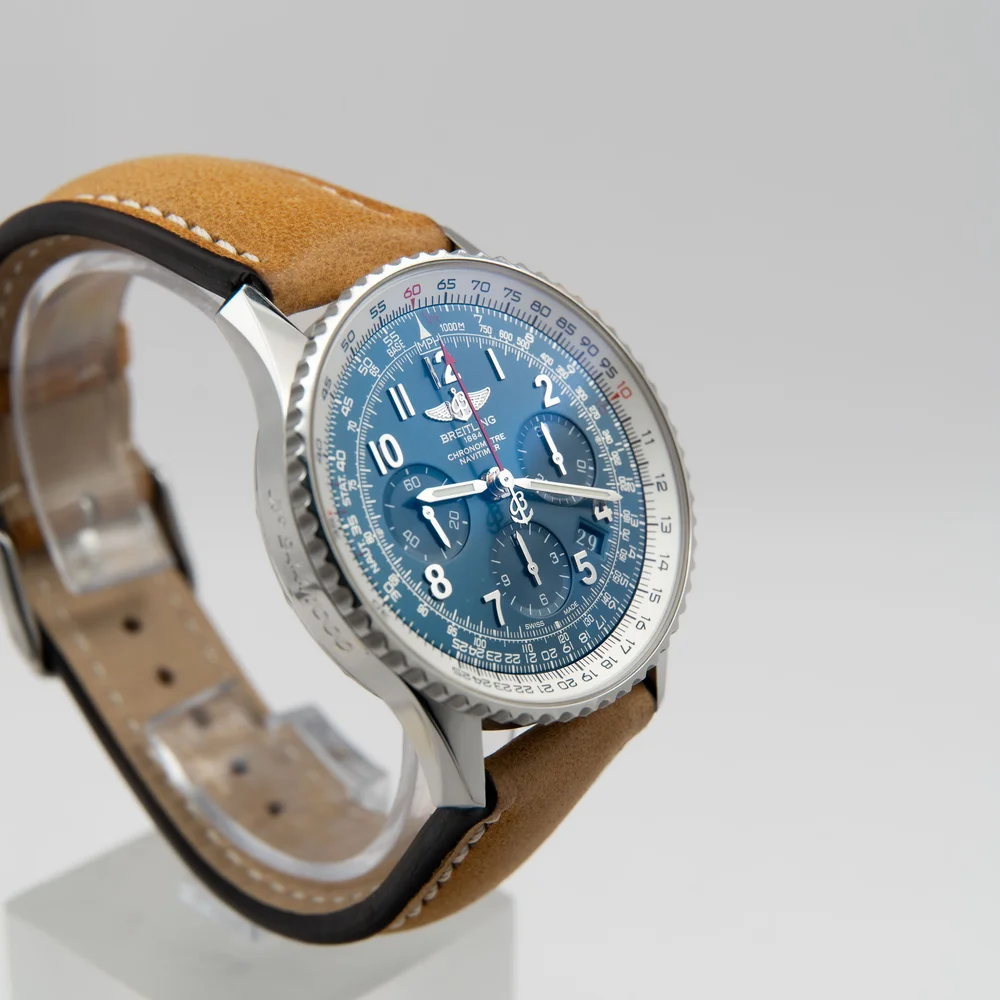 Erinomaisessa kunnossa oleva Breitling AB0121. Klassinen ja sporttinen malli, jossa äärimmäisen laadukas B01 -koneisto n. 70 h käyntivaralla ja sulavatoimisella kronografi-komplikaatiolla. Navitimer-tyylinen laskentakehä mahdollistaa nopeuden, matkan ja kulutuksen laskemisen suoraan ranteesta ilman erillisiä työkaluja. Safiirilasi AR-pinnoitteella ja vesitiiviys 100 m.