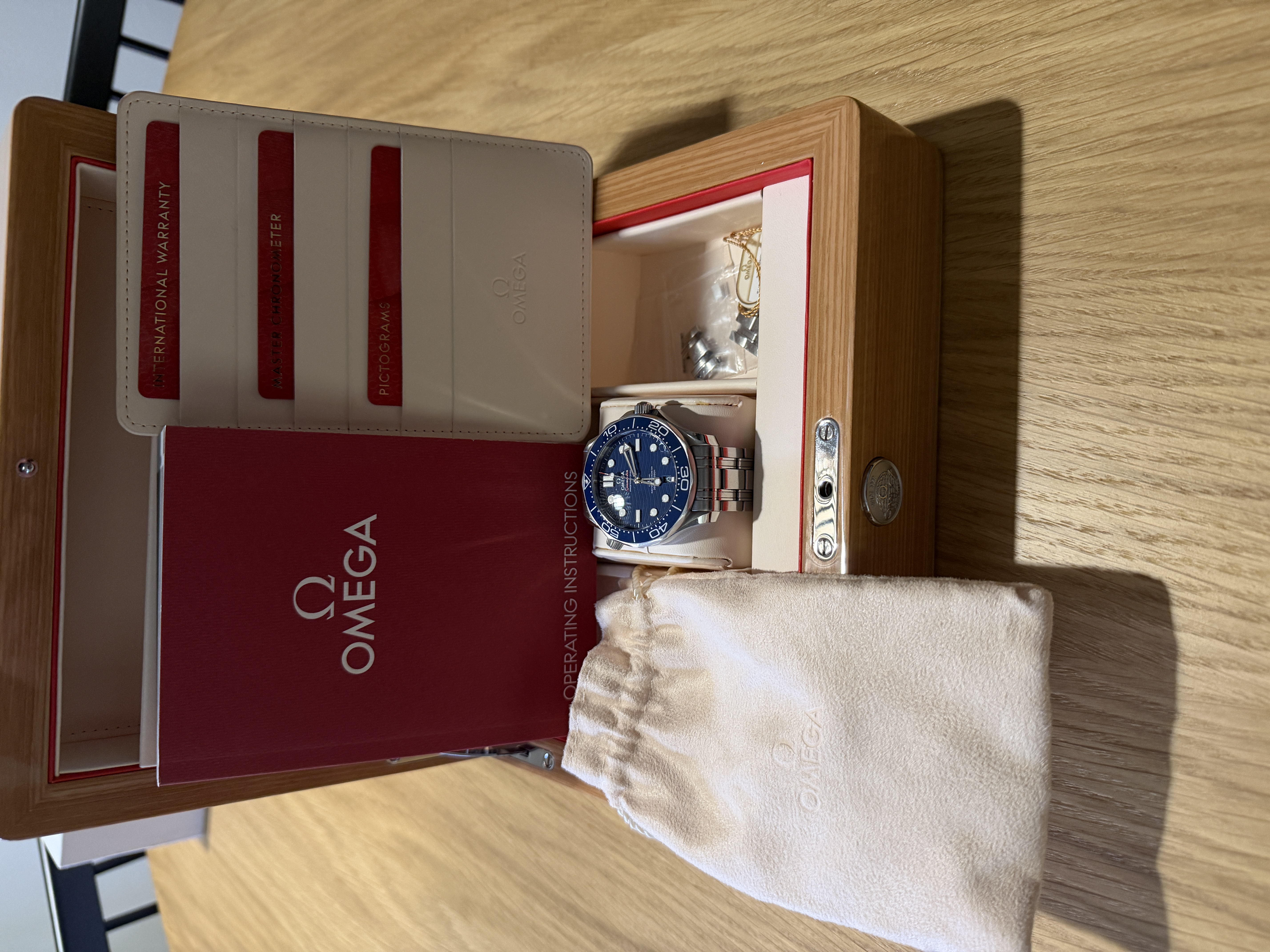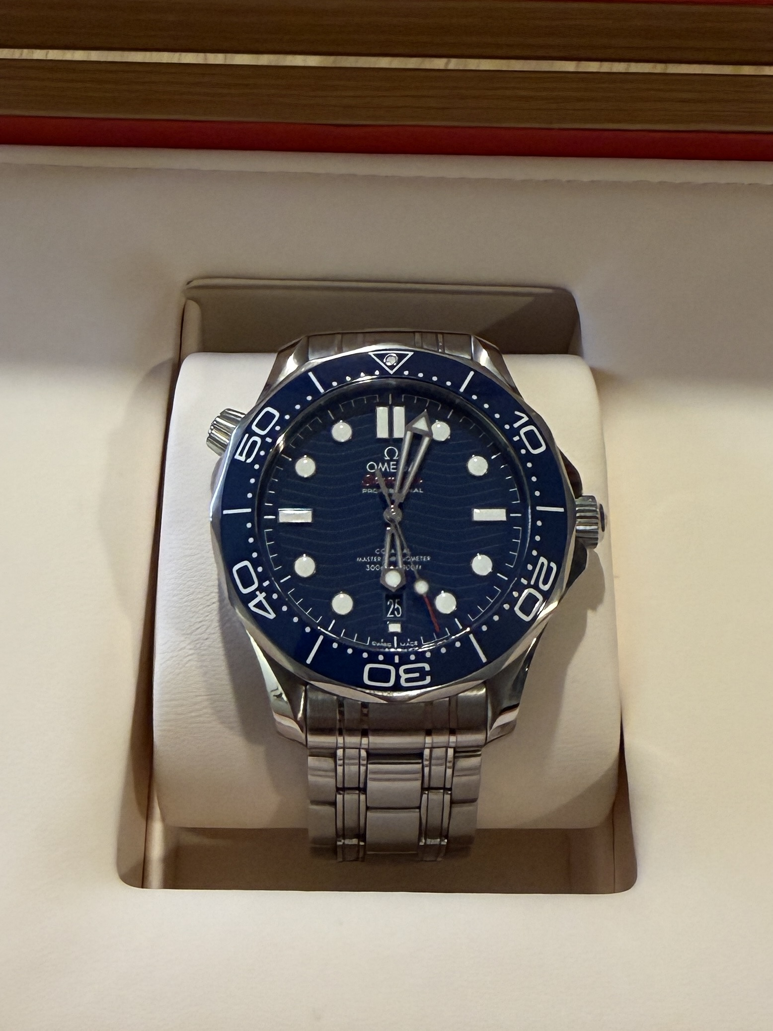 Myydään hyväkuntoinen Omega Seamaster sinisellä taululla.