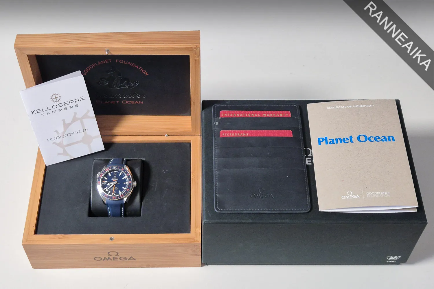 Huippukuntoinen, sinisellä taululla sekä sinioranssilla kehällä varustettu GMT-Omega. Tässä diverissa on näyttävä keraaminen kehä, GMT-kaksoisaikatoiminto sekä pitkä 60h käyntivara. Etupuolen safiirilasi on heijastussuojattu molemmin puolin ja takapuolen safiirin läpi on ihailtavissa tarkasti tikittävä Omega cal. 8605 -automaattikoneisto. Tämä Planet Ocean -erikoismalli on julkaistu juhlistamaan Omegan ja GoodPlanet-järjestön menestyksekästä yhteistyötä. Kellon suomipaperit on päivätty 07/2015 ja se on huollettu Omegan valtuutetussa huollossa 02/2025 – huoltotakuu on voimassa 02/2027 asti. Mukaan tulee kaikki alkuperäiset kortit, korttitasku, huoltotosite viimeisimmästä huollosta sekä molemmat laatikot (GoodPlanet-sertifikaatit sekä ko. erikoismallille tehty oma laatikkonsa).