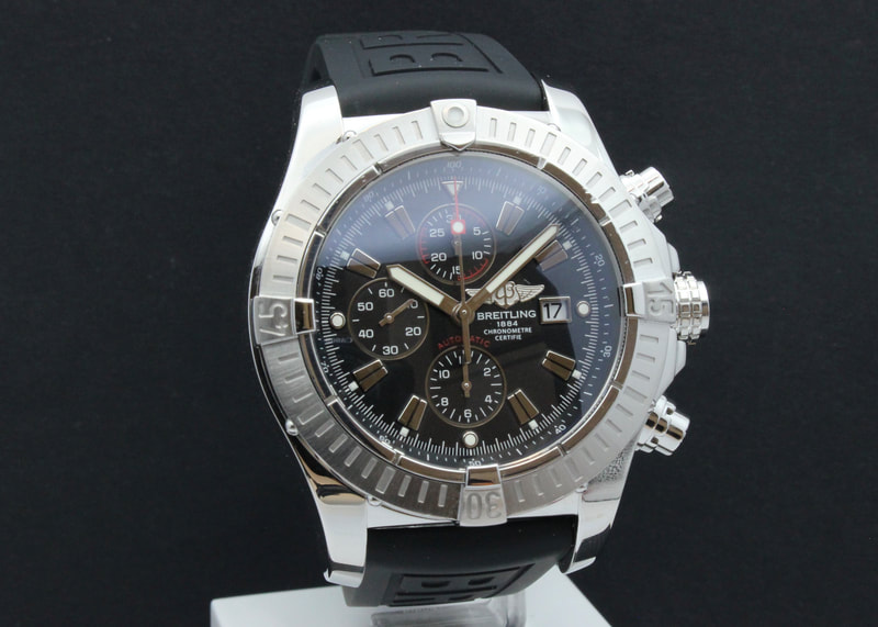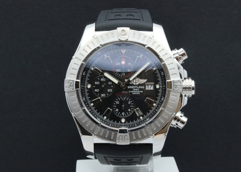 Hyväkuntoinen ensimmäisen sukupolven Breitling Super Avenger A13370 muhkeassa 48mm koossa. Kellossa musta taulu ja täysin uusi merkin oma kumiranneke omalla soljella. Kello on 2011 vuosimallia, ja se käy erinomaisesti ja koneisto siisti. Mukaan boksit, manuaali, kronometritodistus, mutta ei alkuperäistä takuutodistusta.