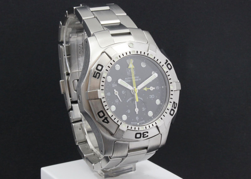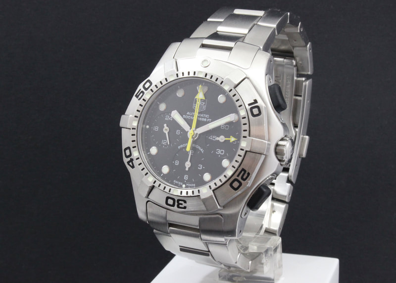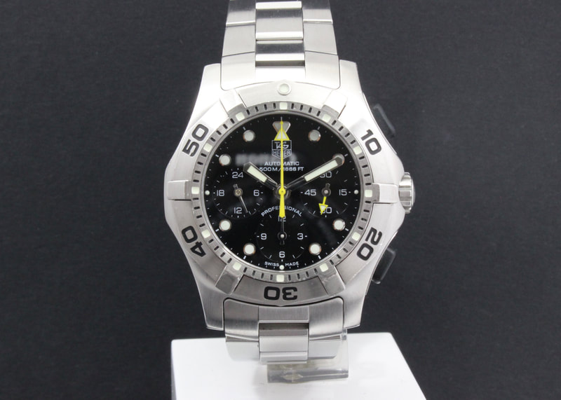 Erittäin jykevä työkalusuklari Tag Heuer Aquagraph 2000, jossa tarkkakäyntinen calibre 60 moduulikronografikoneisto, jossa toimintoina ajanotto, päivä ja yöaika pikkutaulu. Kello on osahuollettu merkin virallisessa huollossa 9/2023 (nupit ja tiivisteet vaihdettu). Koneisto on siisti ja käy tarkasti. Mukaan boksit, manuaali, päiväämätön ja leimaamaton takuukortti, kumirannekkeet, työkalu ja dive planner vihko sekä vaihdetut osat. Tästä keräilijälle kunnon setti!