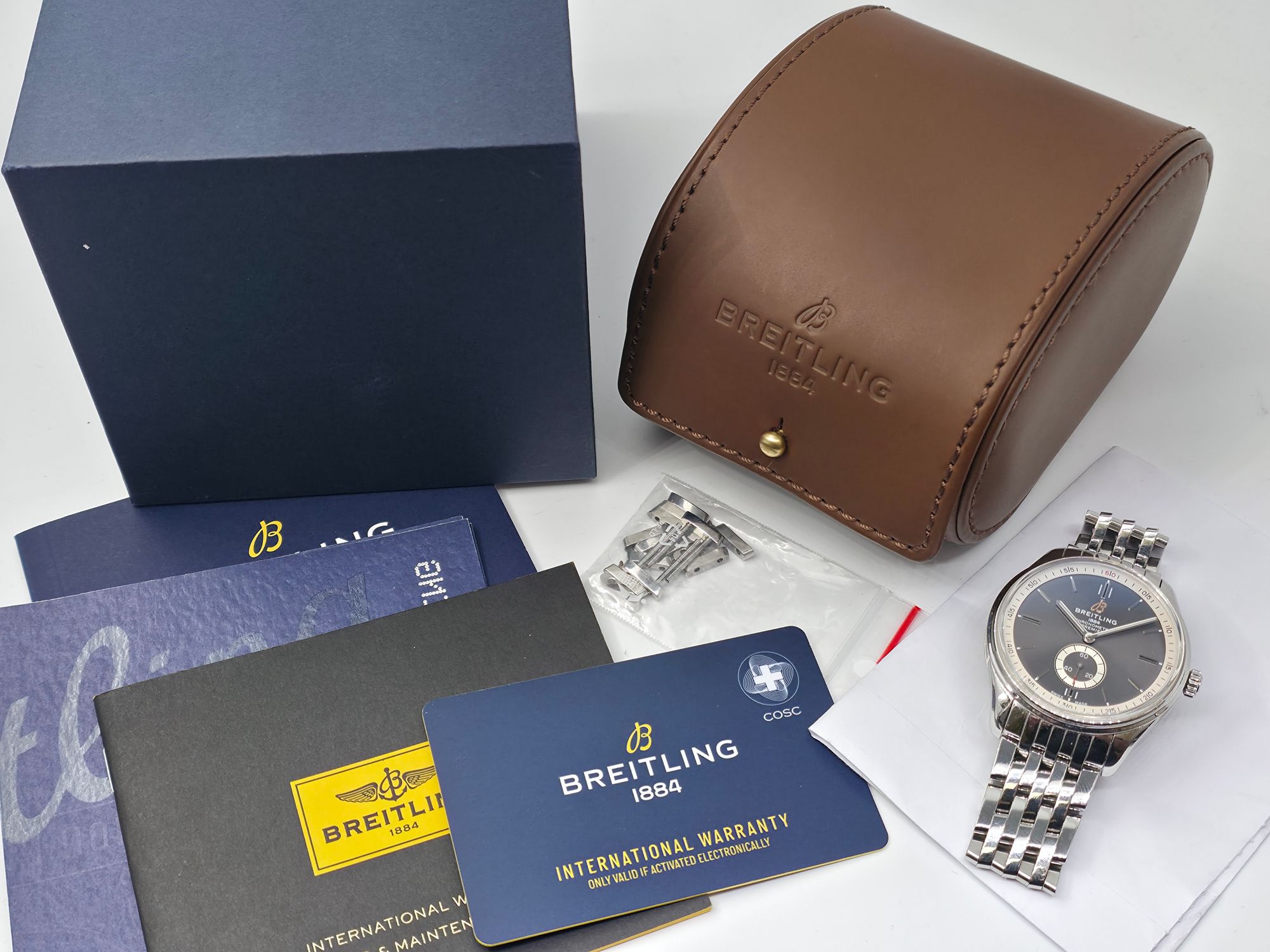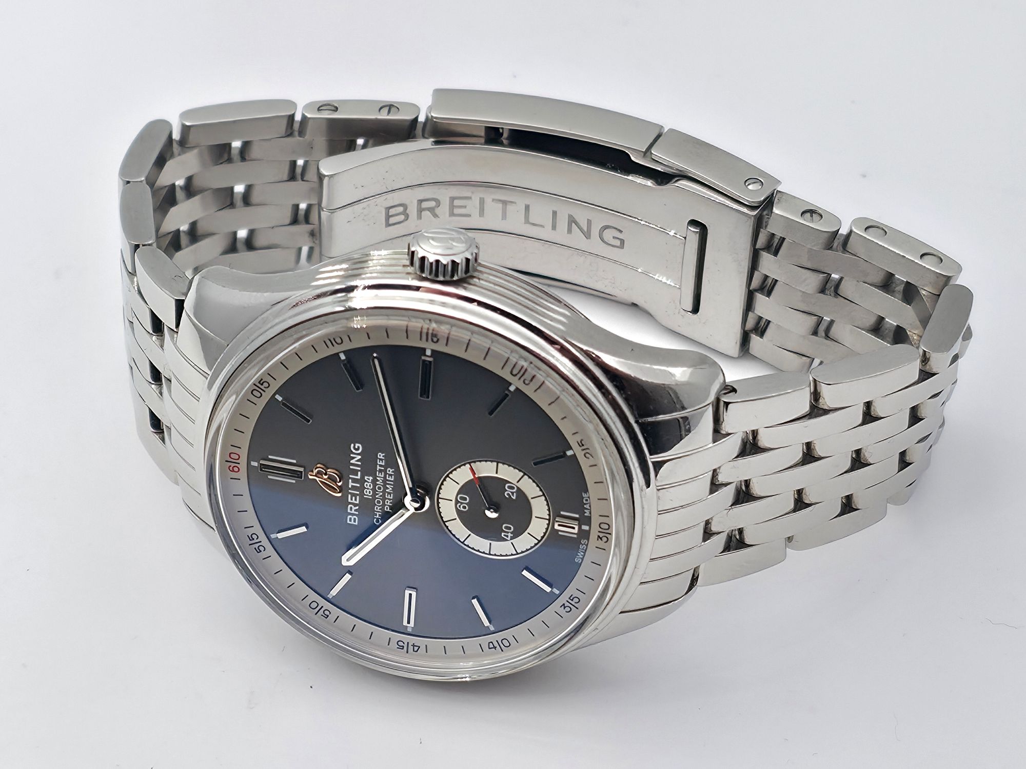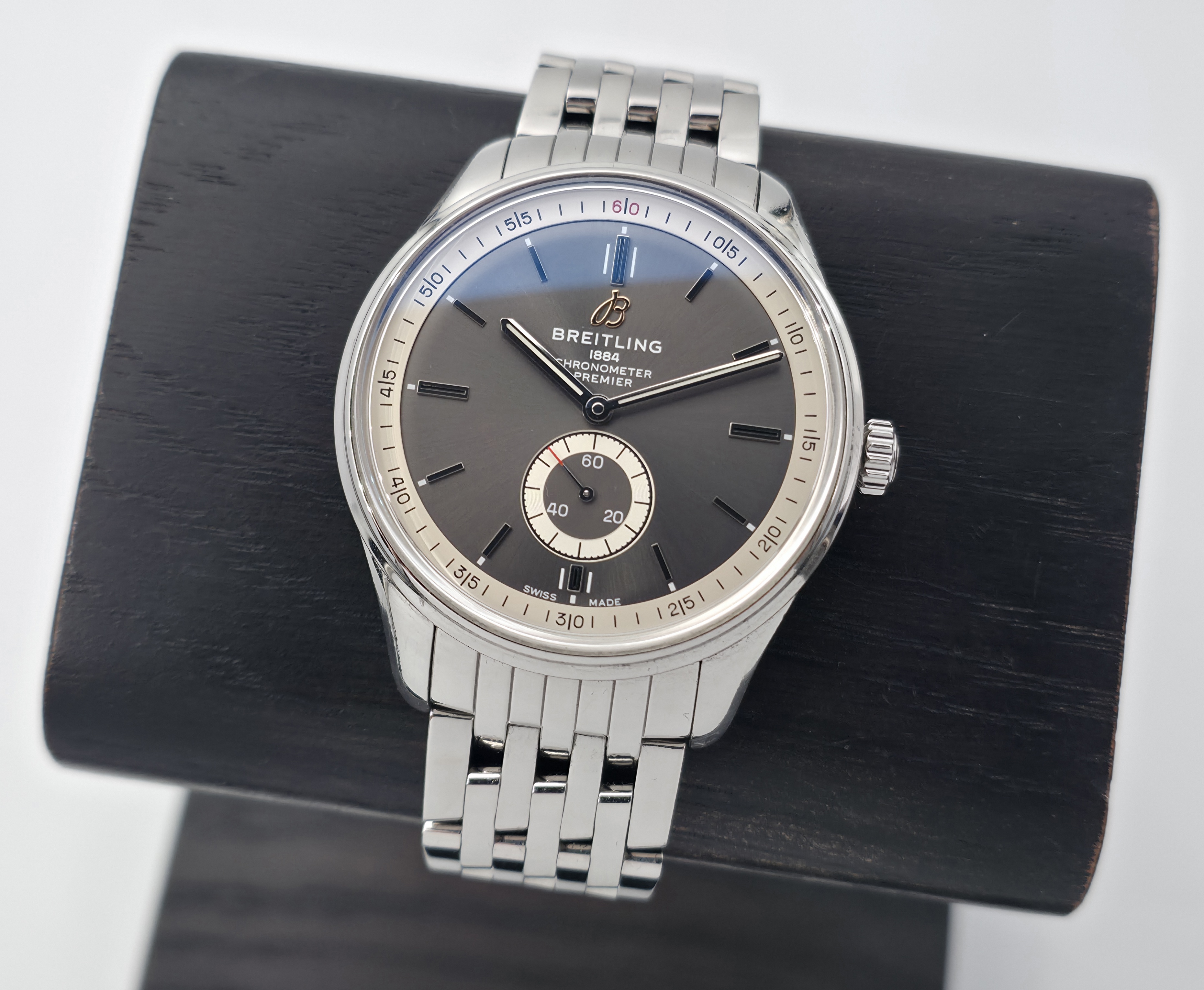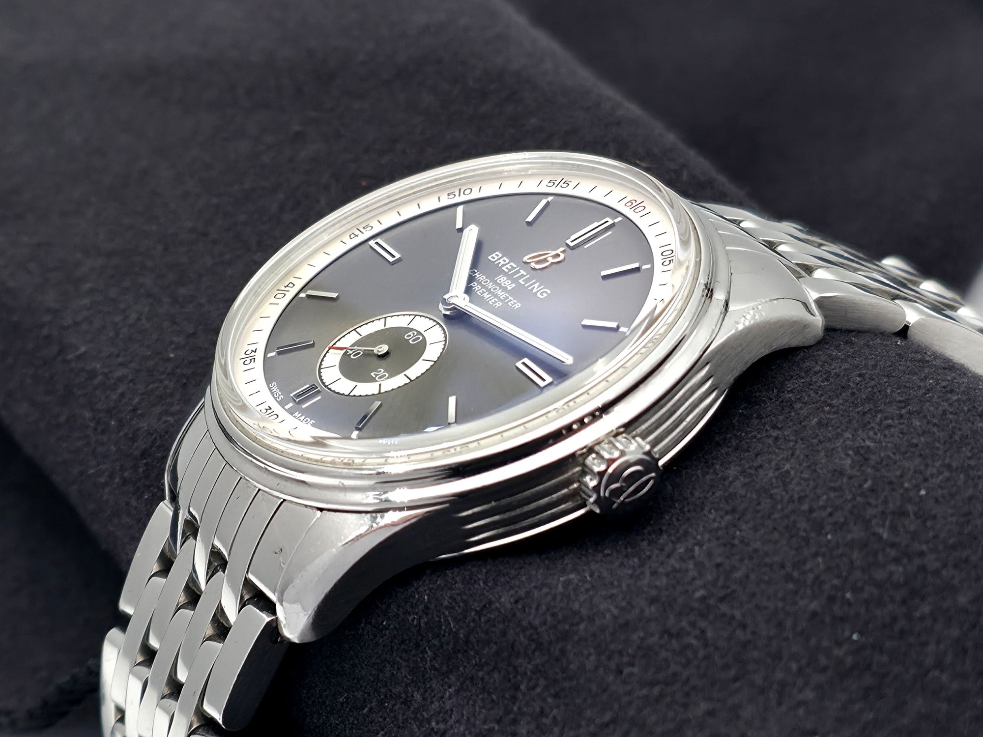 Näyttävä Breitling Premier 40 -kello harmaalla sunburst-taululla. Fullset 07/2022. Kello on huollettu marraskuussa 2025 ja sillä on vuoden huoltotakuu. Tavanomaista käytönjälkeä löytyy. Tämä elegantti ja tyylikäs malli sisältää hienoja yksityiskohtia ja sopii kokonsa puolesta lähes kaikille. Ovh. 5350e