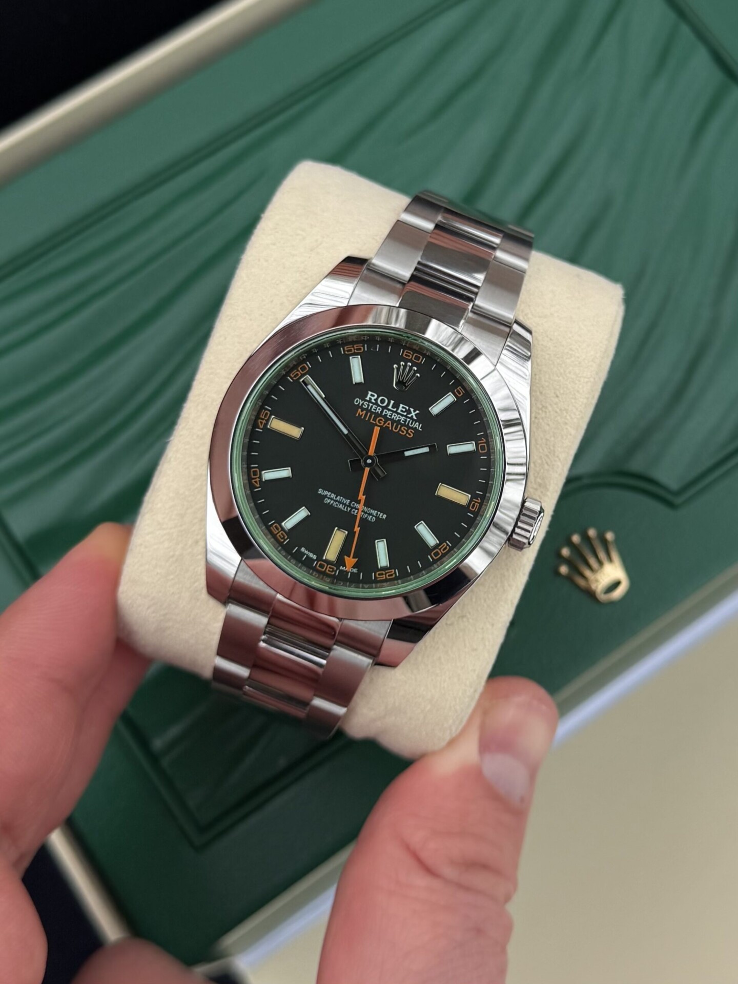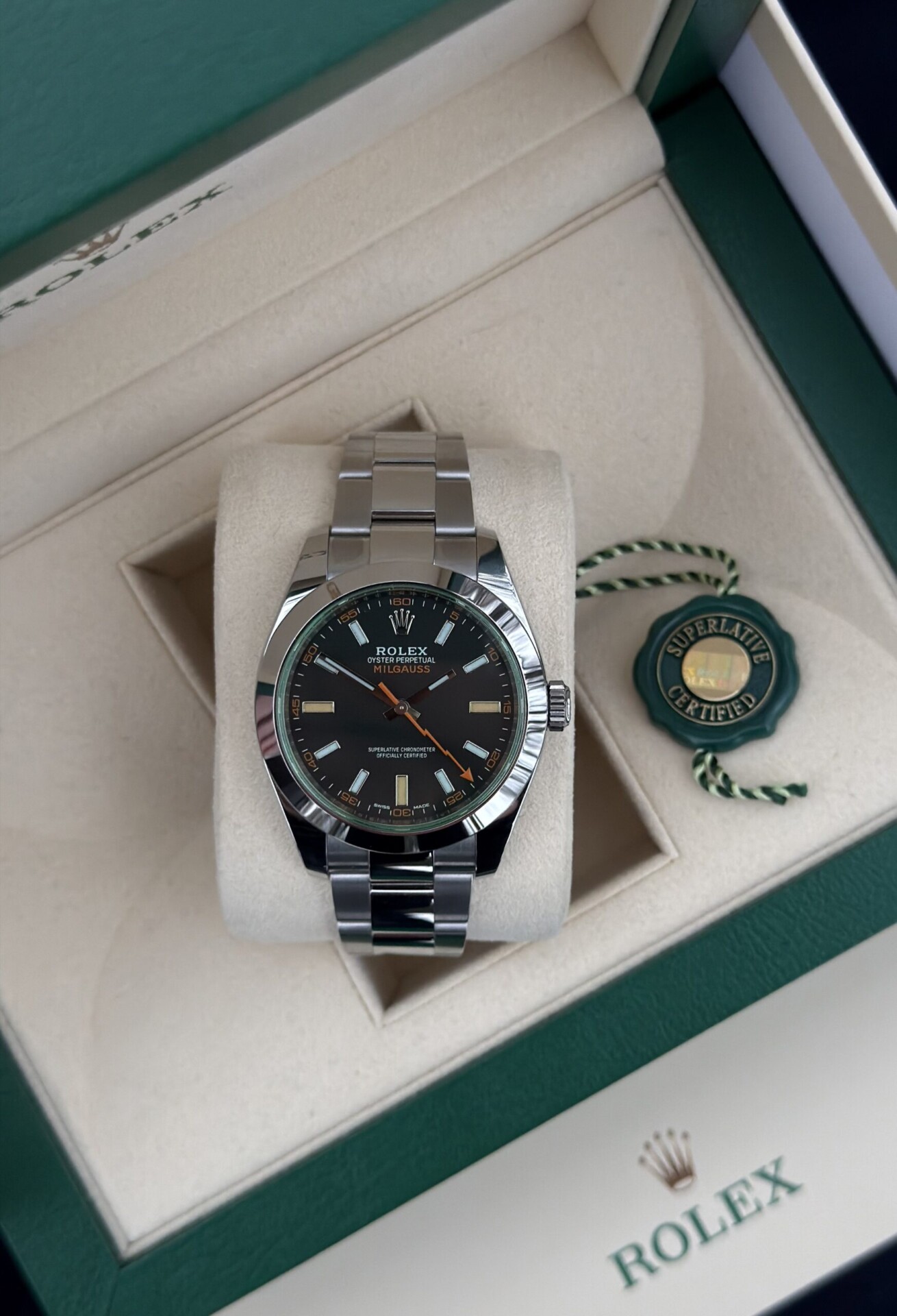 Erittäin hyvässä kunnossa oleva ja vähän käytöllä ollut Rolex Milgauss (03/2020). Kellon käynti tarkistettu +2 s/vrk. Malli on suunniteltu kestämään voimakkaita magneettikenttiä ja erottuu edukseen vihreällä safiirilasilla sekä sporttisella ilmeellään.