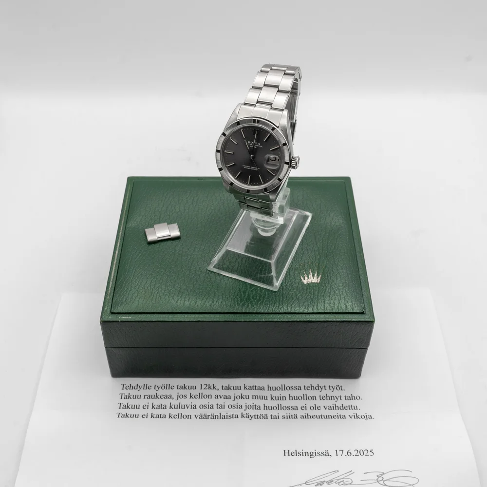 Ajaton ja upea Rolex Oyster Perpetual Date ikäisekseen siistissä kunnossa. Koneistona Caliber 1570 n. 48 tunnin käyntivaralla. Kello on täyshuollettu 6/2025 Kelloseppä Mikko Kvistin toimesta, joten kyseessä on poikkeuksellisen huoleton valinta vintage-Rolexia etsivälle.