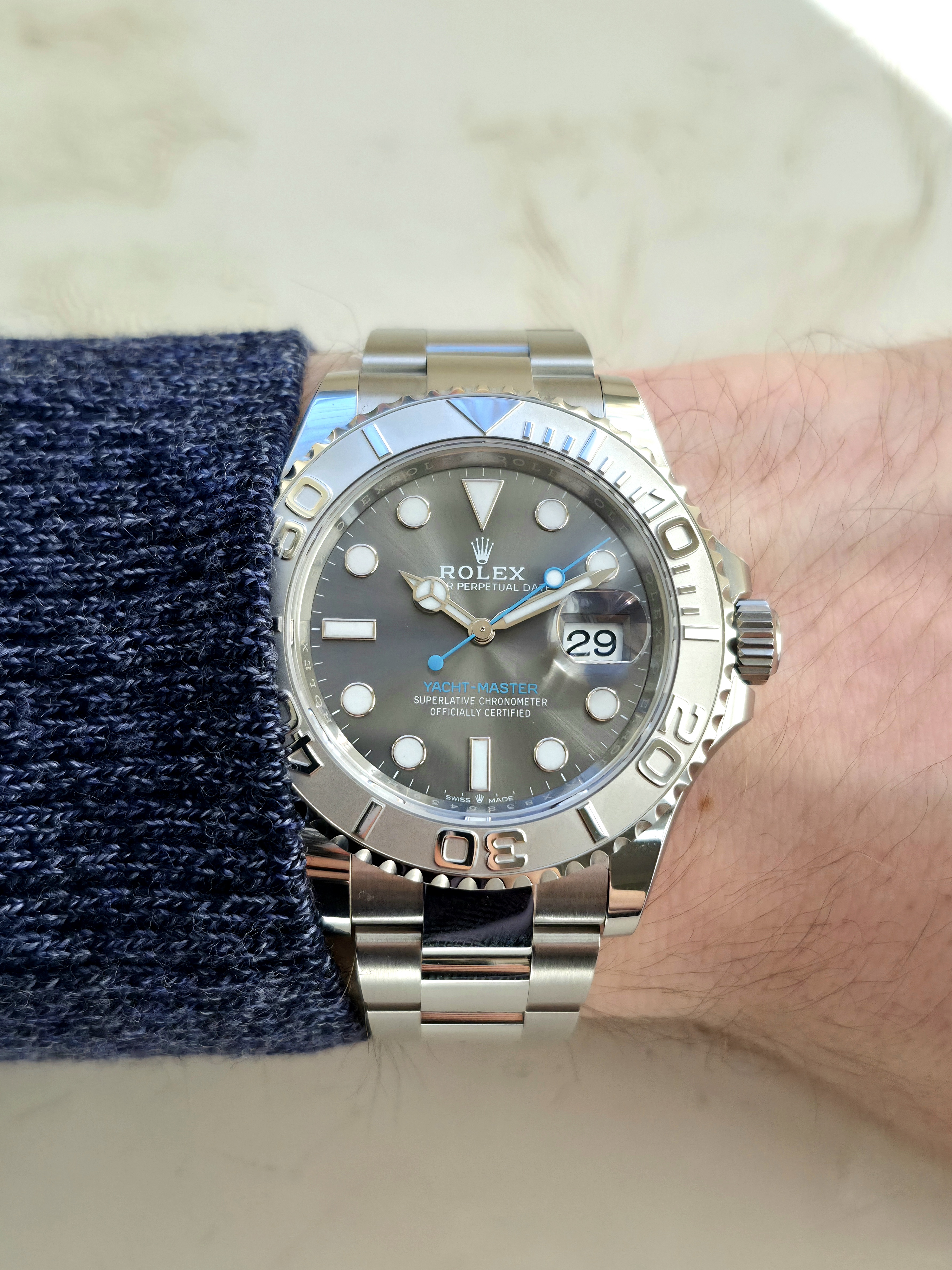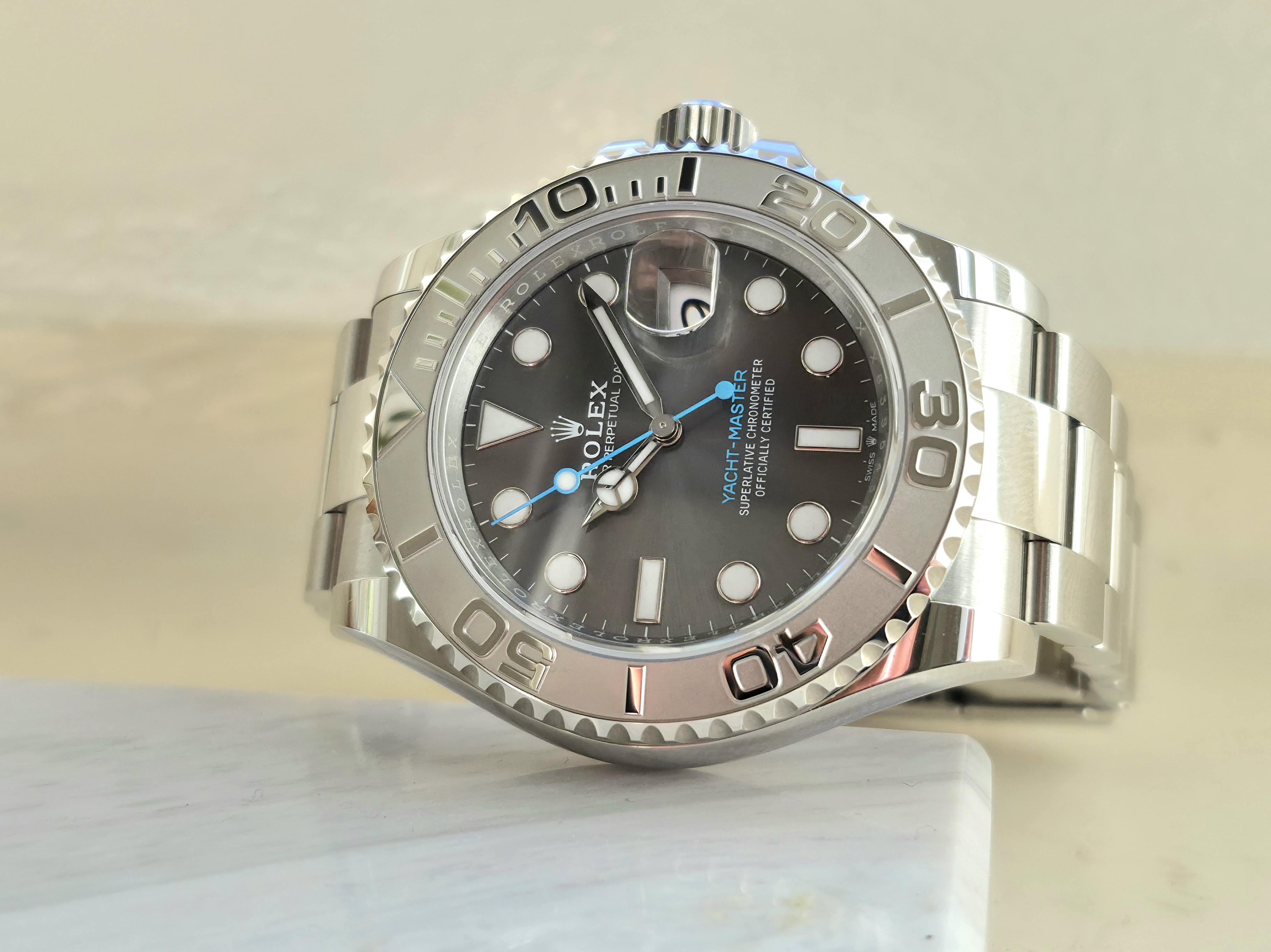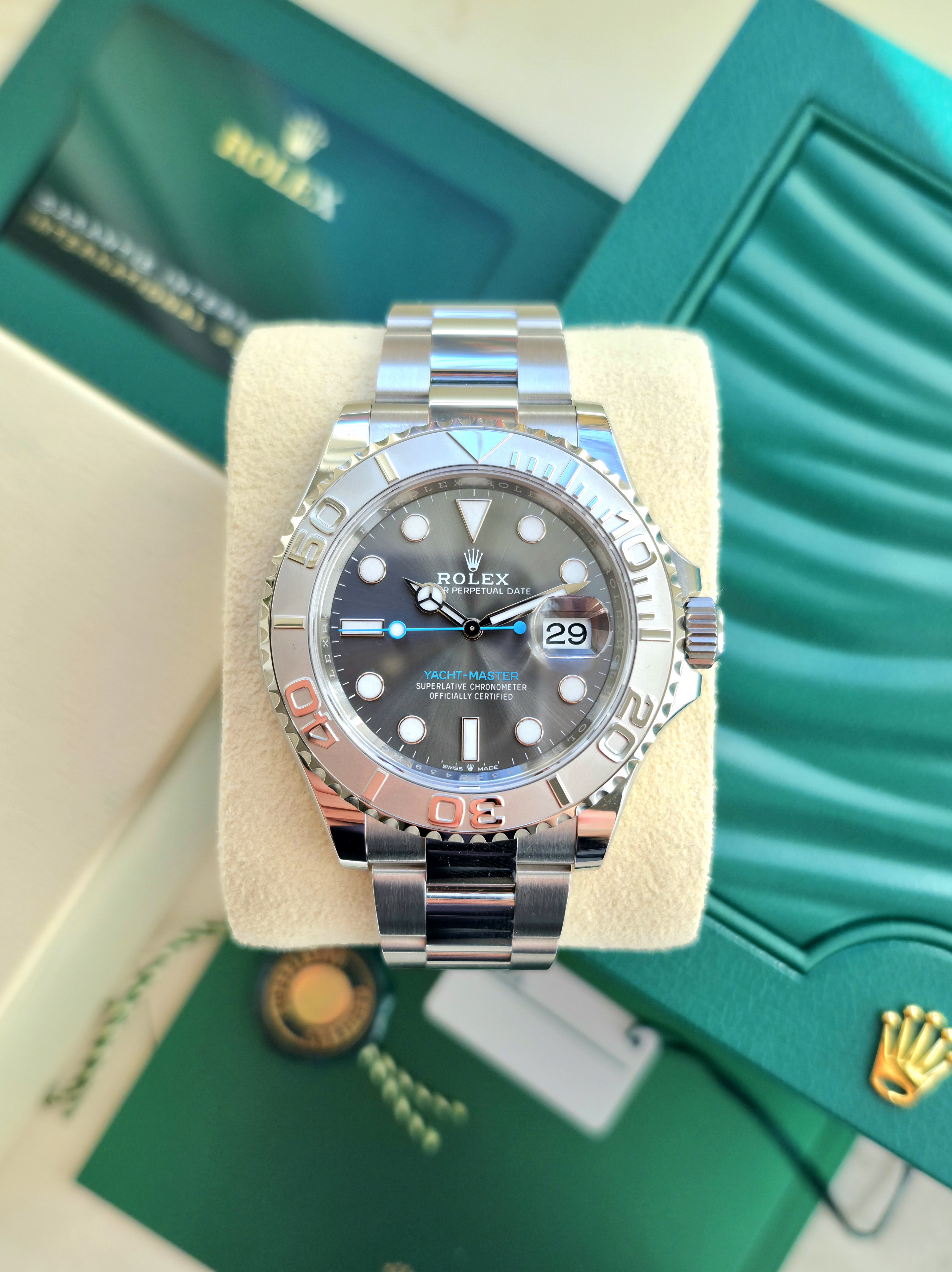 Upea ja käyttämätön Rolex Yacht-Master 40mm, rhodium taululla ja platinabezelillä. Kellon paperit leimattu 7/2024 ja valmistajan takuuta jäljellä 7/2029 asti! Kunto on virheetön, bezelin lukossa edelleen suojamuovit päällä.