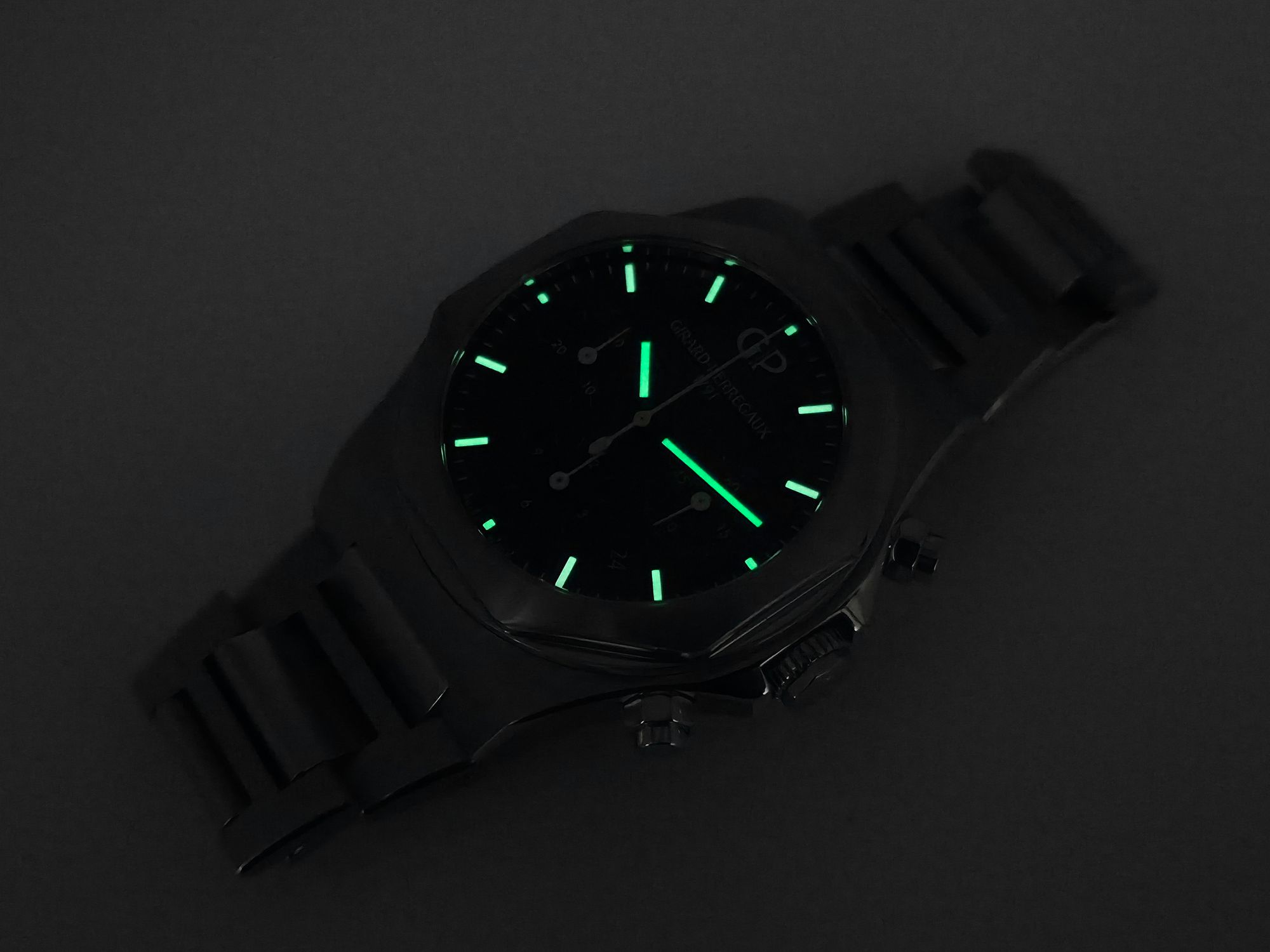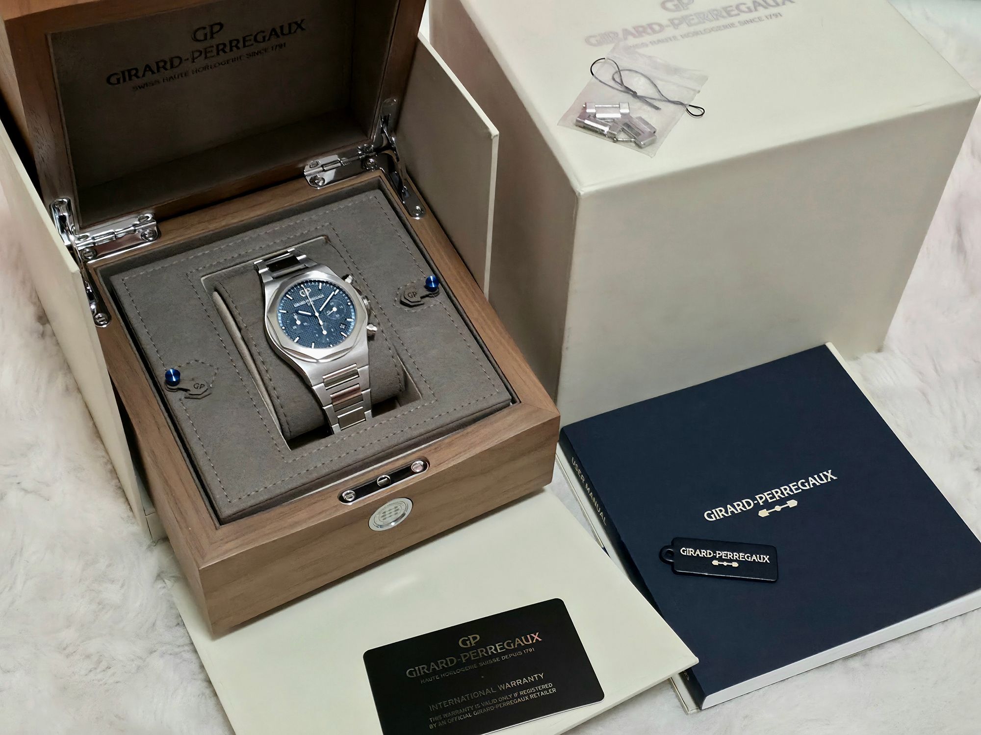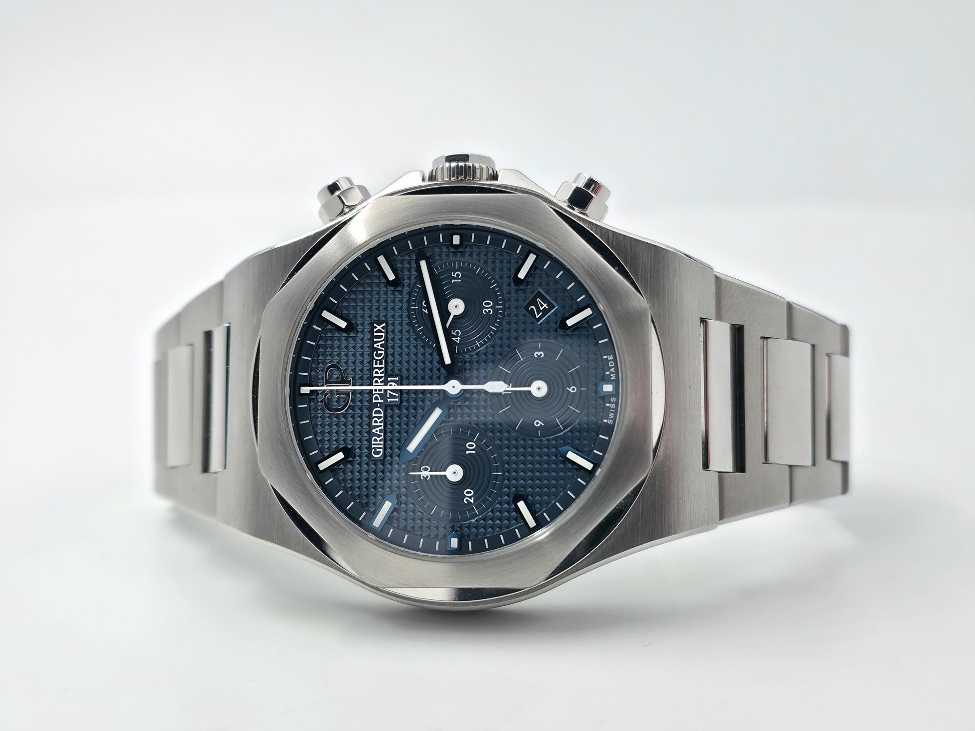 Tyylikäs Girard-Perregaux Laureato Chronograph – sporttiluksusta parhaimmillaan. Ikoninen kahdeksankulmainen bezel, integroitu ranneke ja syvänsininen “vohveli” -taulu tekevät tästä näyttävän mutta samalla ajattoman kokonaisuuden. Kello siistissä kunnossa oleva Full set. Paperit päivätty 10/2022, 5 vuoden tehdastakuu. Ovh. 19 600e Tästä erittäin tyylikäs ja monikäyttöinen Laureato Chronograph suoraan ranteeseen!