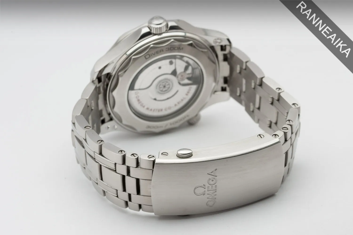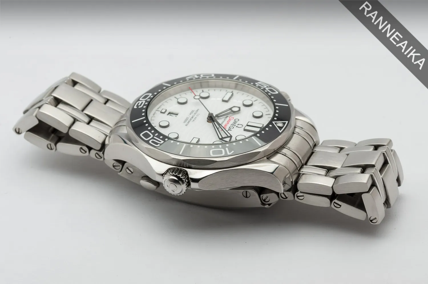 Näyttävä 42mm diver halutuimmalla valkoisella taululla sekä mustalla keraamisella kehällä. Aaltokuvioitu taulu yhdessä molemmin puolin AR-päällystetyn safiirilasin kanssa on luonnossa todella upea yhdistelmä, jota on vaikea vangita valokuviin. Niin ikään safiirilasilla varustetun takakannen suojassa tikittää tarkasti Omega cal. 8800 -inhousekaliiperi, jolle luvataan mm. 55 tunnin käyntivara sekä magneettisuojaus aina 15 000 gaussiin asti. Rannekkeesta löytyy luonnollisesti myös erittäin kätevä jousikuormitteisesta painonapista vapautettava pituuden hienosäätö sekä sukeltajan jatko. Kellon alkuperäiset paperit on päivätty 03/2022 ja valmistajan 5v takuu on voimassa 03/2027 asti. Mukaan tulee kaikki alkuperäiset paperit, korttitasku sekä molemmat laatikot. Tämän mallin suositushinta uutena on 6 800 EUR, tästä monipuolinen diver sopivasti!