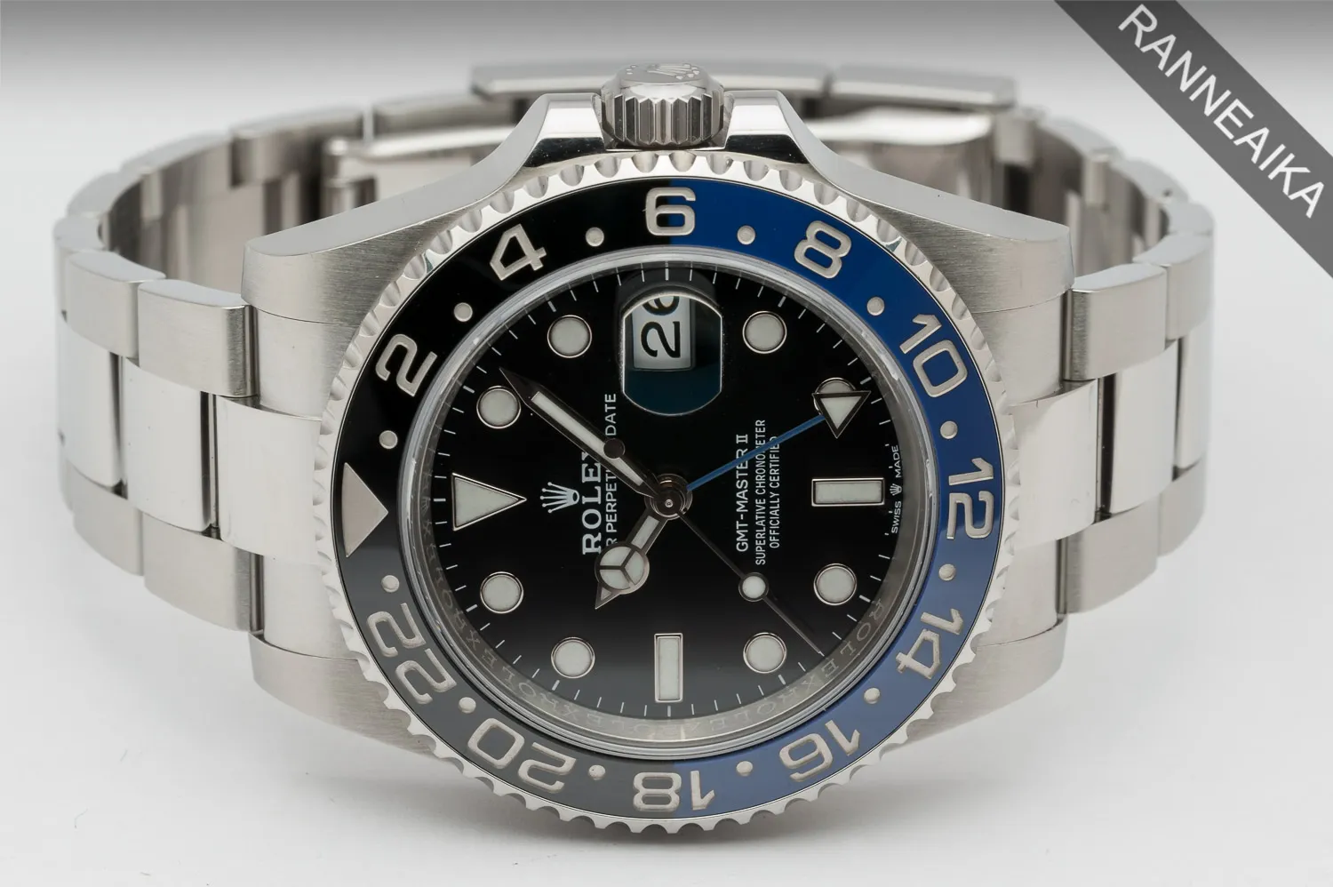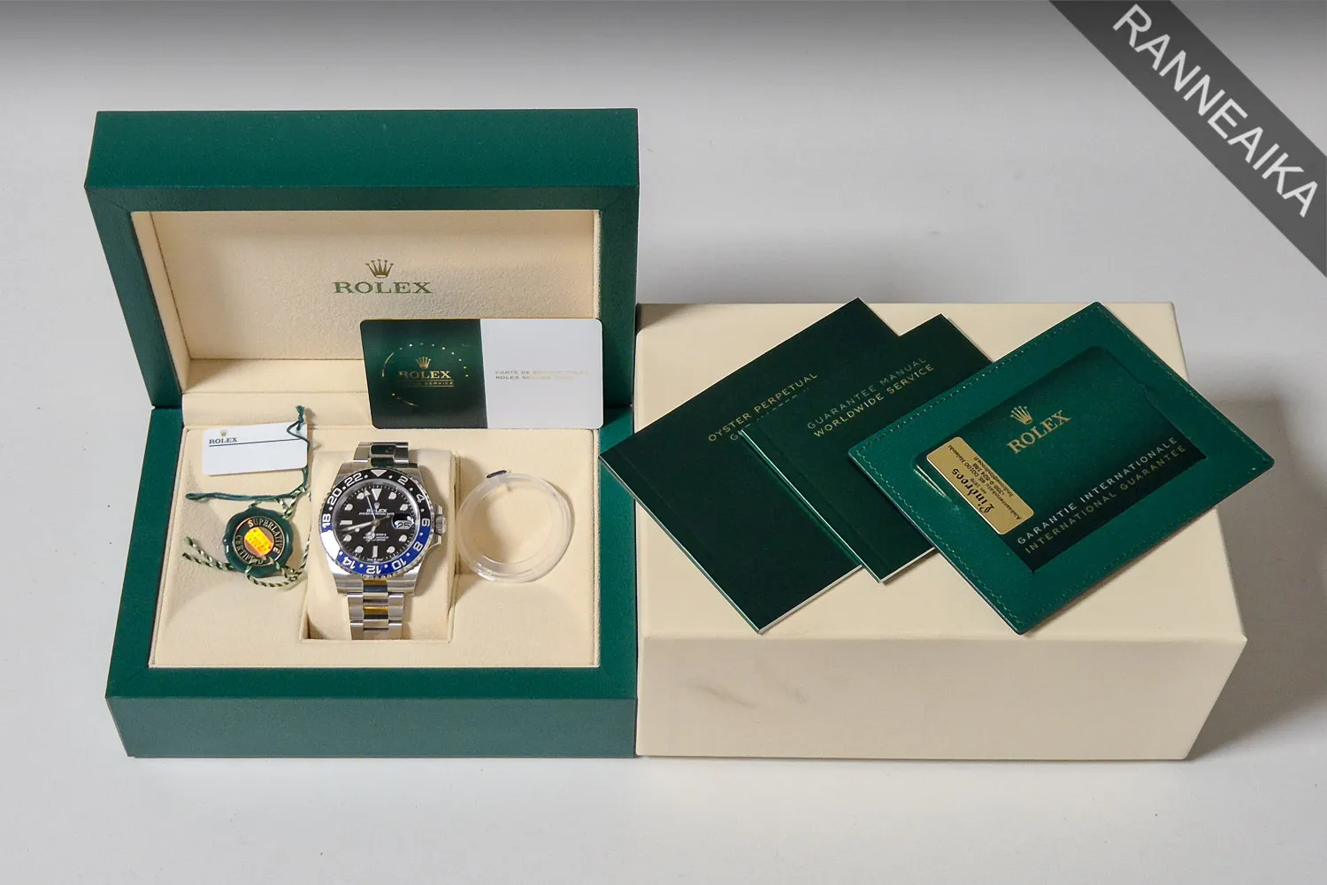 Haluttu sinimustalla keraamisella kehällä varustettu GMT Master II. GMT-kaksoisaikakomplikaatiolla varustettu oyster-rannekkeinen sportti-Rolex, jossa myös kykloopilla varustettu selkeälukuinen päivyri. Teräksisen takakannen sisällä tikittää tarkasti Rolex cal. 3285 -automaattikoneisto. Kellon alkuperäinen takuukortti on päivätty kotimaisen Rolex-jälleenmyyjän toimesta 07/2021 ja se on huollettu 02/2026 – huoltotakuu on voimassa 02/2028 asti. Mukaan tulee kaikki alkuperäiset paperit, korttitasku, molemmat laatikot, molemmat hang tagit, kehän muovisuojus sekä huoltotakuukortti suoritetusta huollosta. Tästä todella haluttu suosikkimalli suoraan ranteeseen!