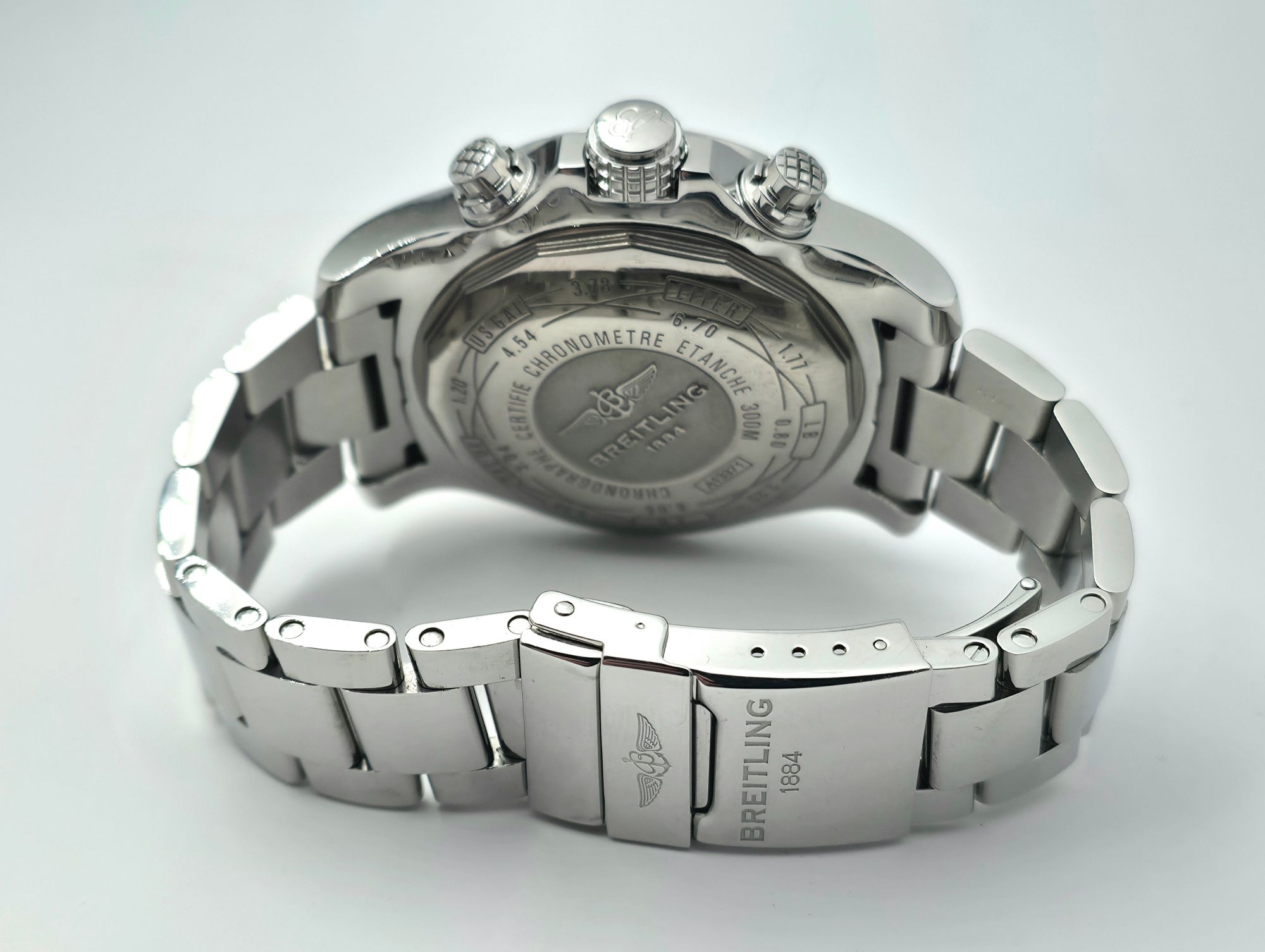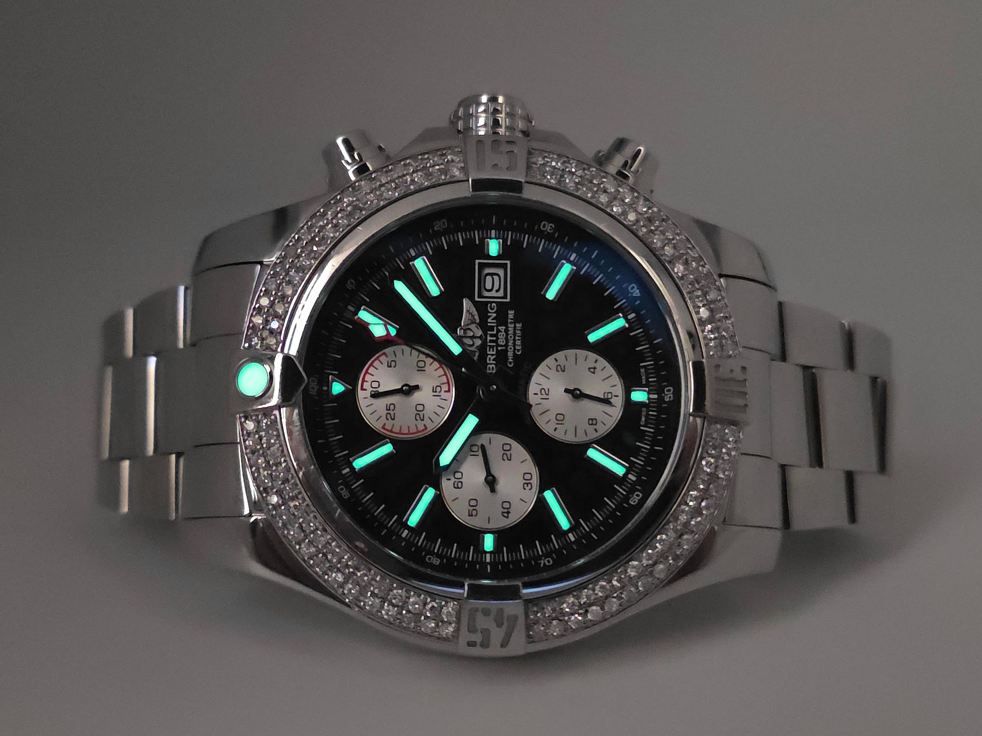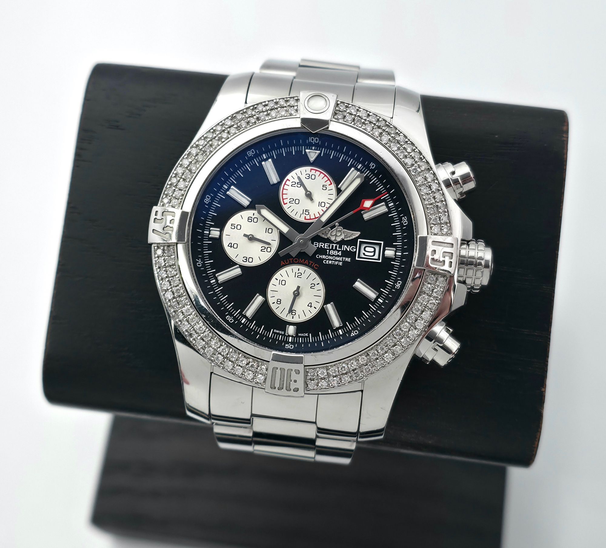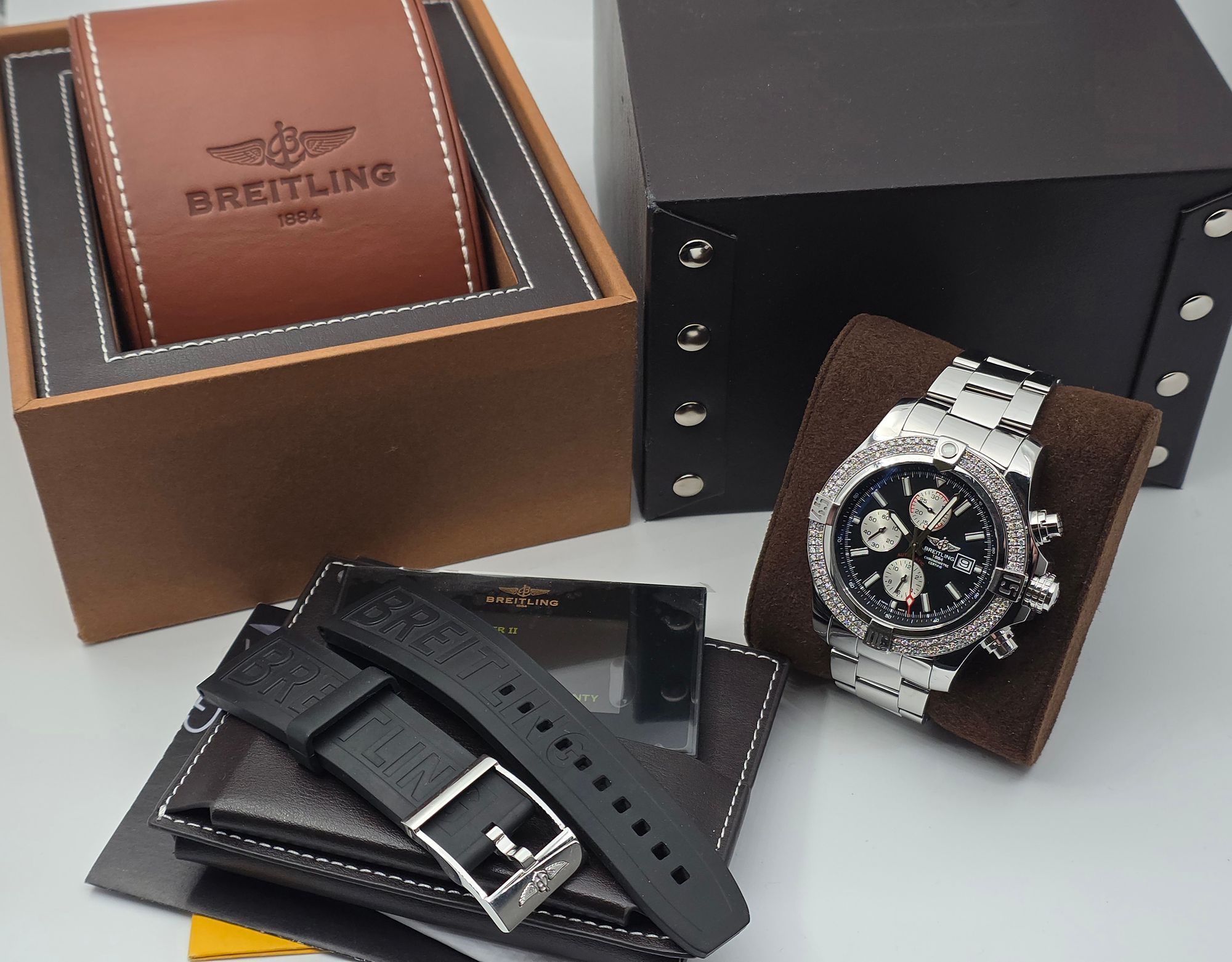 Suurikokoisten kellojen ystäville tarjolla röyhkeän upea Breitling Super Avenger II 48mm. Tässä kellossa yhdistyvät kauttaaltaan kiiltävä pinta ja timanttibezel, luoden hyvin huomiota herättävän kokonaisuuden. Kyseessä on siistikuntoinen Fullset vuodelta 05/2017 valmistajan terä- ja kumirannekkeilla. Kellon huollontarve on tarkistettu sepäm toimesta 05/2025, ja koneisto on todettu moitteettomaksi (dokumentaatio mukaan). Tämä Avenger on todellinen katseenvangitsija!