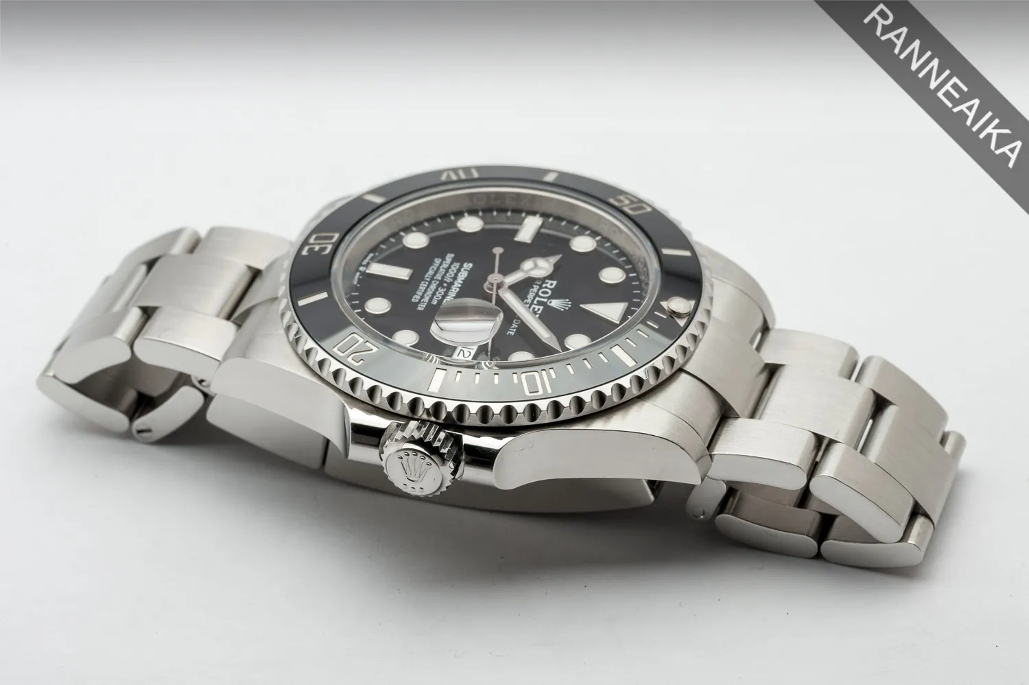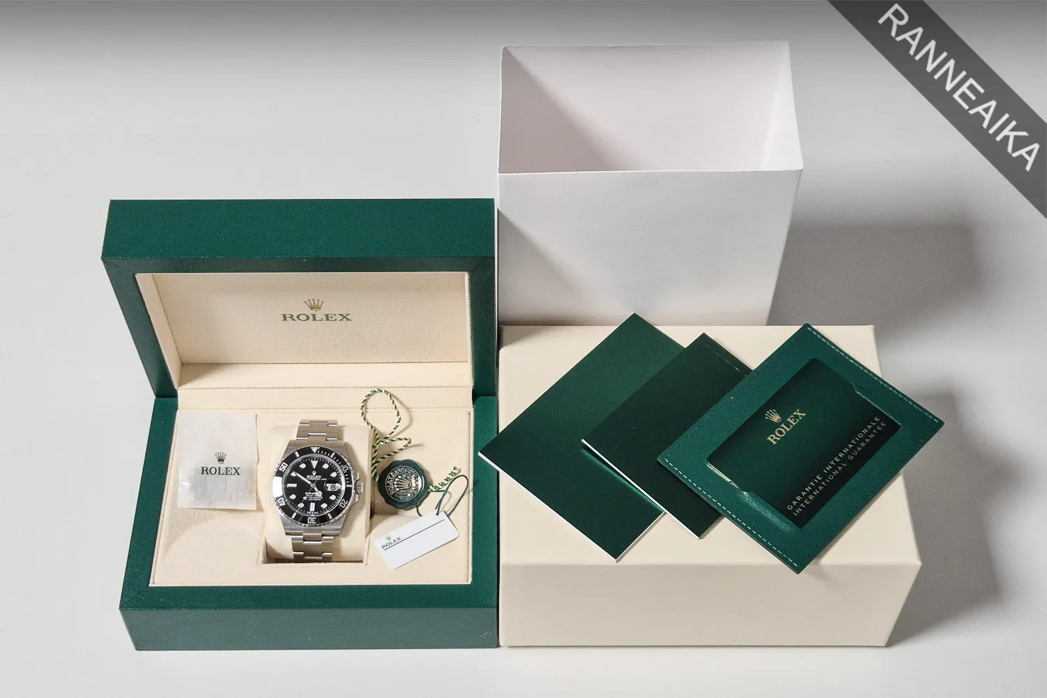 Mustalla keraamisella kehällä ja päivyrillä varustettu teräksinen klassikkodiver jollainen tulisi löytyä jokaisen kelloharrastajan kokoelmasta. Kyseessä on viimeisin, syksyllä 2020 julkaistu malli erinomaiset mittasuhteet omaavalla linjakkaalla 41-millisellä kuorella sekä leveämmällä 21-millisellä rannekkeella. Sisällä tikittää tarkasti uudistettu Rolex cal. 3235 -automaattikoneisto. Kellon paperit on päivätty 10/2023 ja valmistajan 5v takuu on voimassa 10/2028 asti. Mukaan alkuperäinen takuukortti, korttitasku, käyttöopas, huolto-opas, molemmat hang tagit sekä molemmat laatikot + kartonkinen suojahiha. Tästä useiden vuosien jonot omaava sportti-Rolex suoraan ranteeseen!