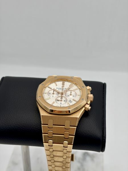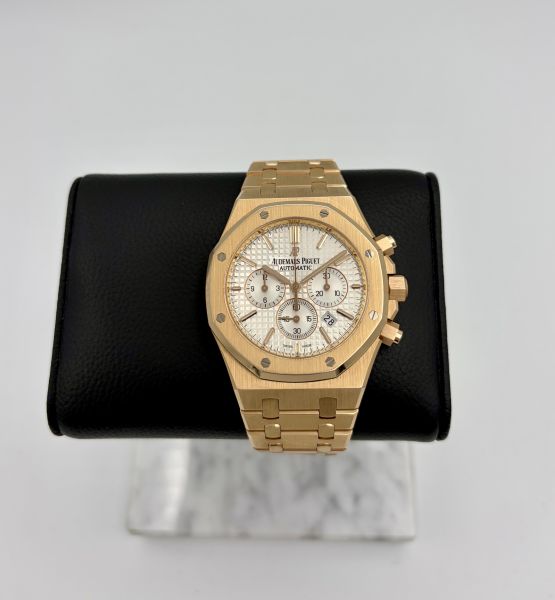 Tuotannosta jo poistunut klassikko Audemars Piguet Royal Oak Chronograph ref 26320OR.OO.D088CR.01 ruusukultaisena. APn valkoinen vohvelitaulu on super näyttävä, vertaansa vailla. Kellossa koneistona toimii calibre 2385, 40h käyntivaralla. Kellon mukana tulee alkuperäiset paperit sekä laatikot. Kellon paperit on päivätty 3/2016. Tämä yksilö on hiljattain huollettu APlla ja siitä on takuut päällä 11/2027 asti. Royal Oakille tyypilliset viisteet ovat edelleen tässä yksilössä todella skarpit. APn kohdalla ammattitaidoton kelloseppä voi pahimmassa tapauksessa pilata kellon alkuperäiset muodot. Tämän takia tehdashuollettuja yksilöitä arvostetaan suuresti markkinoilla. Nyt Super näyttävä AP heti valmiina uuteen ranteeseen!
