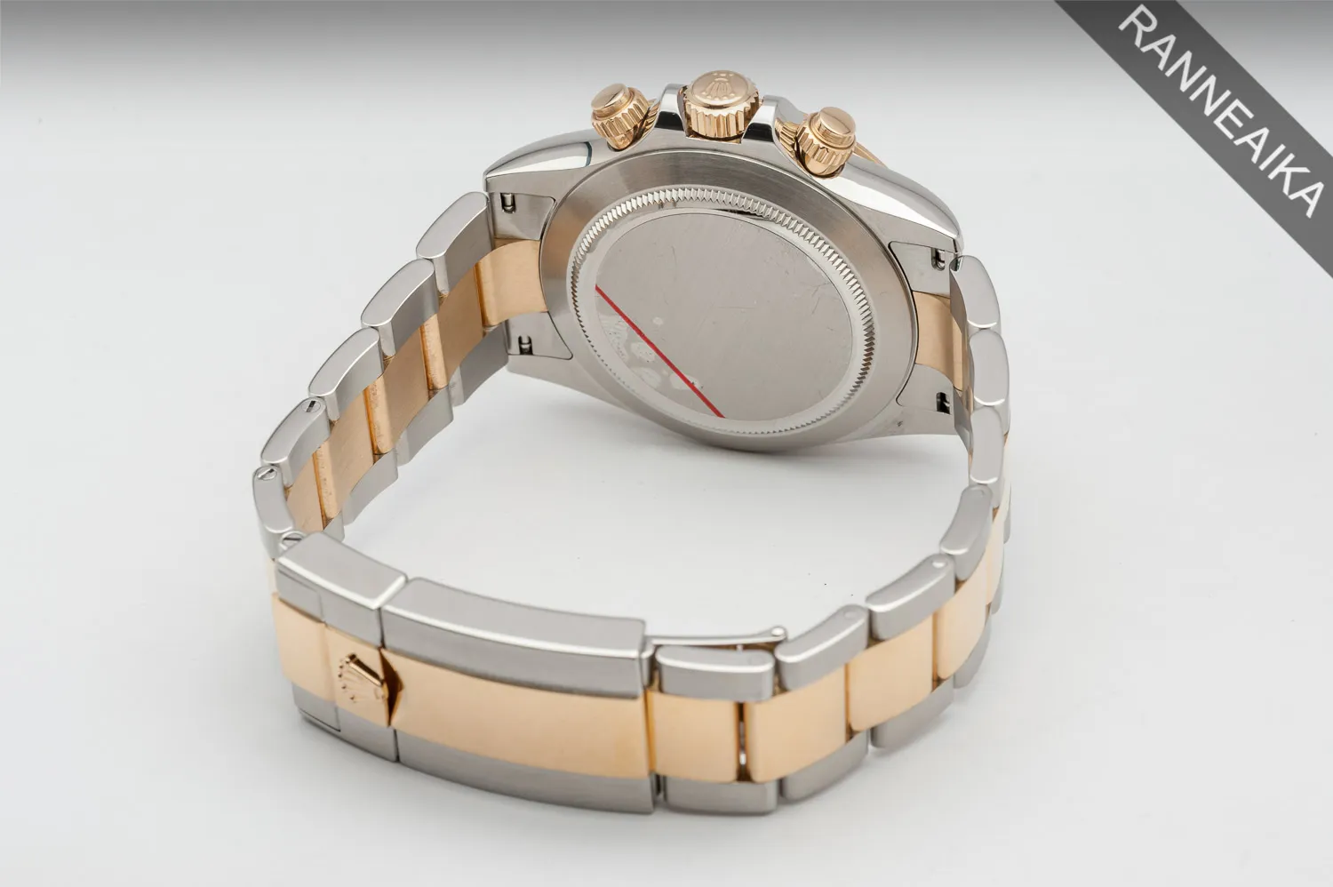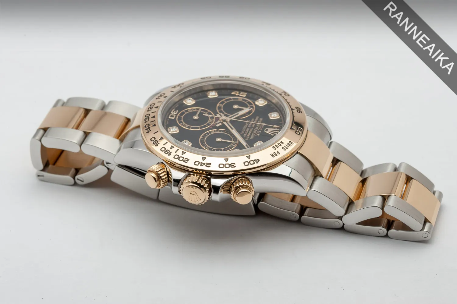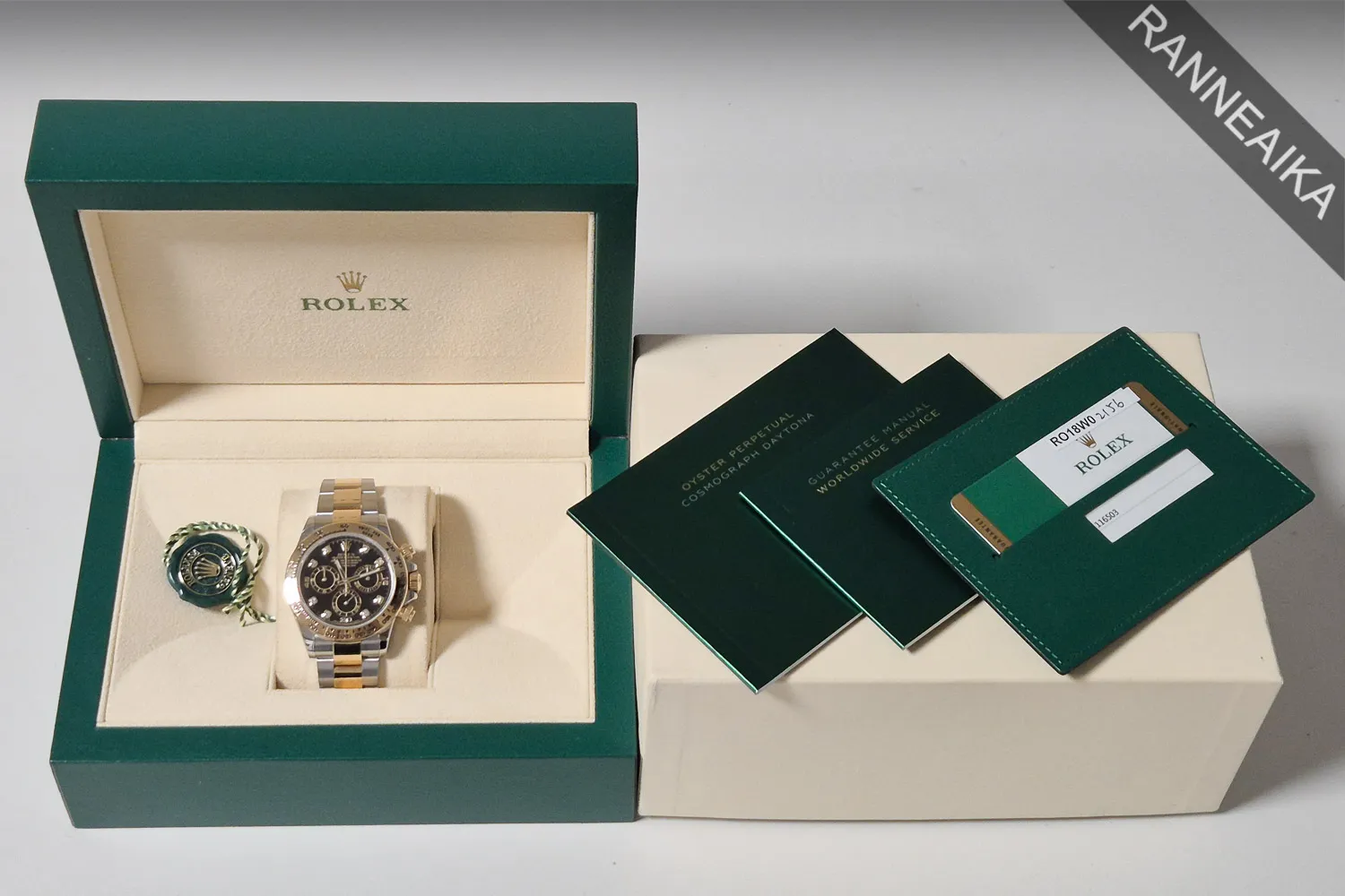 Todella näyttävä ja erittäin haluttu teräs/kultainen Daytona. Sulavan linjakas, matala teräskuori yhdessä kolmirivisen Oyster-rannekkeen kanssa tarjoavat erinomaisen ranneistuvuuden. Kellon nupit, kehä sekä rannekkeen keskipalat ovat 18 karaatin keltakultaa. Selkeälukuista mustaa, timantein koristeltua taulua suojaa safiirilasi ja takapuolen teräspohjan alla tikittää tarkasti Rolex 4130 -automaattikoneisto. Ruuvilukittavat kronopainikkeet sekä -nuppi pitävät huolen 100 metrin vesitiiviydestä. Kellon paperit on päivätty 07/2018 ja se käy erinomaisin käyntiarvoin. Mukaan kaikki alkuperäiset paperit, korttitasku, molemmat hang tagit, kaikki rannekkeen palat sekä molemmat laatikot.