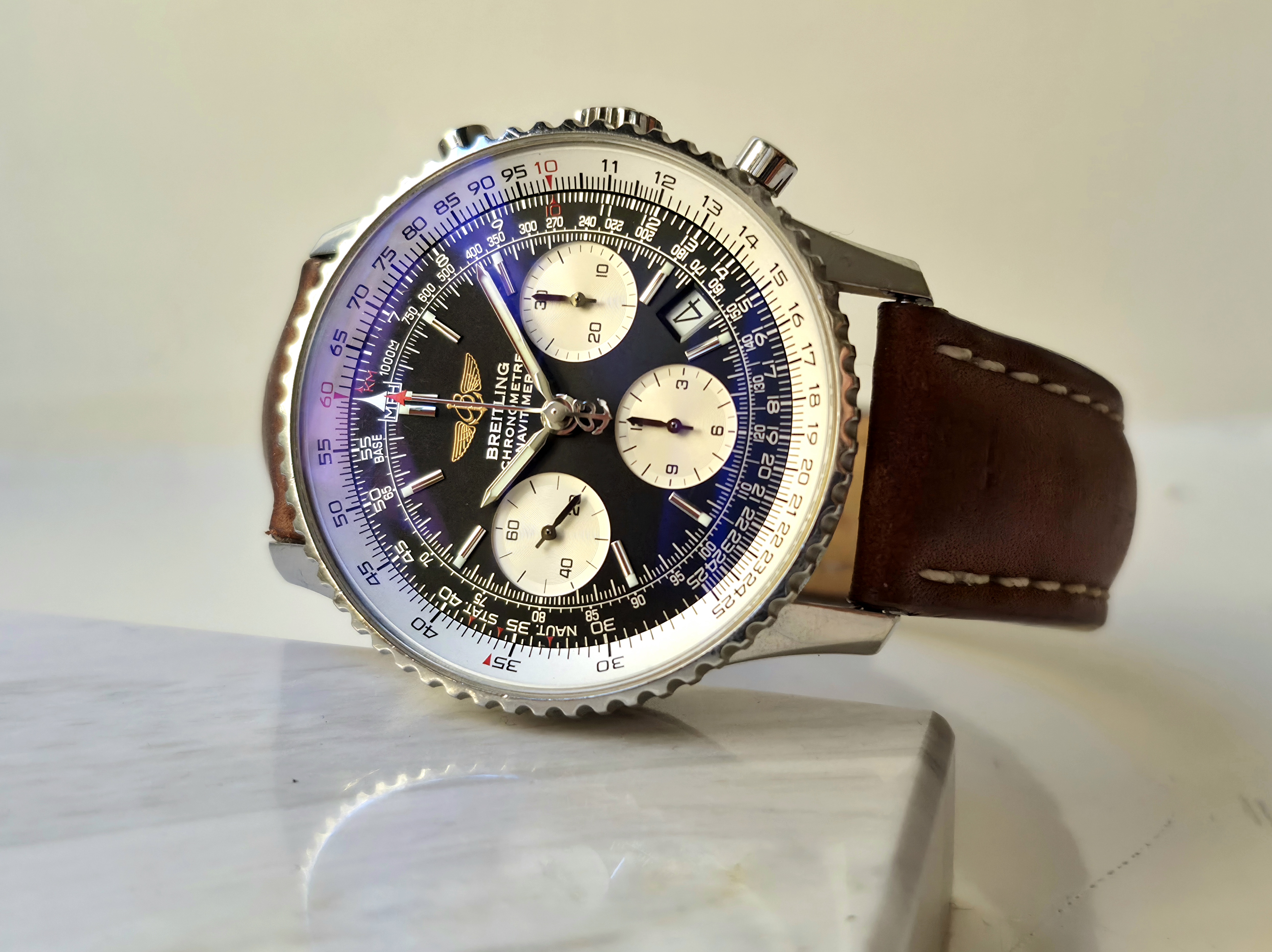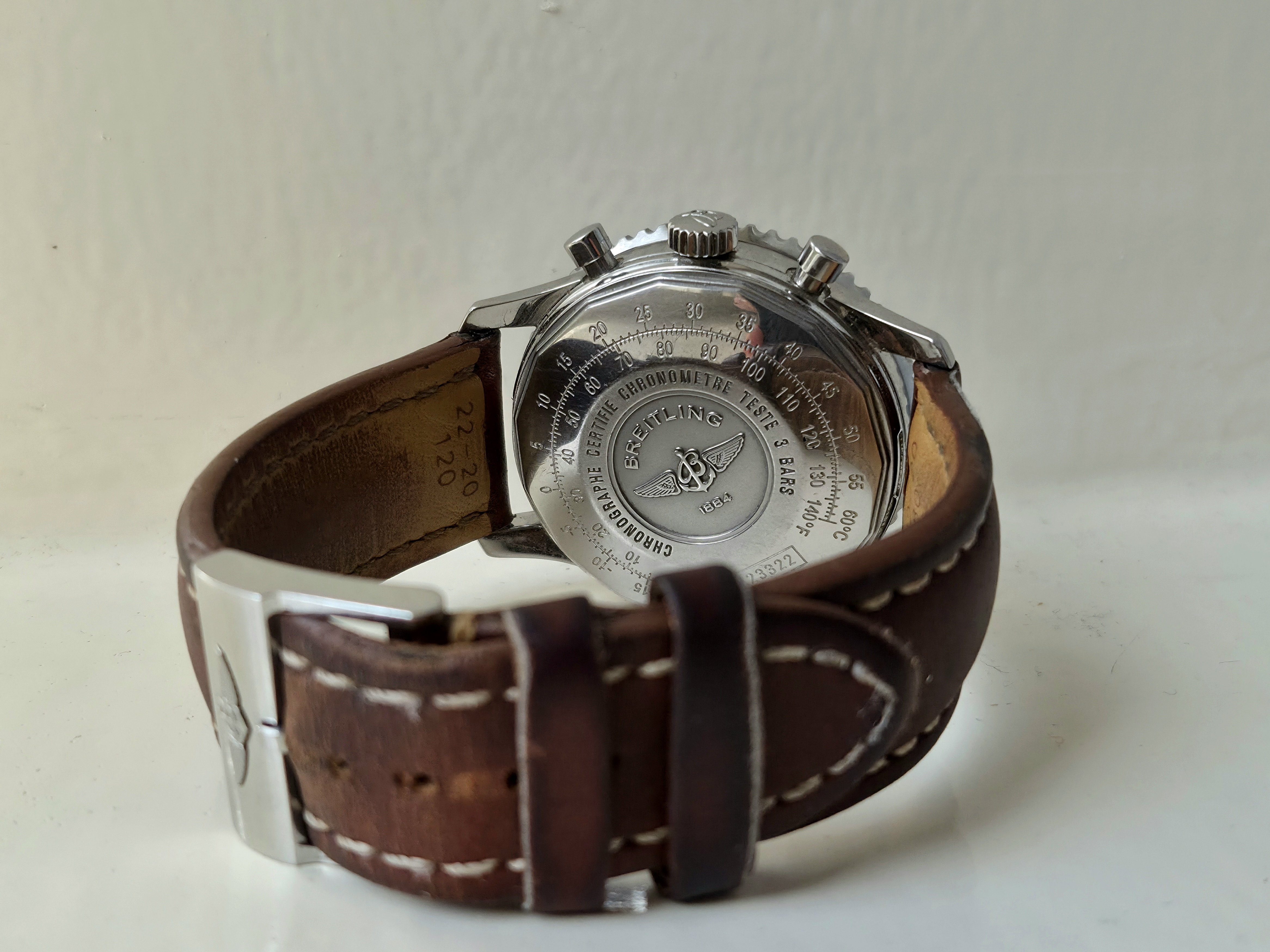 Tyylikäs ja hienokuntoinen klassikko! Tämä ikoninen ilmailukello on ollut tuotannossa noin 2003-2011 ja siitä löytyy valtavasti ominaisuuksia, mm. Valjoux 7753 pohjautuva automaattinen kronografikoneisto, safiirilasi AR -pinnoituksella, päivyri kello neljän ja viiden välissä sekä lentoaikojen laskemiseen tarkoitettu liukusäädin. Tämä malli edustaa viimeisiä sukupolvia ennen Breitlingin in-house -koneistoja.