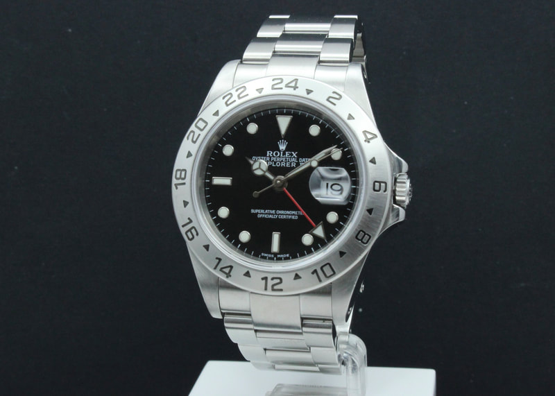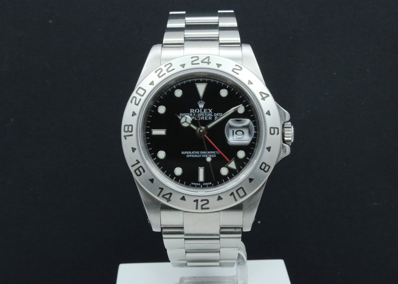 Hyväkuntoinen Rolex Explorer II 16570 mustalla taululla, joka on Y-sarjaa eli n. vuodelta 2002. Kellossa 3185 automaattikoneisto, joka käy tarkasti ja on siistissä kunnossa, sekä se on huollettu RSC-huollossa heinäkuussa 2018 (Rolex Service Center). Ranneke 78790 SEL-oysterranneke (Solid End Link) DT10-claspkoodilla (2002), eikä siinä ole venymää. Mukaan boksit, manuaali, RSC-huoltotodistus. Ei alkuperäistä takuutodistusta.