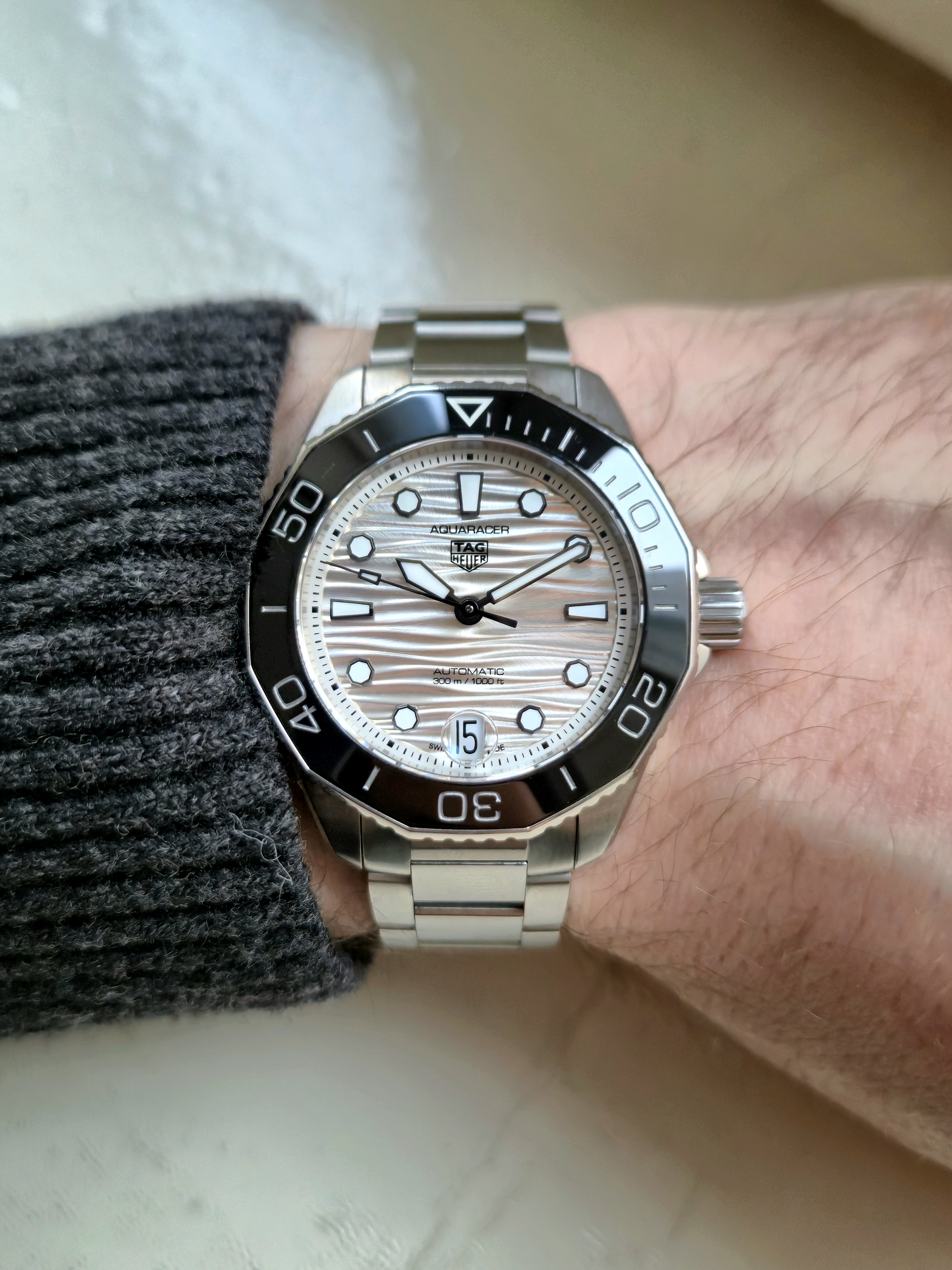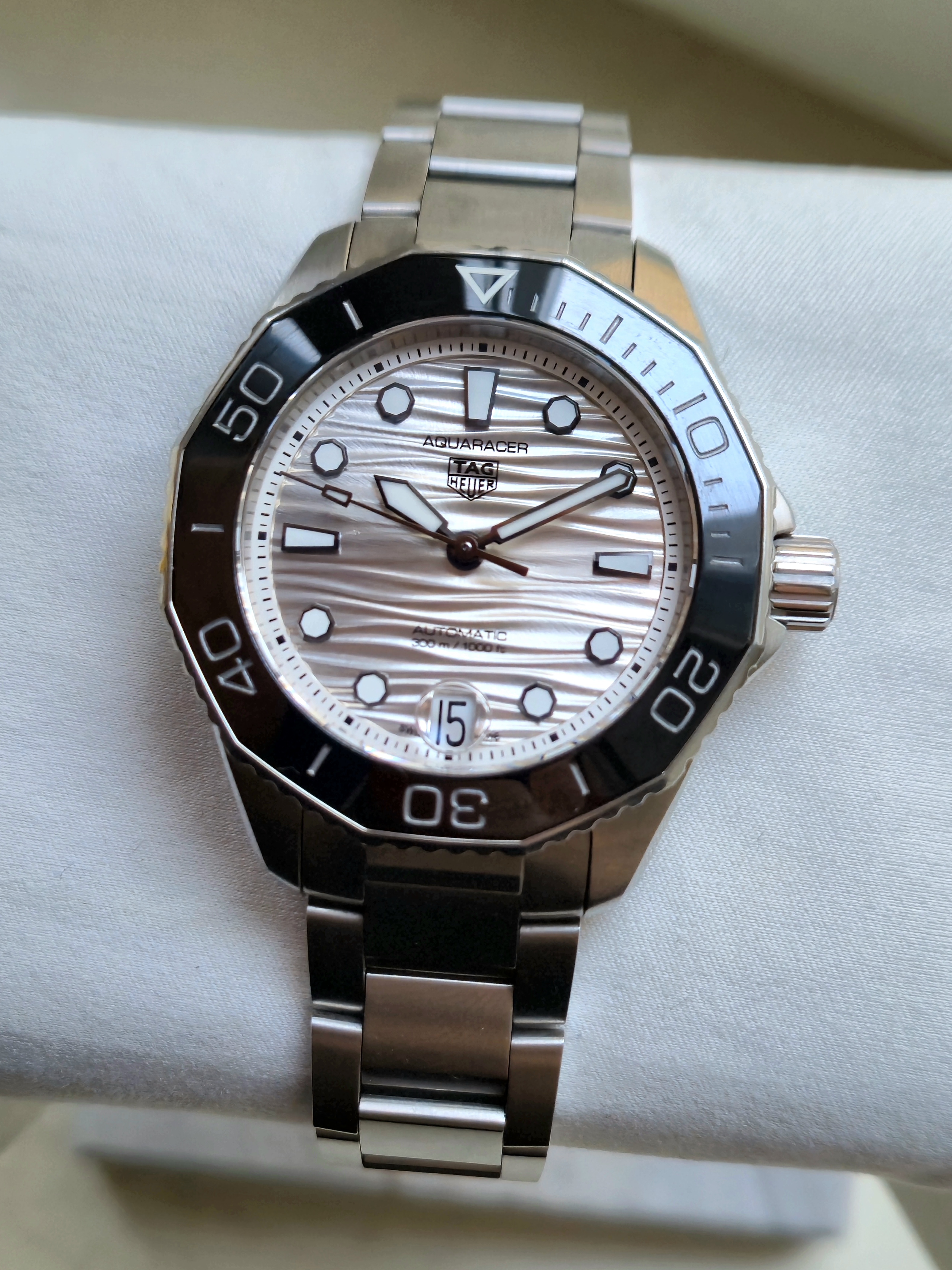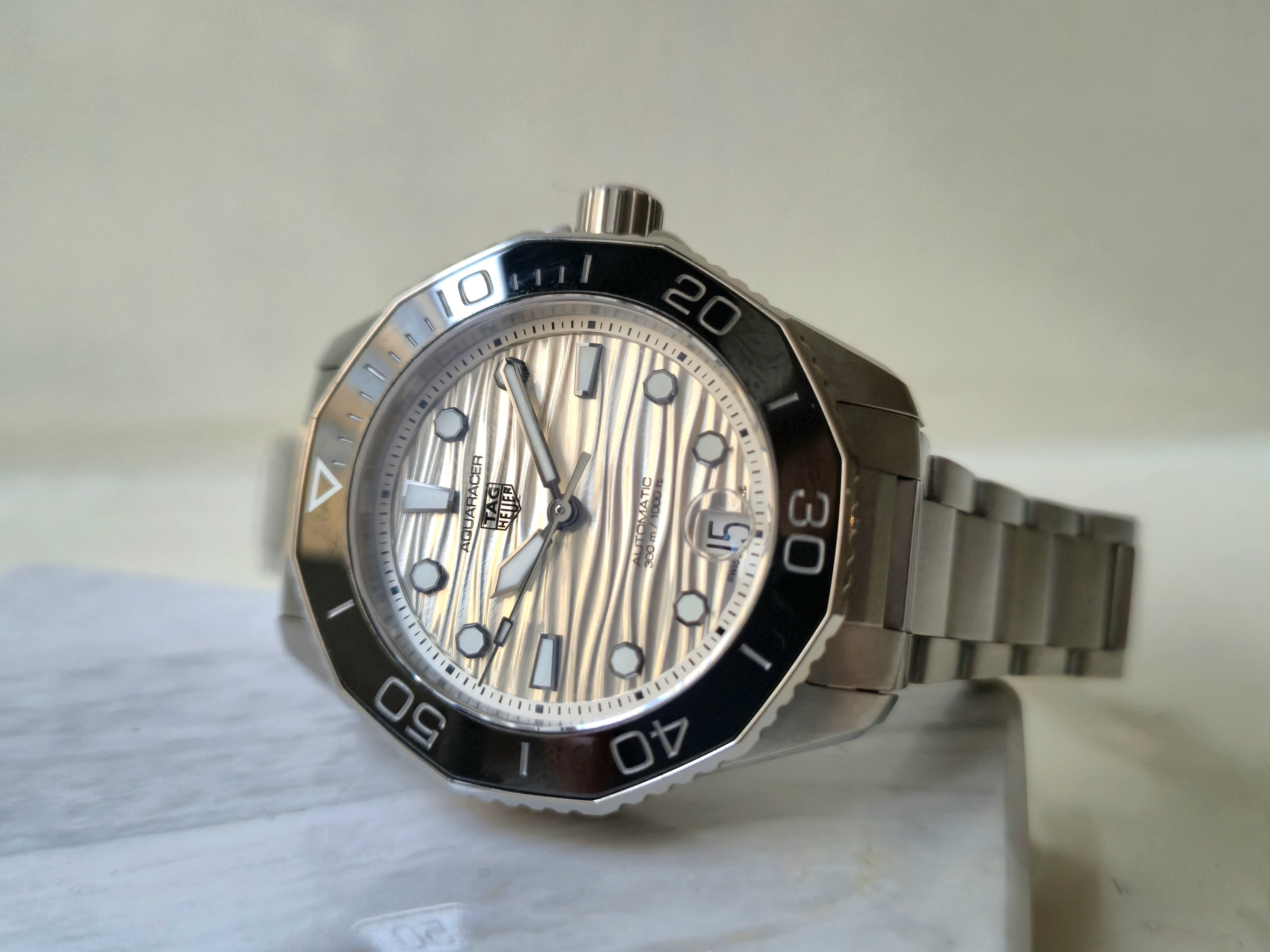 Tyylikäs uudemman mallin Aquaracer upealla vaalealla taululla, sekä pienemmällä 36mm kopalla. Kellosta löytyy mm. Calibre 5 automaattikoneisto, keraaminen bezel sekä pikasäädöllinen clasp.