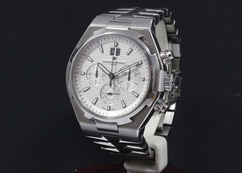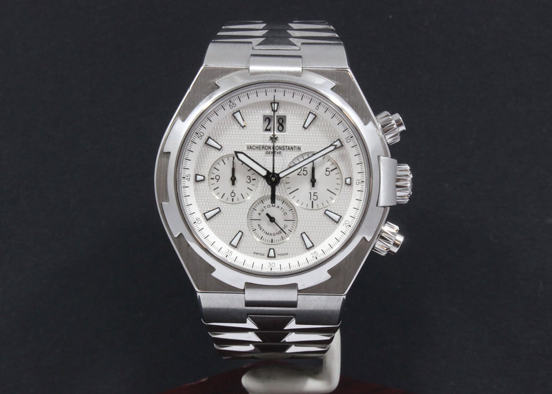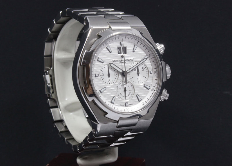 Loistokuntoinen Vacheron Constantin Overseas 49150 vuodelta 2009, joka täyshuollettu tehtaalla 2021. Tässä kellossa erittäin upea ''guilloiché'' kuvioitu hopean värinen kellotaulu, jossa klo 12 Big Date päivyri. Erittäin loistava ranneistuvuus ja design, palat riittää n. 19cm ranteeseen. Koneistona tarkkakäyntinen inhouse 1137 anti-magneettinen kronografiautomaattikoneisto. Mukaan ulkokartonki, boksit, kiilloitusliina, takuu- ja manuaalivihkot sekä huoltotodistus 2021 huollosta.