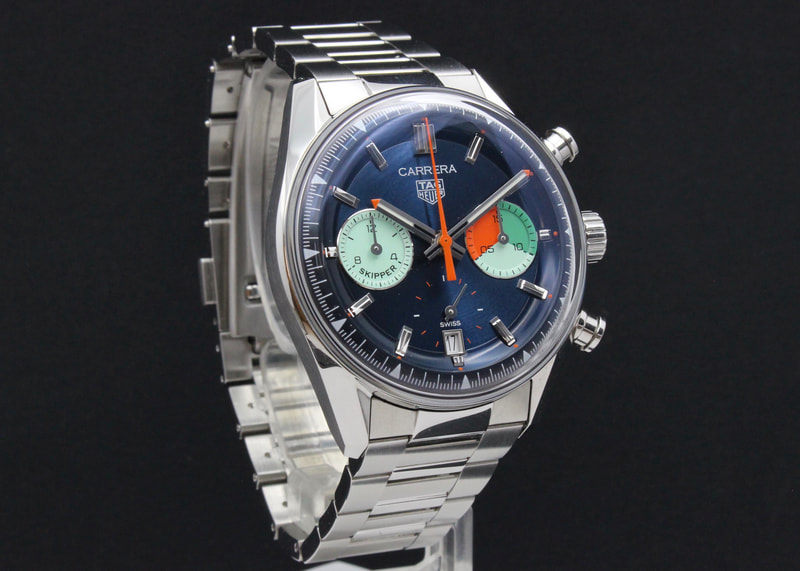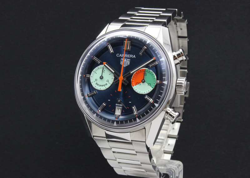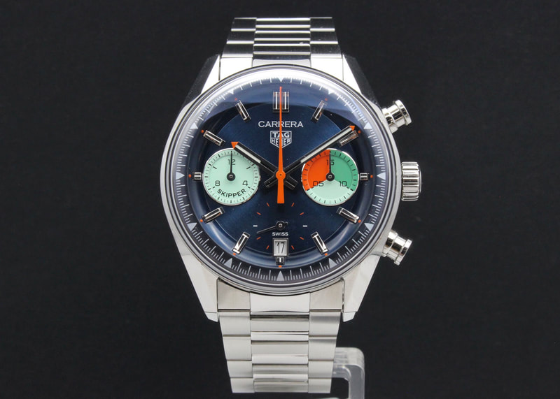 Hieno Tag Heuer Carrera Skipper Chronograph upealla värikkäällä taululla ja glassbox-safiirilasilla. Kello on ostettu uutena heinäkuussa 2023 ja AD-liike tarjoaa ekstratakuun 7/2026 asti. Tähän on ostettu Tag Heuerin metalliranneke, ja alkuperäinen tekstiiliranneke omalla soljella löytyy myös. Mukaan boksit, manuaali, takuukortti, hangtag ja tekstiiliranneke. Ovh. 7 500€ ilman metalliranneketta.