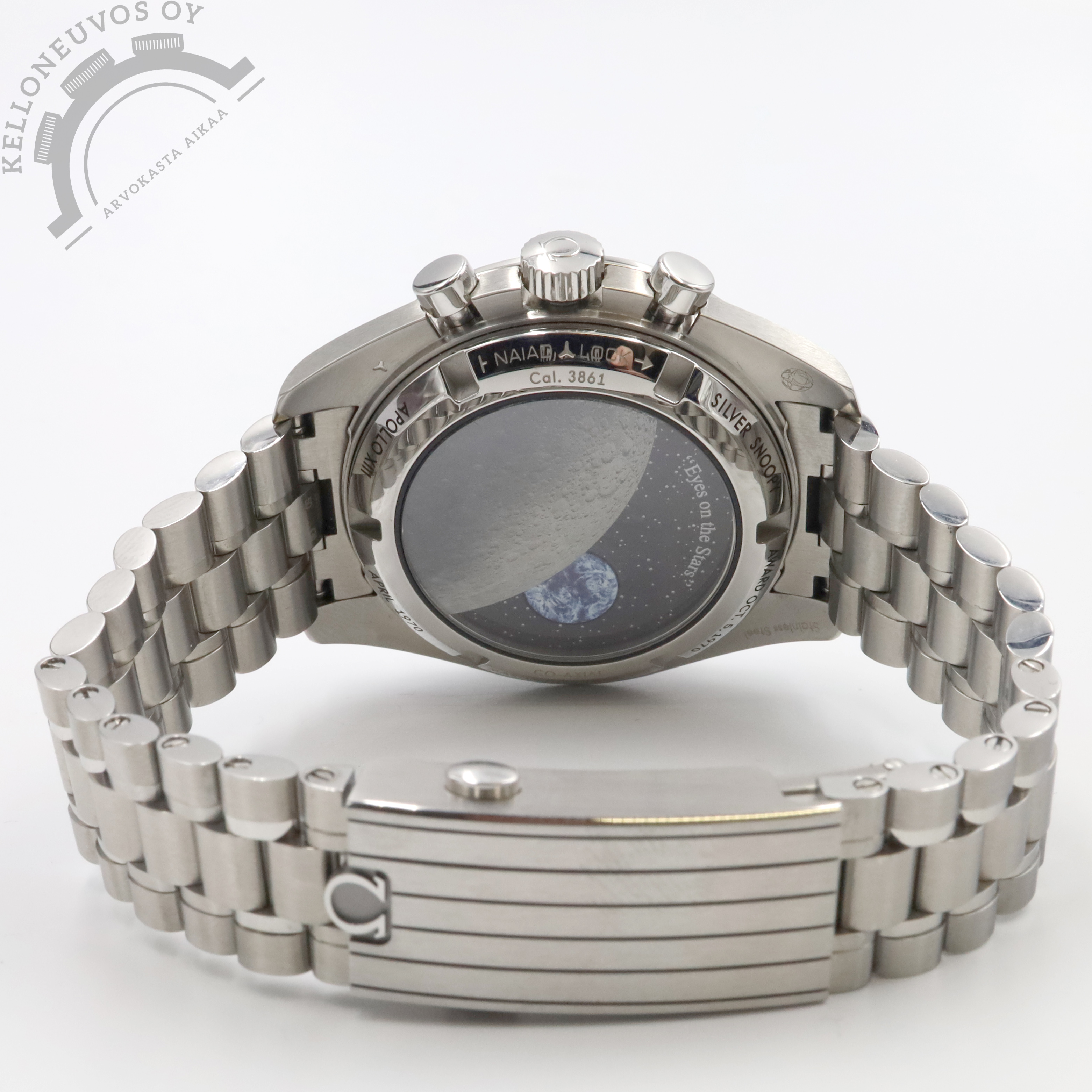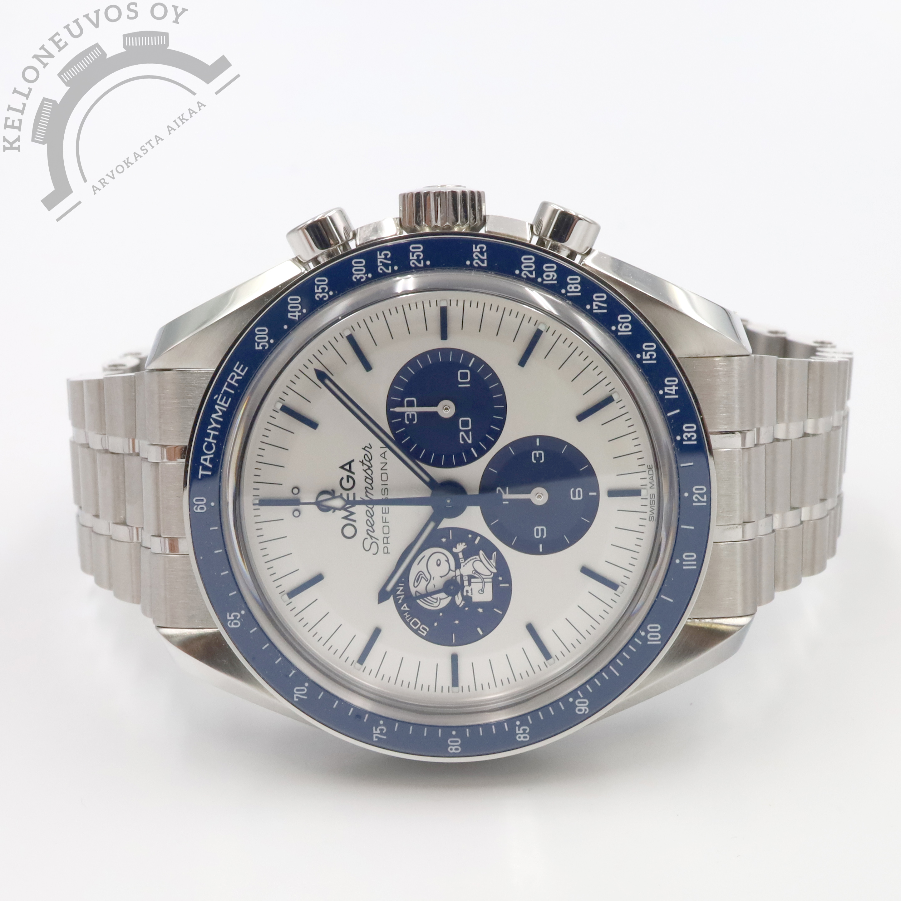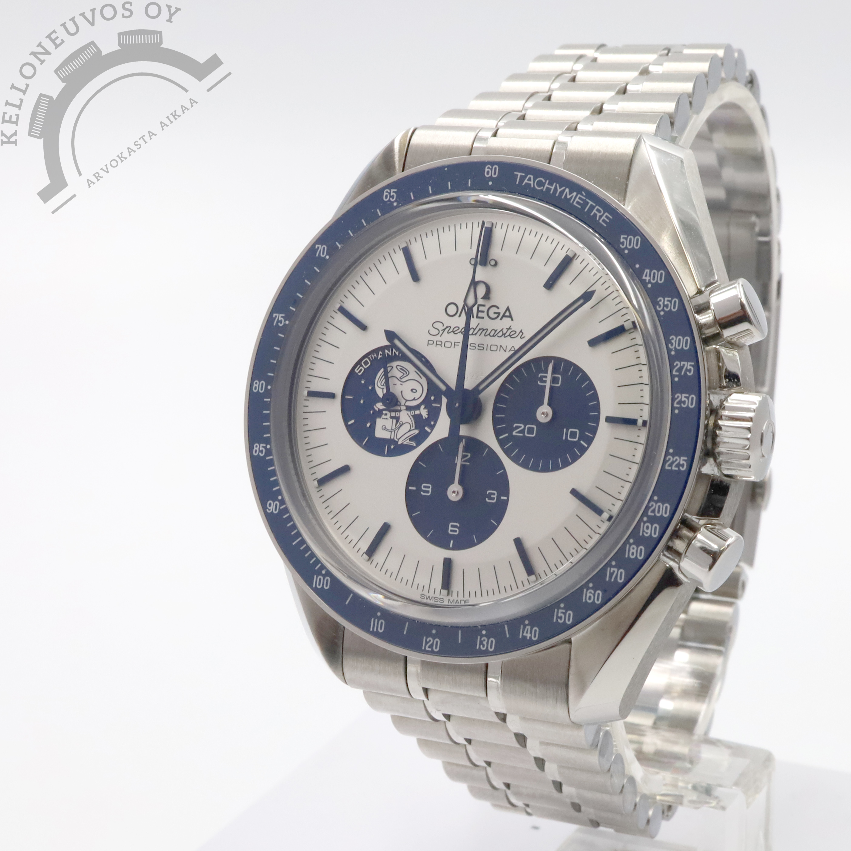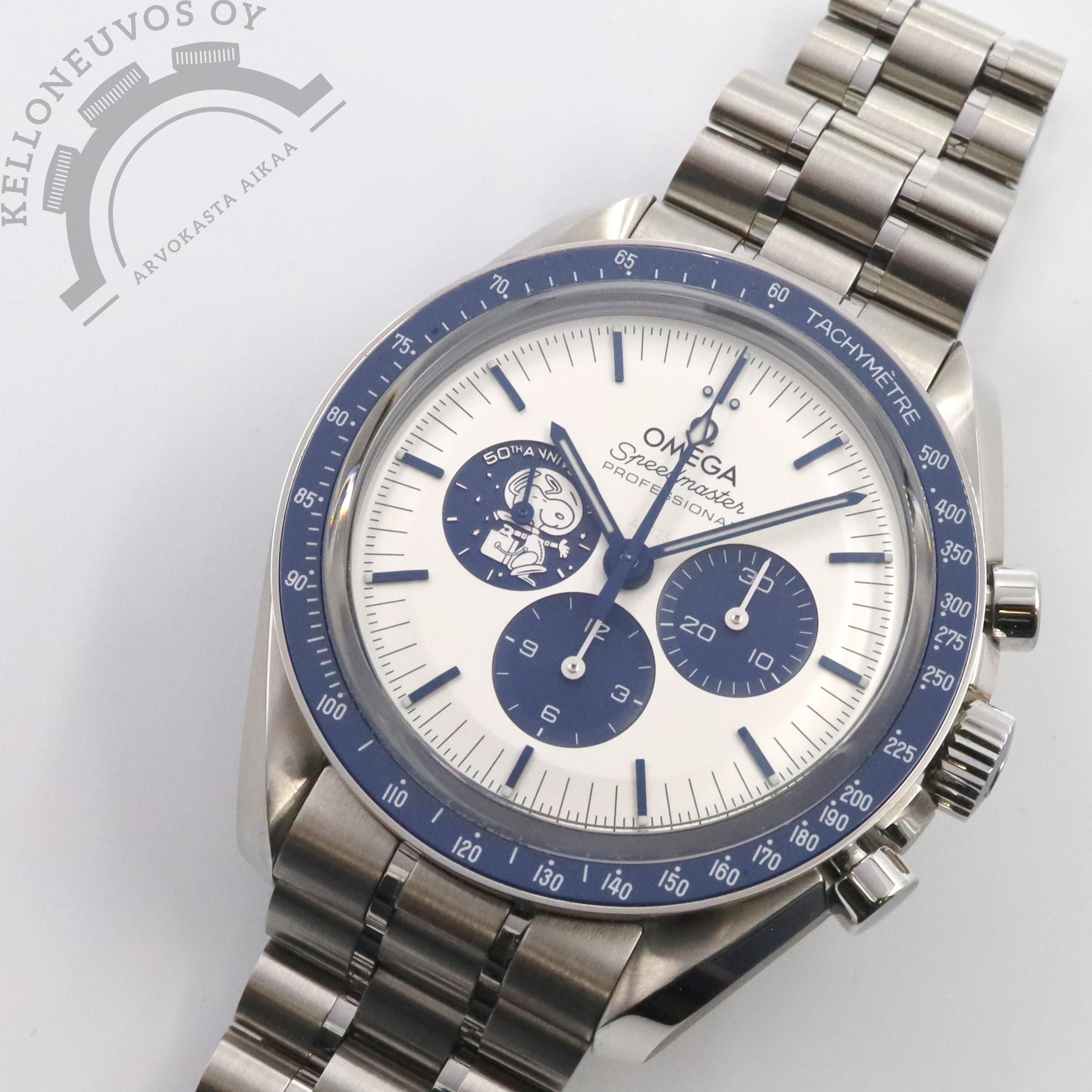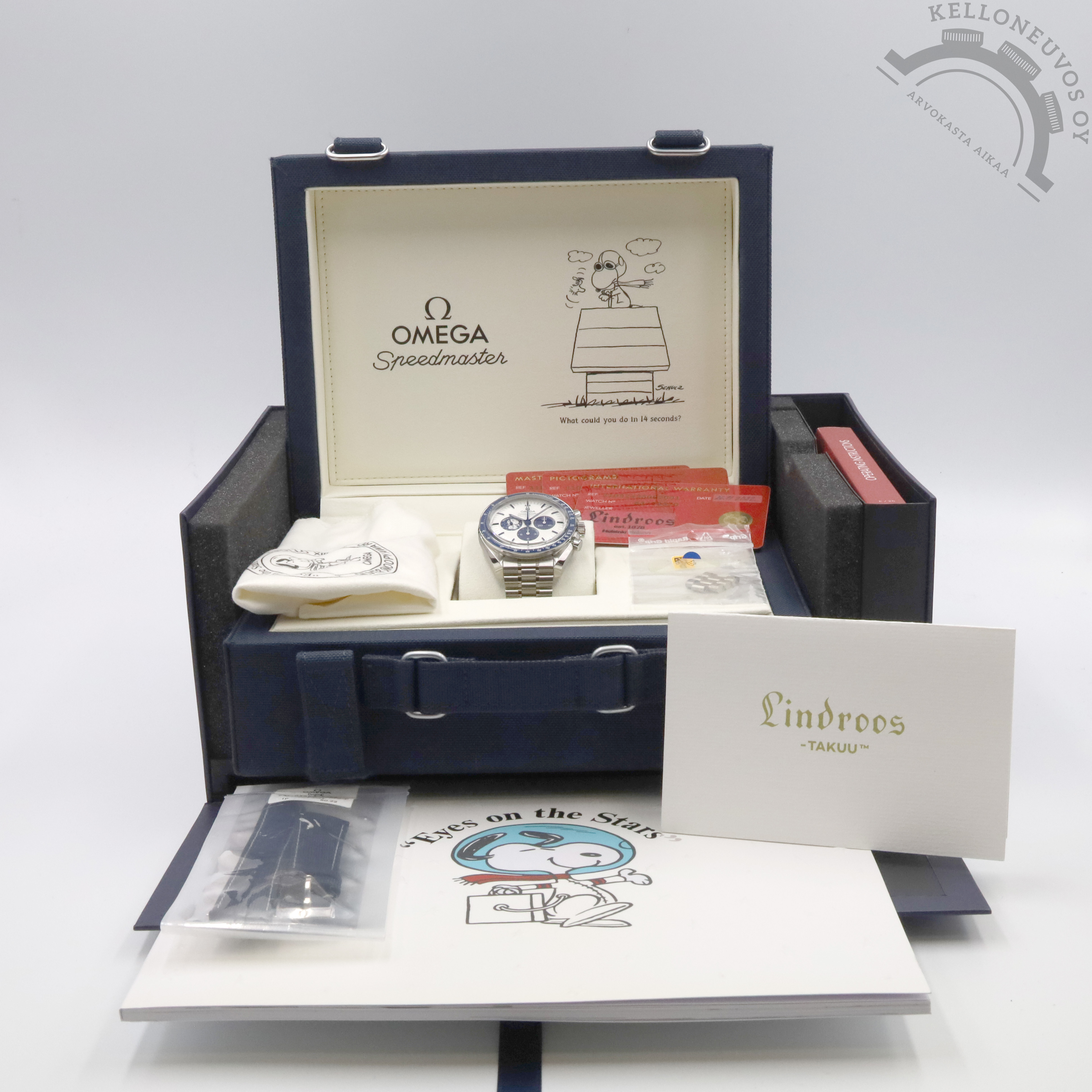 Tarjolle erittäin haluttu, äärimmäisen vaikeasti saatavilla oleva Silver Snoopy Award! Täysin käyttämätön yksilö! Tämä 50-vuotisjuhlamalli on kunnianosoitus ”Silver Snoopy Award” -palkinnolle, jonka Omega sai NASA:n astronauteilta vuonna 1970 tunnustuksena brändin panoksesta avaruustutkimukseen mukaan lukiaen Apollo 13 lennon. Upealla hopean värisellä kellotaululla jossa näyttävät siniset osoittimet ja indeksit sekä niinikään siniset pikkutaulut joissa vasemmanpuoleisessa kohokuvioitu hopeinen Snoopy-medaljonki. 42mm teräksinen kuori sinisellä keraamisella kehällä jossa valkoisella emaloitu takymetri-skaala. Naiad lock -takakannessa kuun kääntöpuoli on kuvattuna safiirilasille mikrostrukturoidulla metalloinnilla jossa animoitu Snoopy komentomoduulissaan liikkuu ”taianomaisella” varrella joka pyörii kronografitoimintoa käyttäessä. Taustalla maapalloa esittävä levy pyörii kerran minuutissa synkronoituna kellon pienen sekuntiosoittimen kanssa. Täys setti joka toimitetaan erikoisesittely laatikolla. Kellon takuukortti on päivätty kotimaisen jälleenmyyjän toimesta 11/2022. Lisäksi kelloon on hankittu erikseen malliin kuuluva teräsranneke, sininen nailonkankainen ranneke omalla soljella avaamattomassa paketissa. Tästä suoraan varastosta uutta rannetta koristamaan tai keräilyyn ilman vuosien jonotusta.