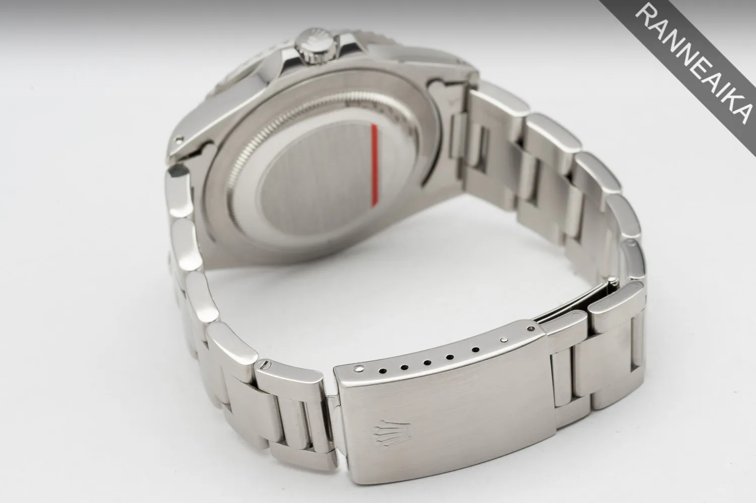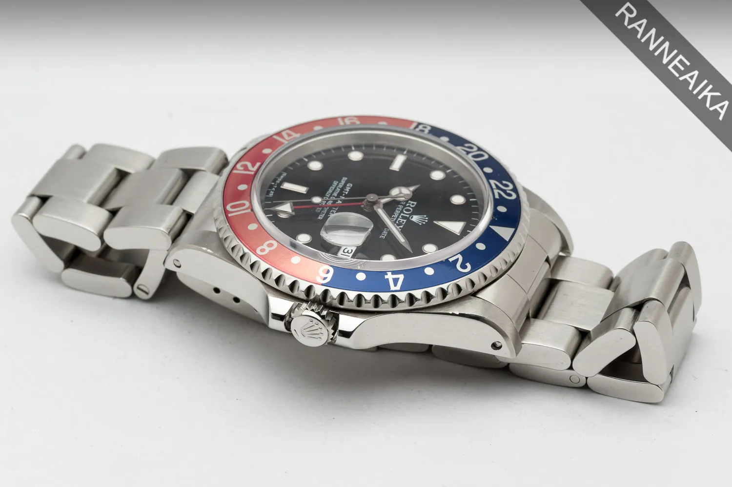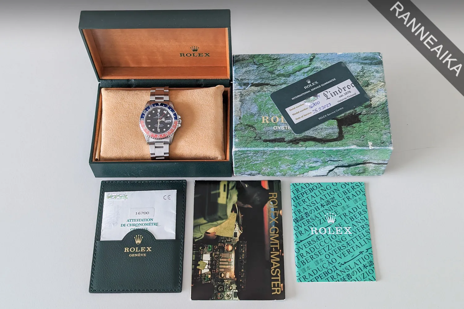 Kauniisti patinoitunut, tuotannosta jo poistunut ja erittäin haluttu GMT-Master “Pepsi”. Tämä keräilijöiden suosiossa oleva GMT-kaksoisaikakomplikaatiolla varustettu sportti-Rolex on saanut erästä virvoitusjuomavalmistajaa mukailevan Pepsi-lisänimensä kellon peltikehän sinipunaisesta värityksestä. Erinomaisen ranneistuvuuden takaa kolmirivinen Oyster-ranneke. Edessä safiirilasi ja niin ikään kellon alkuperäinen musta taulu, jossa myös kykloopilla varustettu selkeälukuinen päivyri. Teräksisen takakannen sisällä tikittää tarkasti Rolex cal. 3175 -automaattikoneisto. Kellon alkuperäinen takuutodistus on päivätty 04/1997 ja se on huollettu 09/2023 – huoltotakuu on voimassa 09/2025 asti. Mukaan alkuperäiset paperit, dokumenttitasku, RSC-huoltokortti viimeisimmästä huollosta sekä molemmat laatikot. Tästä tuoreen huoltohistorian omaava, näyttävä ja haluttu GMT-Master niin arkeen, juhlaan tai vaikkapa keräilyyn!
