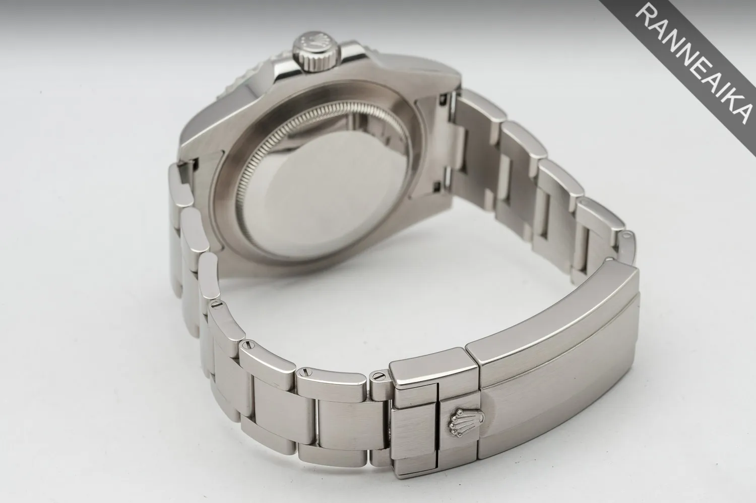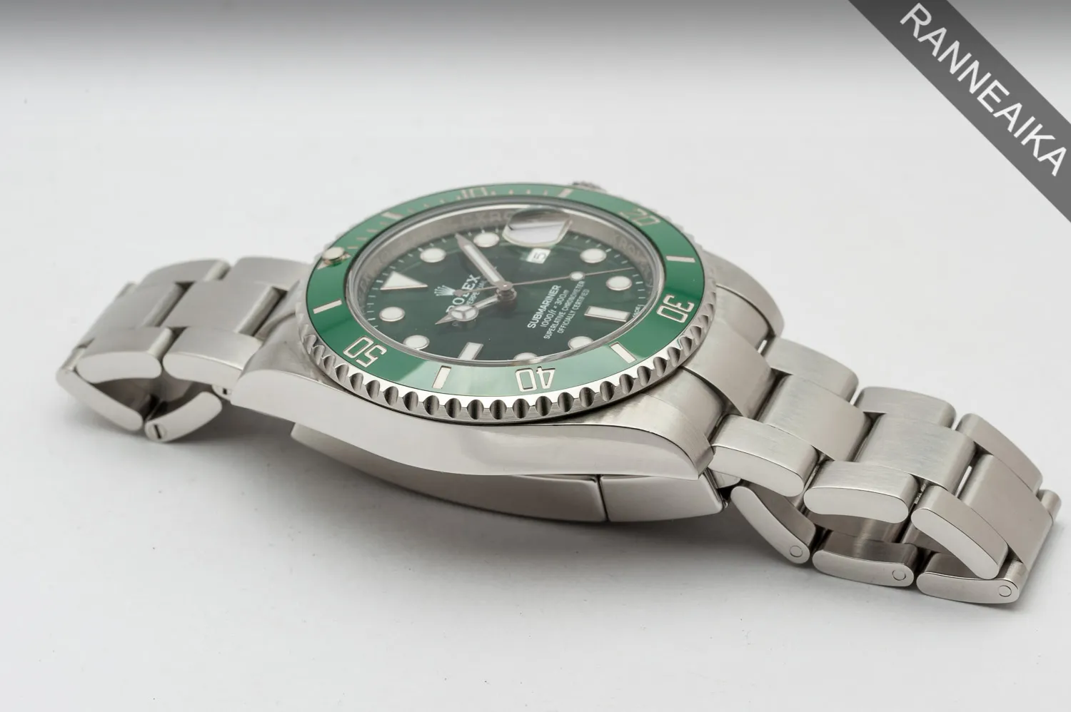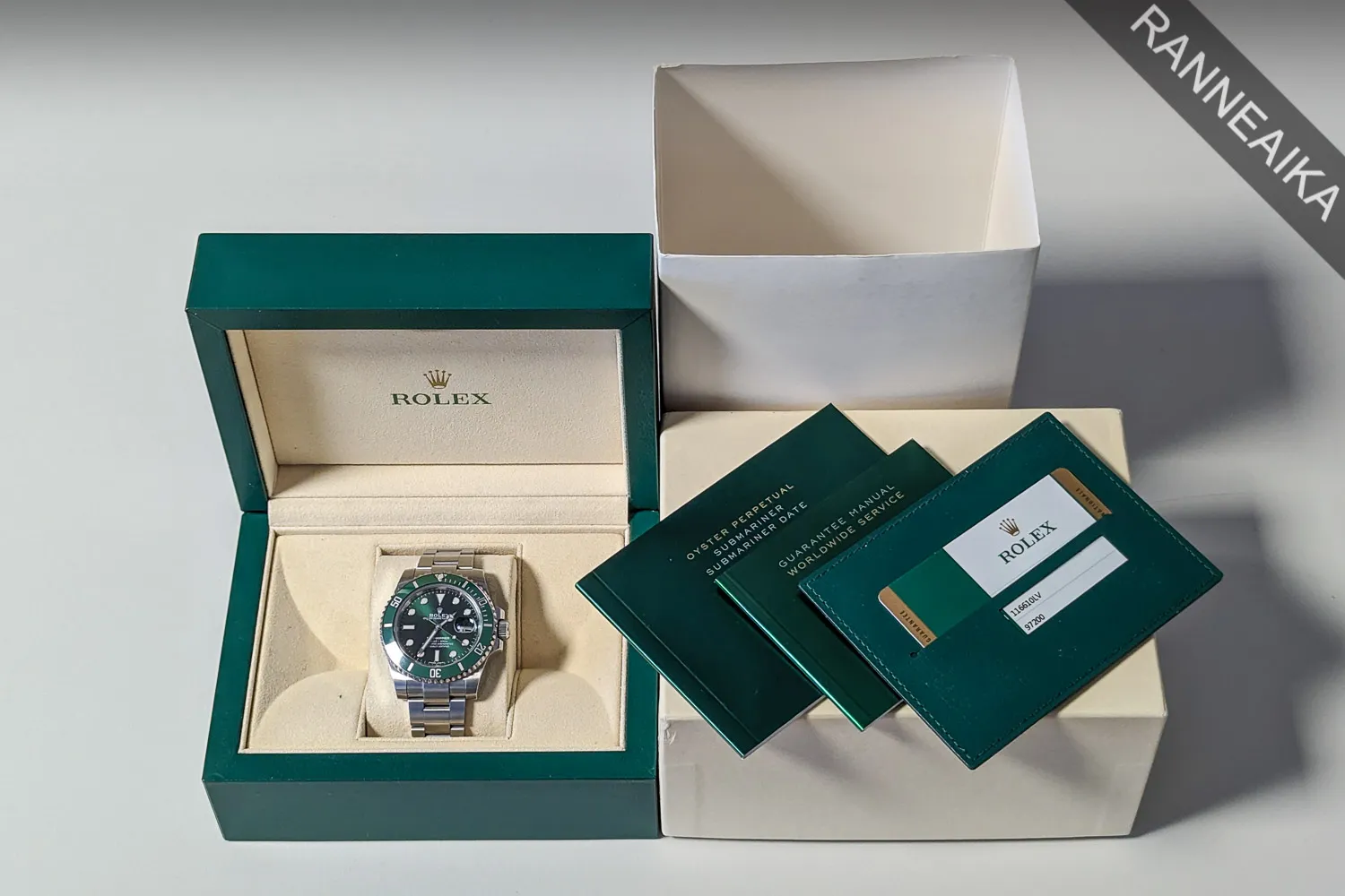 Erittäin haluttu vihreällä keraamisella kehällä, upealla vihrellä sunburst-taululla sekä päivyrillä varustettu teräksinen “Hulk”, jollainen tulisi löytyä jokaisen harrastajan kokoelmasta. Teräskuori, kolmirivinen pituuden hienosäädöllä varustettu oyster-ranneke sekä etupuolella päivyrin kykloopilla varustettu kestävä safiirilasi. Teräksisen takapohjan suojassa tikittää tarkasti luotettava Rolex cal. 3135 -automaattikoneisto. Kellon alkuperäinen takuukortti on päivätty 02/2017 ja se käy erinomaisin käyntiarvoin. Mukaan takuukortti, käyttöopas, huoltomanuaali, korttitasku sekä molemmat laatikot. Tästä huippuhaluttu ja näyttävä diver, joka tuotannon päättyessä 09/2020 jäi toistaiseksi viimeiseksi (sekä myöskin ainoaksi) vihreätauluiseksi Submariner-malliksi!