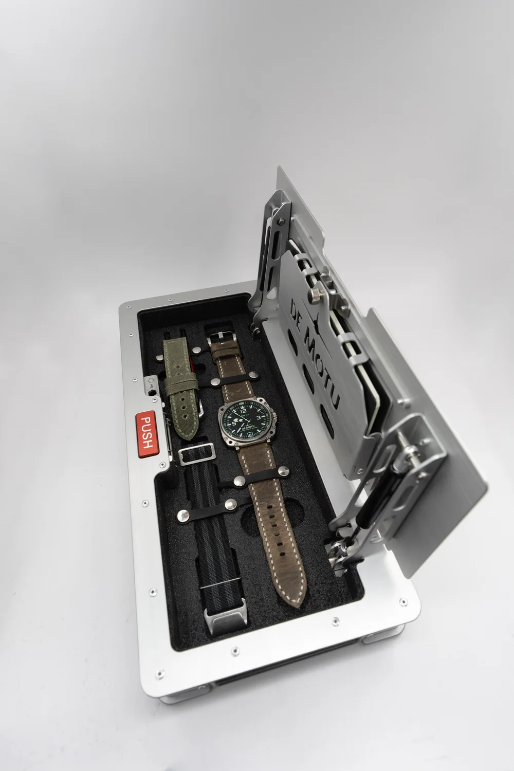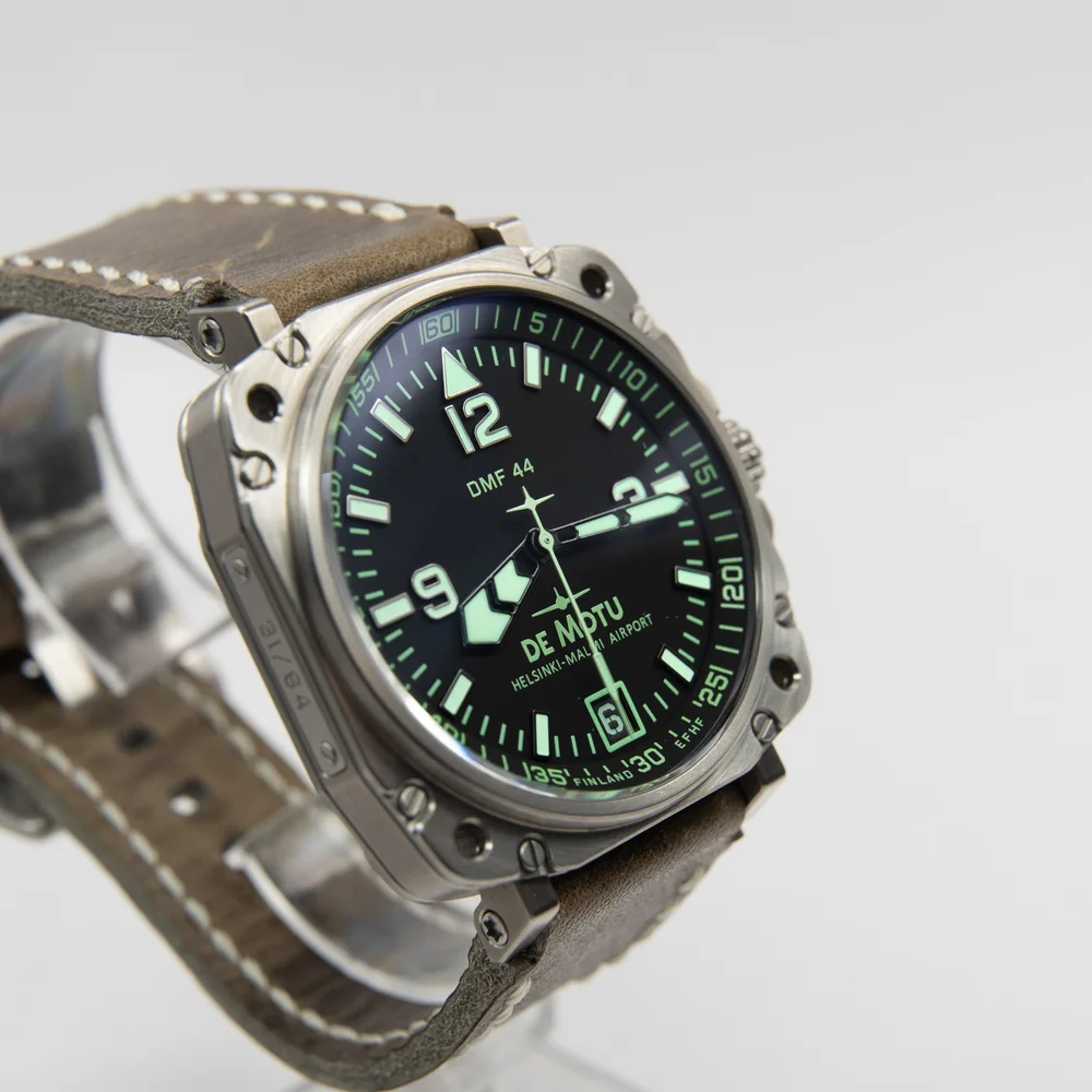 Virheettömässä kunnossa oleva erittäin haluttu De Motu DMF 44 Mk I ref. DMF 4401. Hävittäjälentäjien kanssa suunniteltu lippulaivamalli. Lähtökohtana oli hävittäjän ohjaamoinstrumenttien vaatimukset käytettävyydelle ja materiaaleille. Kellossa on hävittäjissä käytetty äärimmäisen voimakas lumeaine.