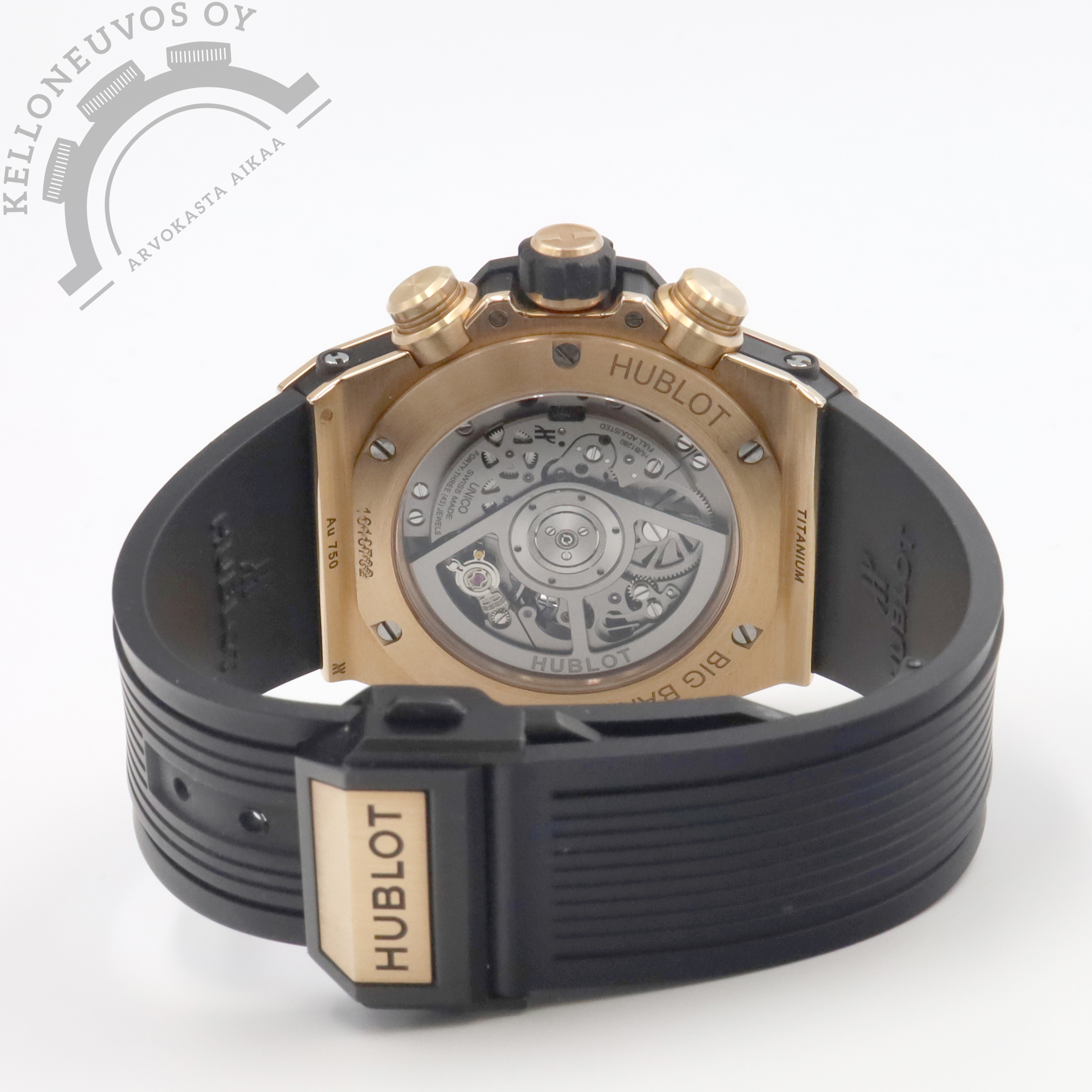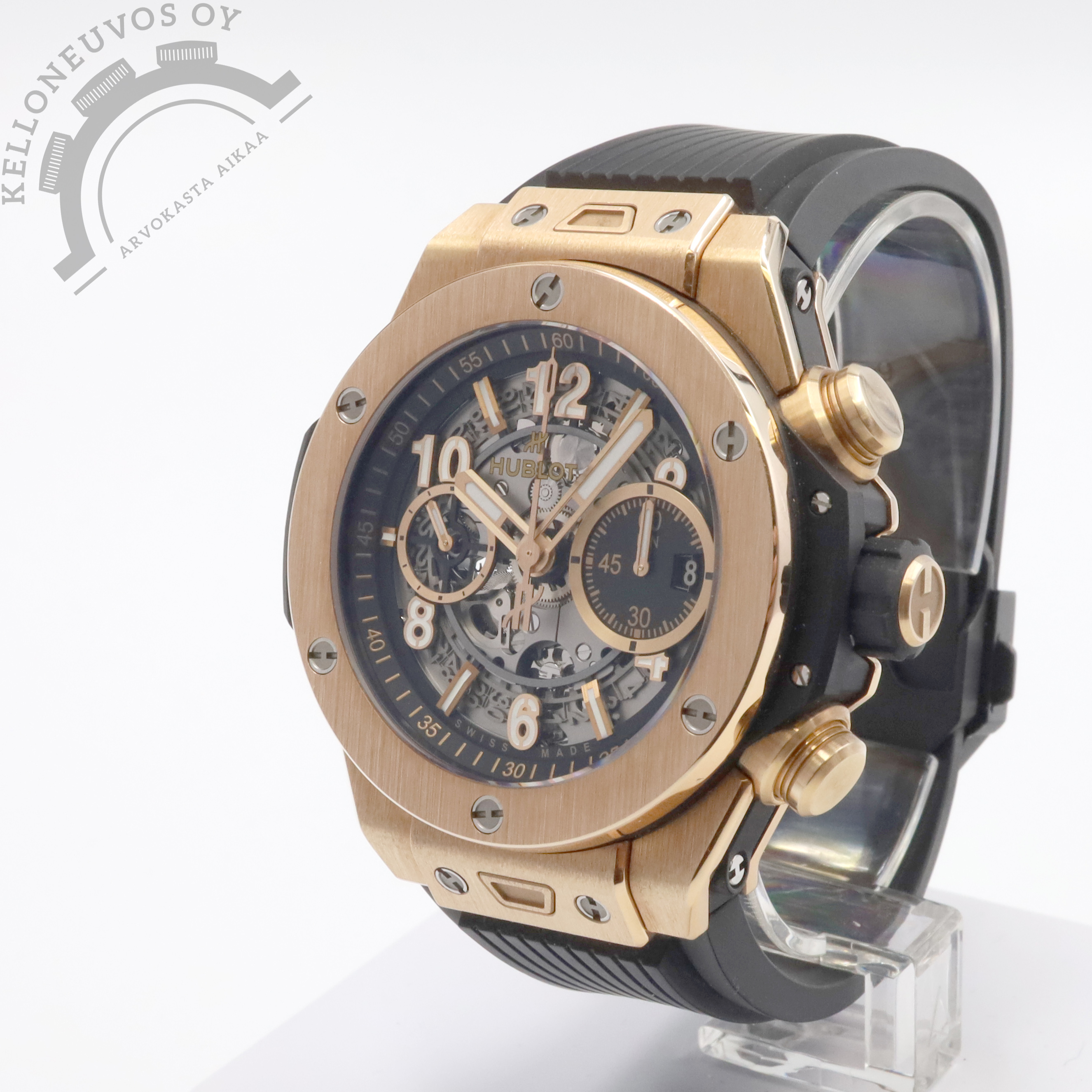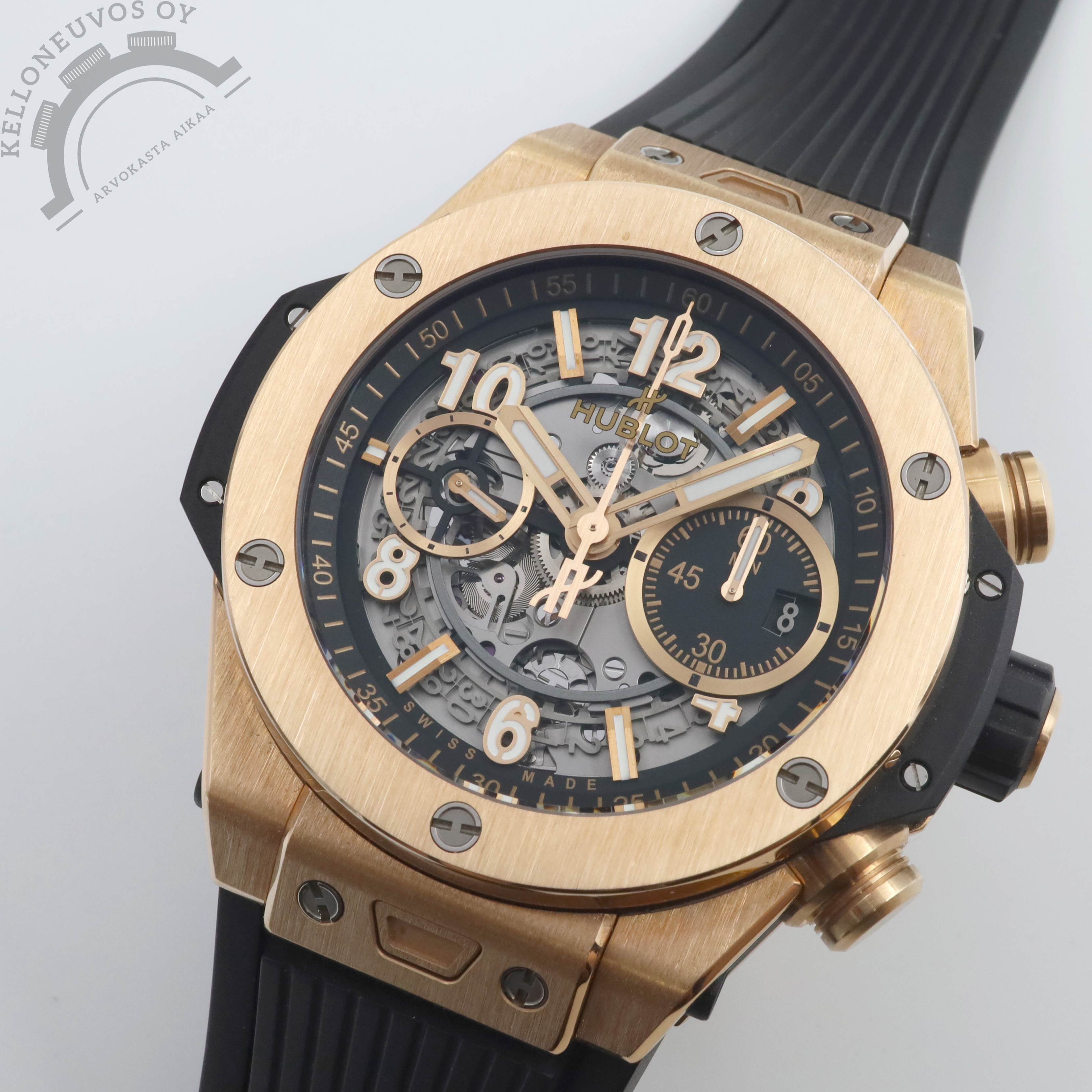 Nyt -50% Ovh:sta ja takuulla hintaan josta et muualta löydä! Tarjolle tajuttoman upea sekä silmiinpistävän näyttävä Hublot Big Bang Unico King Gold. Älyttömän hienolla skeleton taululla josta löytyy päivyri, ajanotto, pikkusekunnit sekä kultaiset osoittimet ja indeksit. 18K Hublotin omasta King Gold materiaalista valmistettu kuori, kehä sekä nupit. Laadukas musta kumiranneke omalla linkkulukolla joka valmistettu PVD-pinnoitetusta titaanista ja 18K King Gold materiaalista kruunaavat kokonaisuuden. Safiirilasit molemmin puolin runkoa, takakannen läpi pääset ihastelemaan hienosti viimeisteltyä Hublotin HUB1280 UNICO Flyback- automaattikonistoa jossa 72h käyntivara. Kyseessä on täys setti ja kellon e-warranty on aktivoitu 6/2022. Kunnoltaan tämä yksilö on lähes virheetön. Kellon ovh. 48 300e joten tästä huippuhienoa jalometallia omaa rannetta koristamaan erittäin sopivasti.
