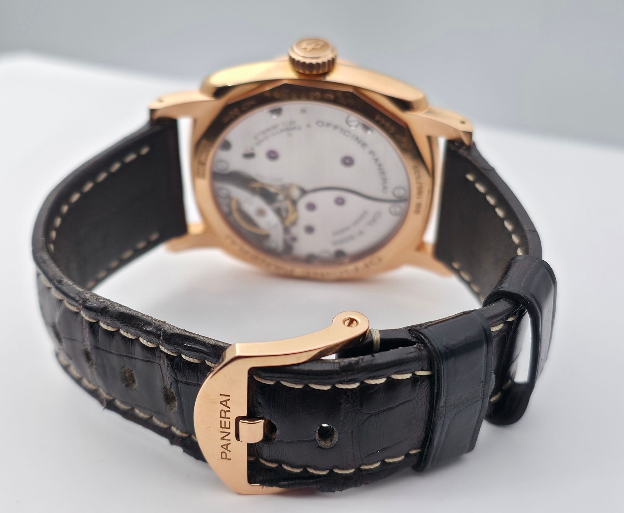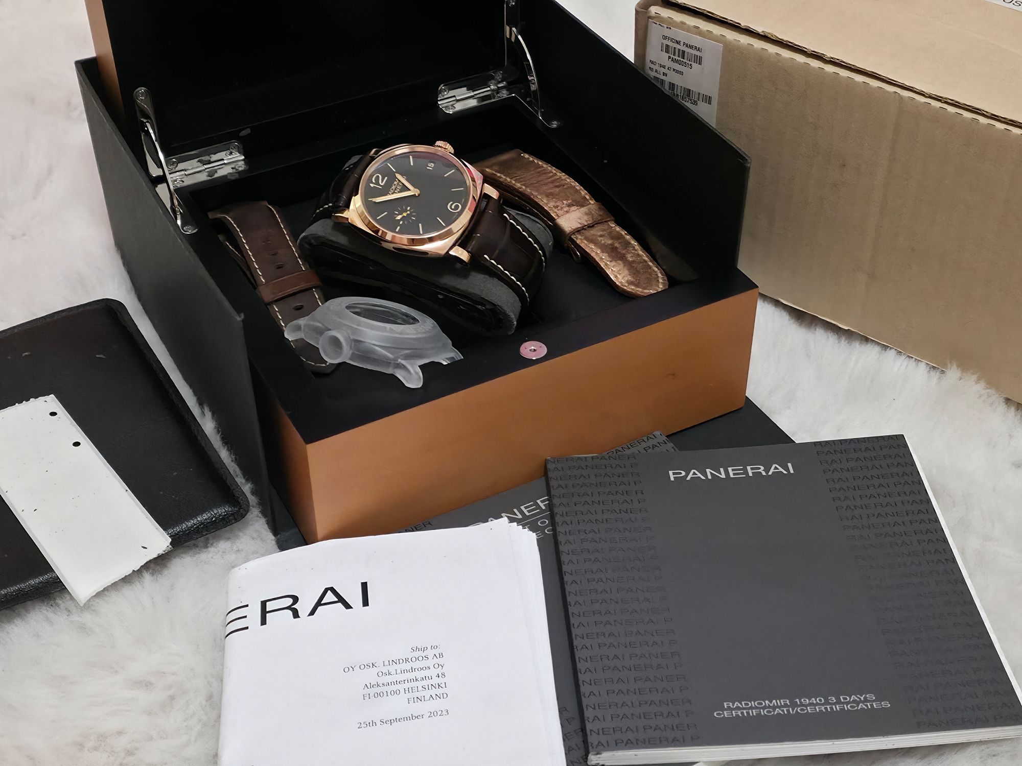 Erittäin näyttävä Panerai Radiomir 1940 18k punakultaisena. Suurikokoinen, mutta hyvin istuva 47mm kuori yhdistettynä Radiomir 1940 -mallin pehmeämpiin linjoihin tekee tästä elegantin mutta samalla vahvan kokonaisuuden. Manuaalivetoinen Panerain oma P.3000 -koneisto tarjoaa noin 3 päivän käyntivaran. Fullset 03/2015 (kaksi Panerain nahkaa + tarvike nahka), Huollettu Lindroosilla 09/2023. Erittäin siistissä kunnossa.