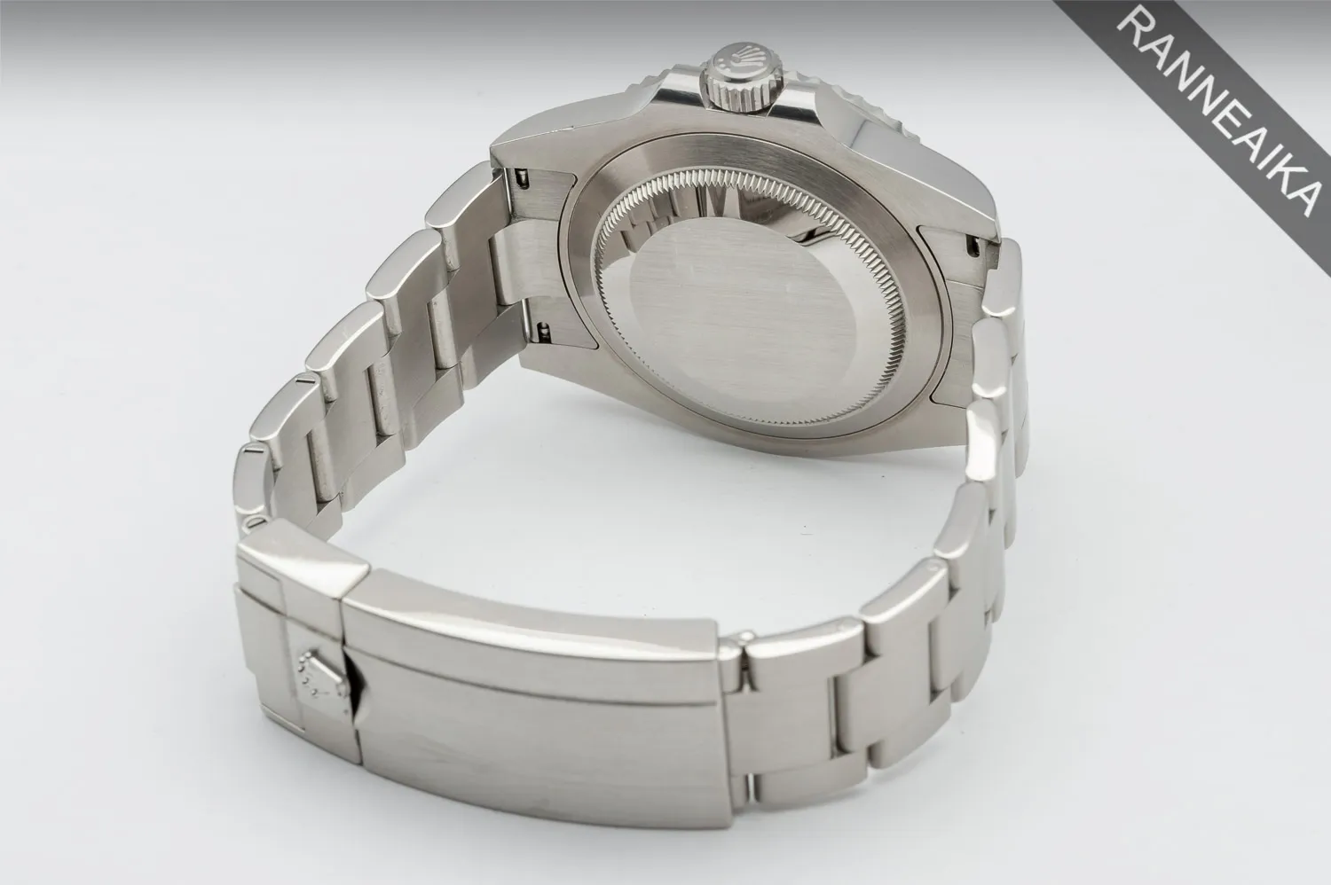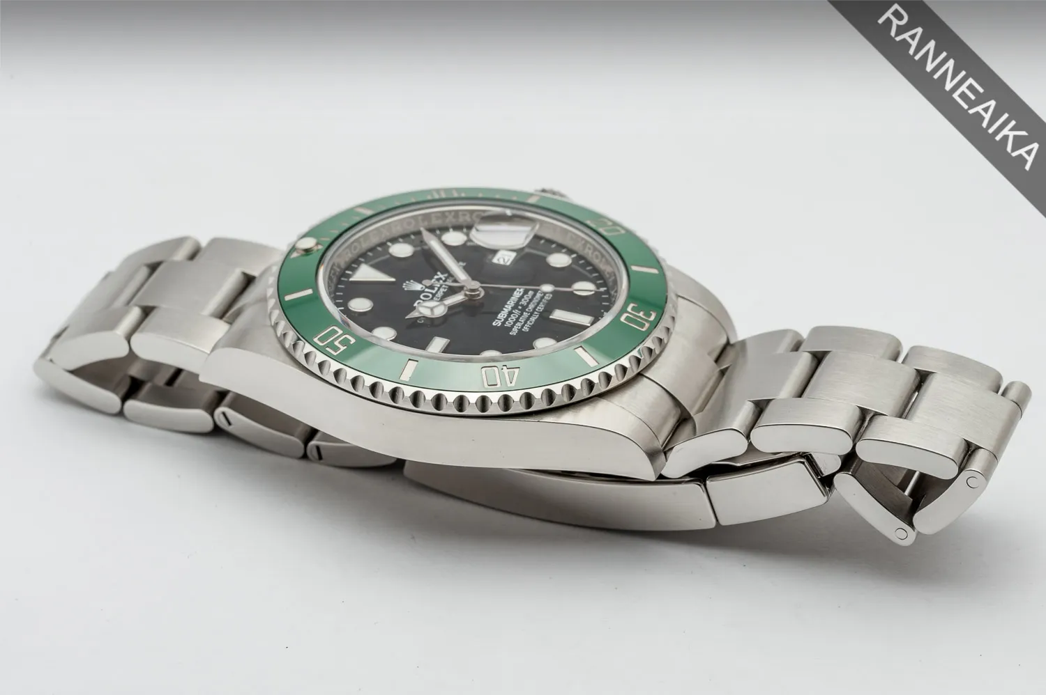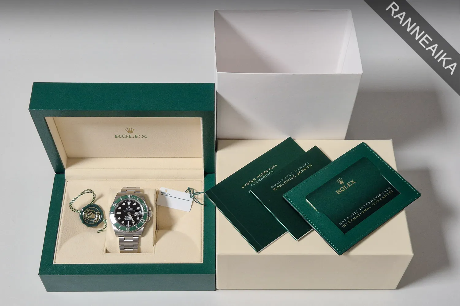 Todella haluttu vihreällä keraamisella kehällä sekä päivyrillä varustettu teräksinen klassikkodiver, jollainen tulisi löytyä jokaisen kelloharrastajan kokoelmasta. Kyseessä on viimeisin, syksyllä 2020 julkaistu malli erinomaiset mittasuhteet omaavalla linjakkaalla 41-millisellä kuorella sekä leveämmällä 21-millisellä rannekkeella. Tämä Hulkin korvannut malli tunnetaan myös ”Starbucks” -lempinimellä. Sisällä tikittää tarkasti uudistettu Rolex cal. 3235 -automaattikoneisto. Kellon paperit on päivätty 12/2022 ja valmistajan 5v takuu on voimassa 12/2027 asti. Täysi setti sisältäen kaikki alkuperäiset paperit, korttitaskun, kaikki rannekkeen palat, molemmat hang tagit sekä molemmat laatikot + kartonkisen suojahihan.